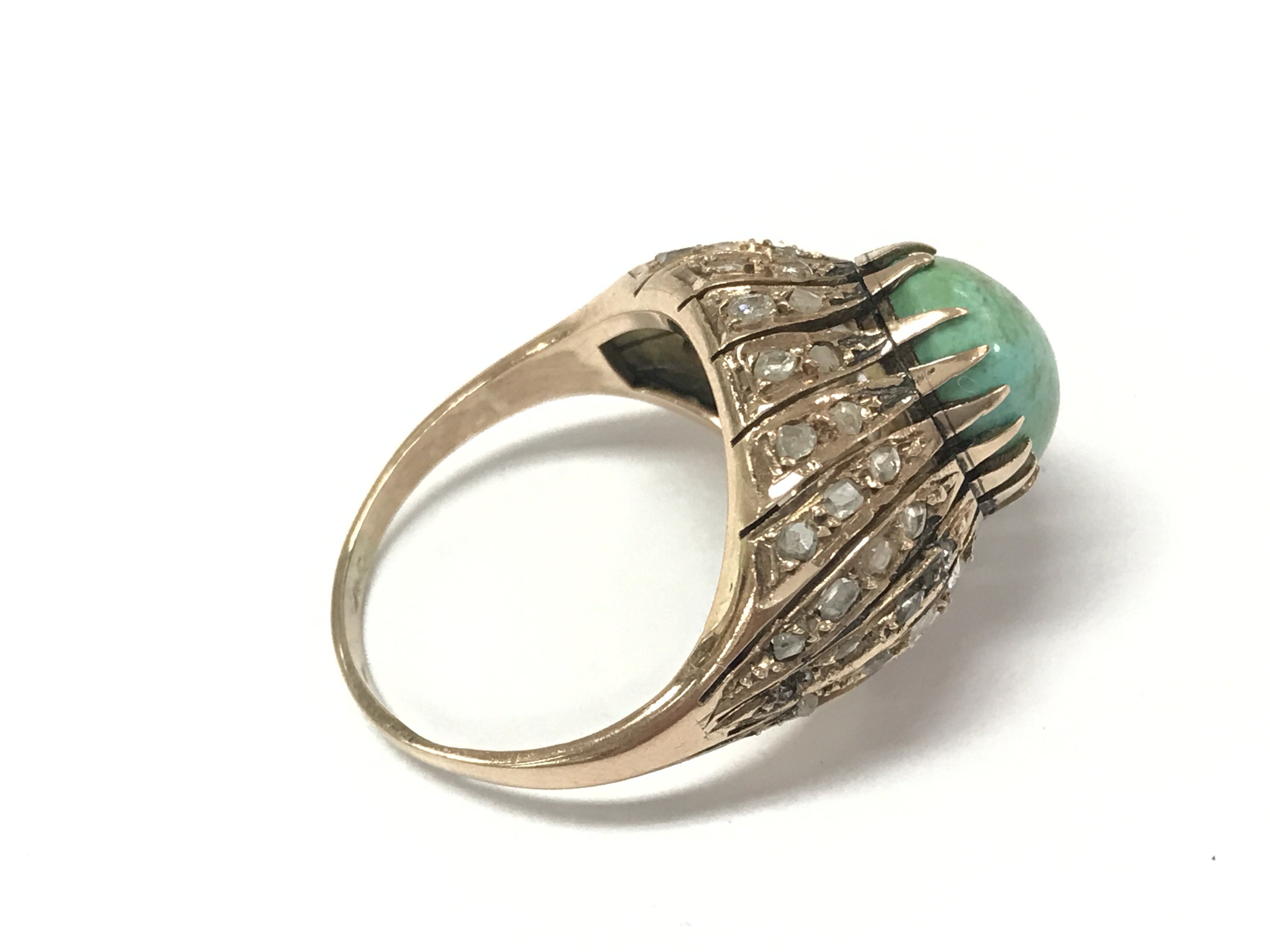A high carat yellow golf vintage cocktail ring set with a large turquoise and rose cut diamonds. Size T