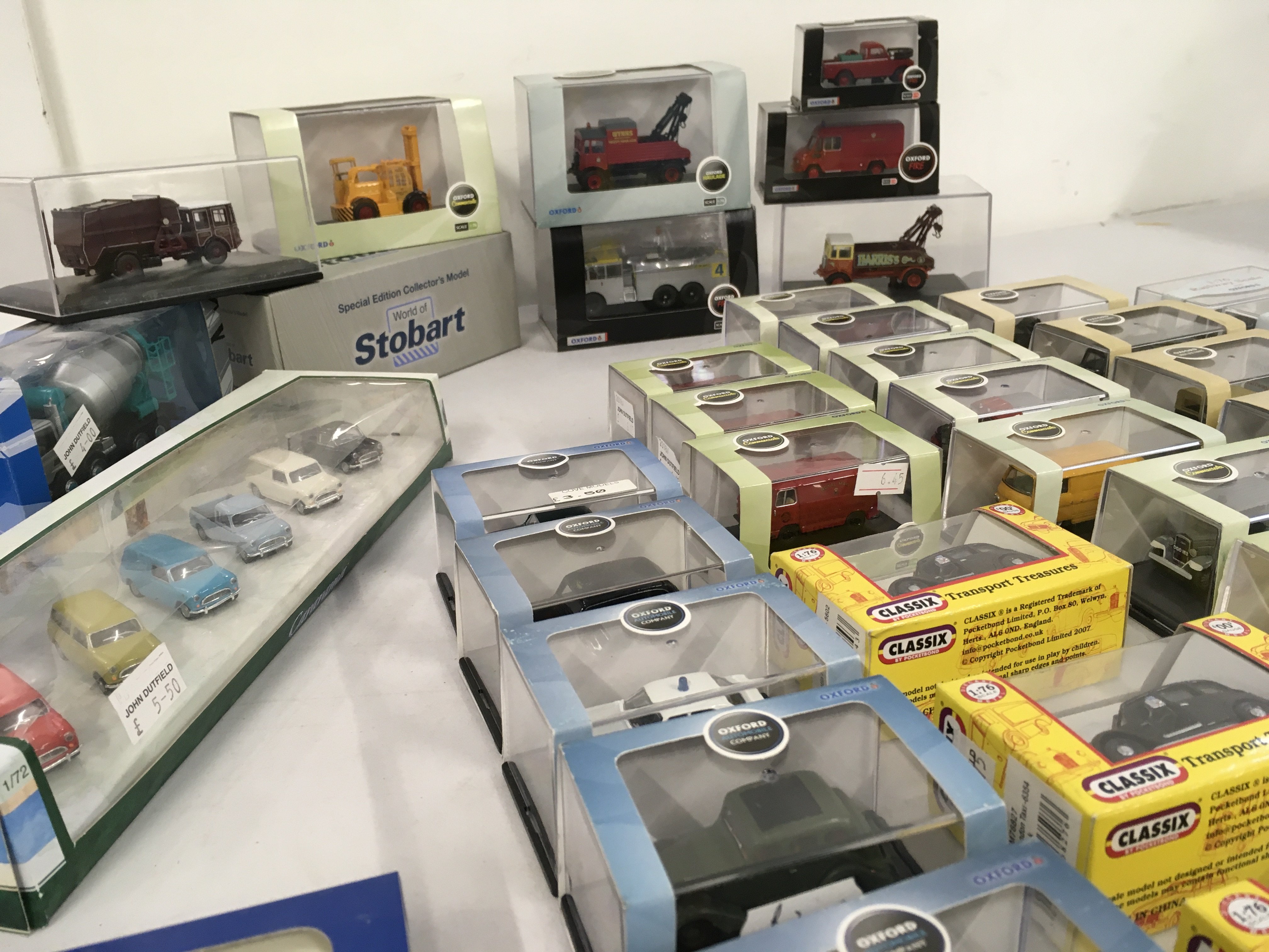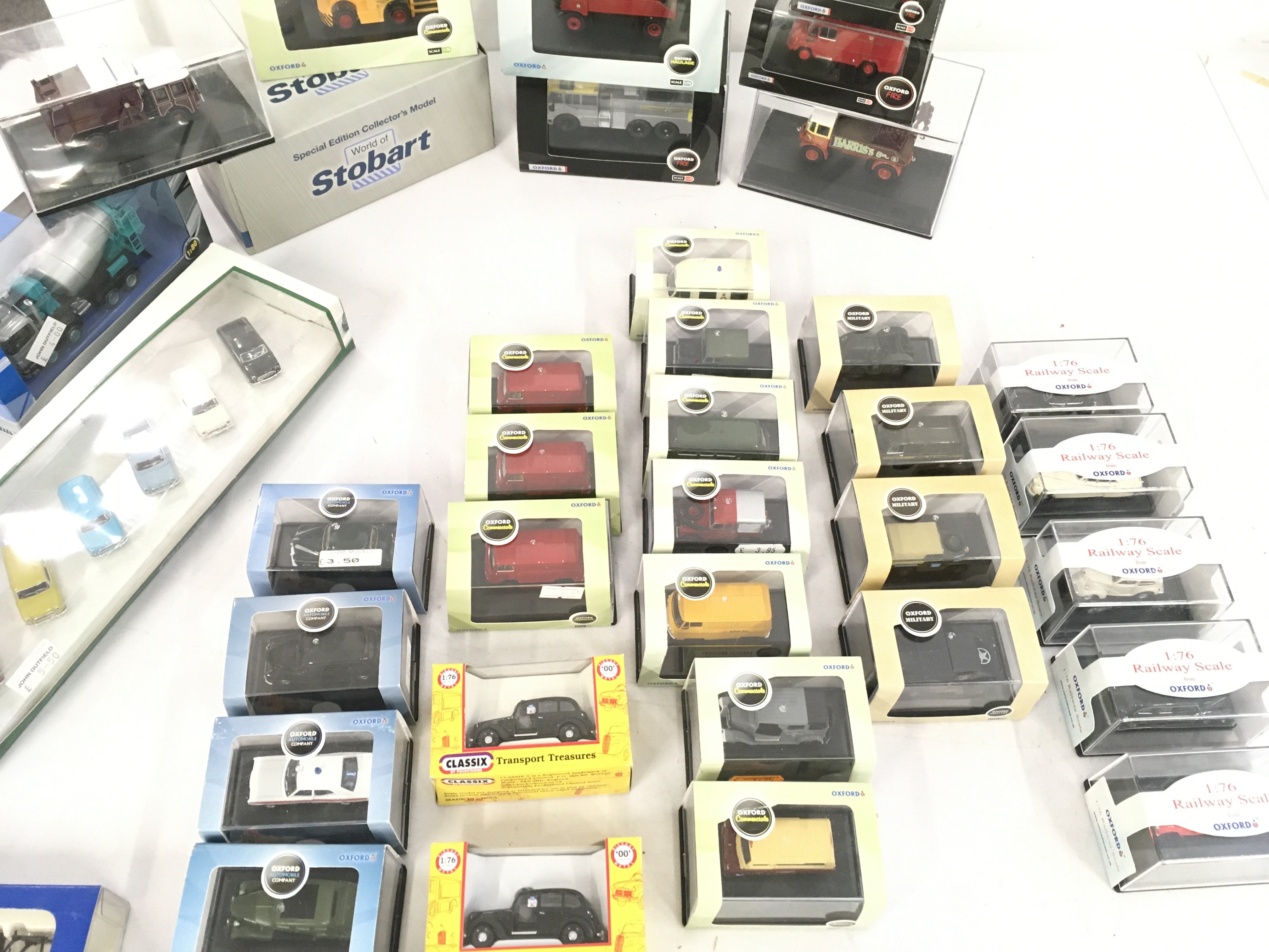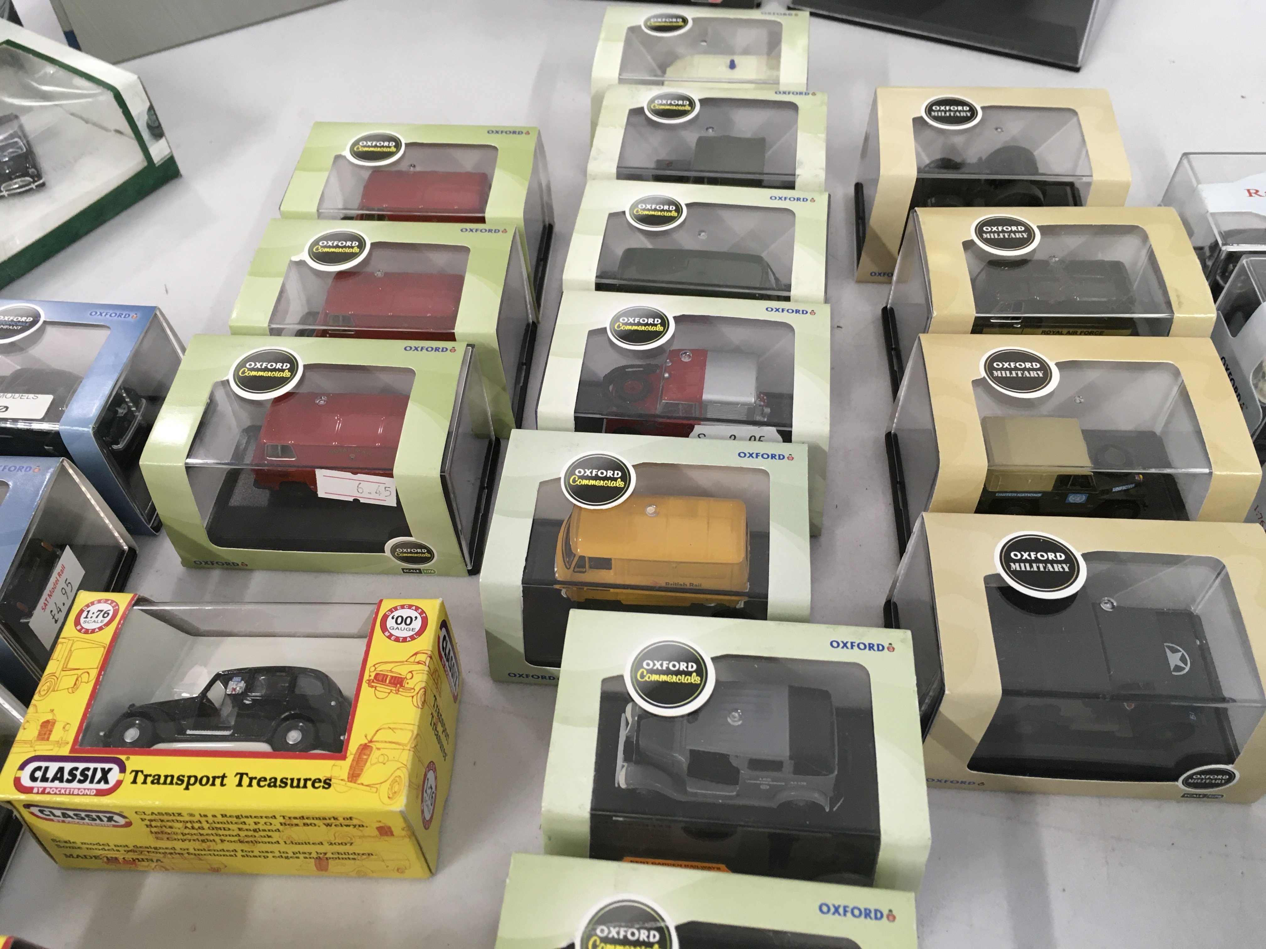 A collection of diecast model vehicles primarily by Oxford and mounted in display boxes. No reserve