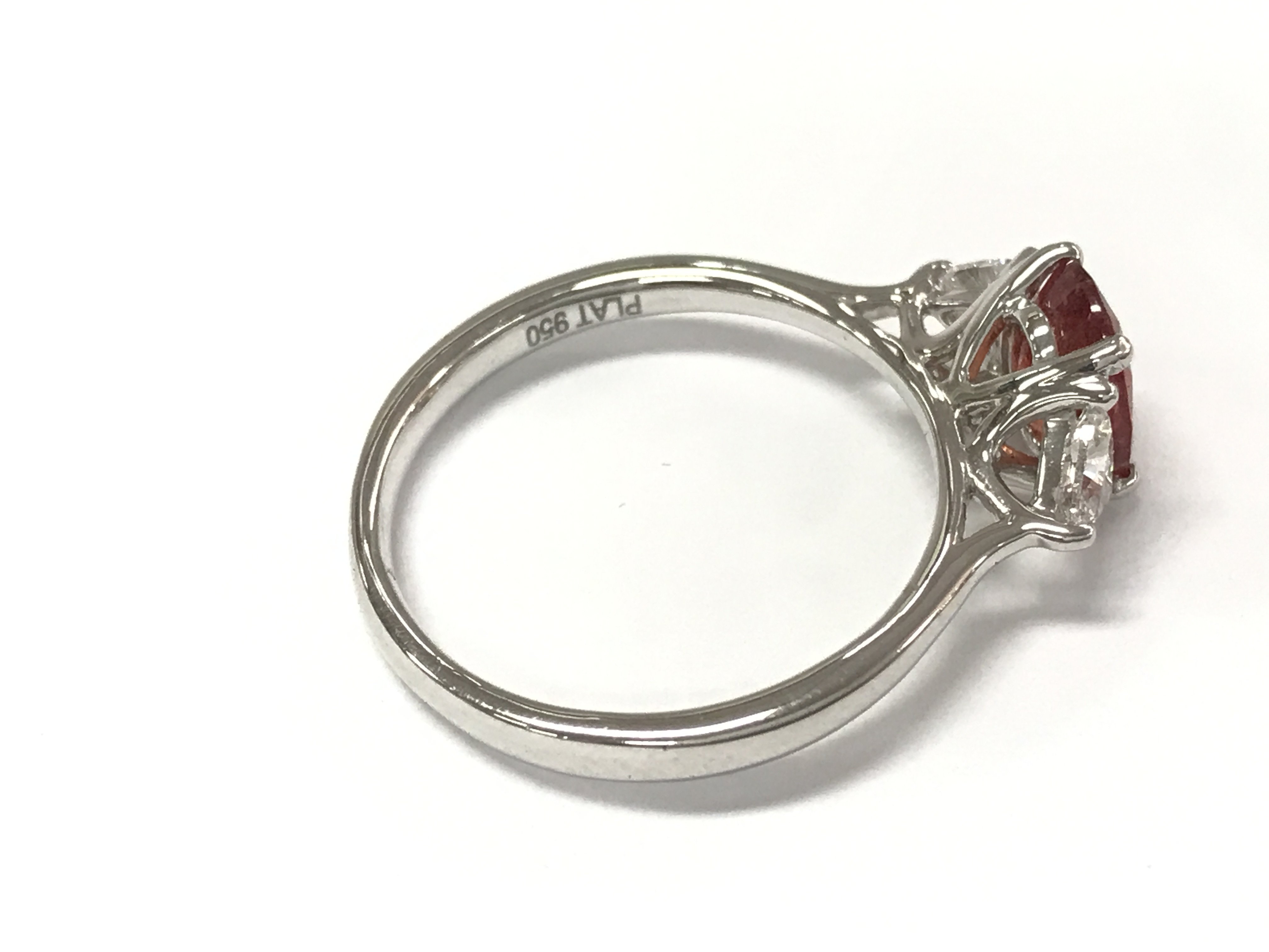 Platinum trilogy ring set with a central oval orange sapphire flanked by diamonds. Sapphire 1.37ct and diamonds 0.37ct. Size N