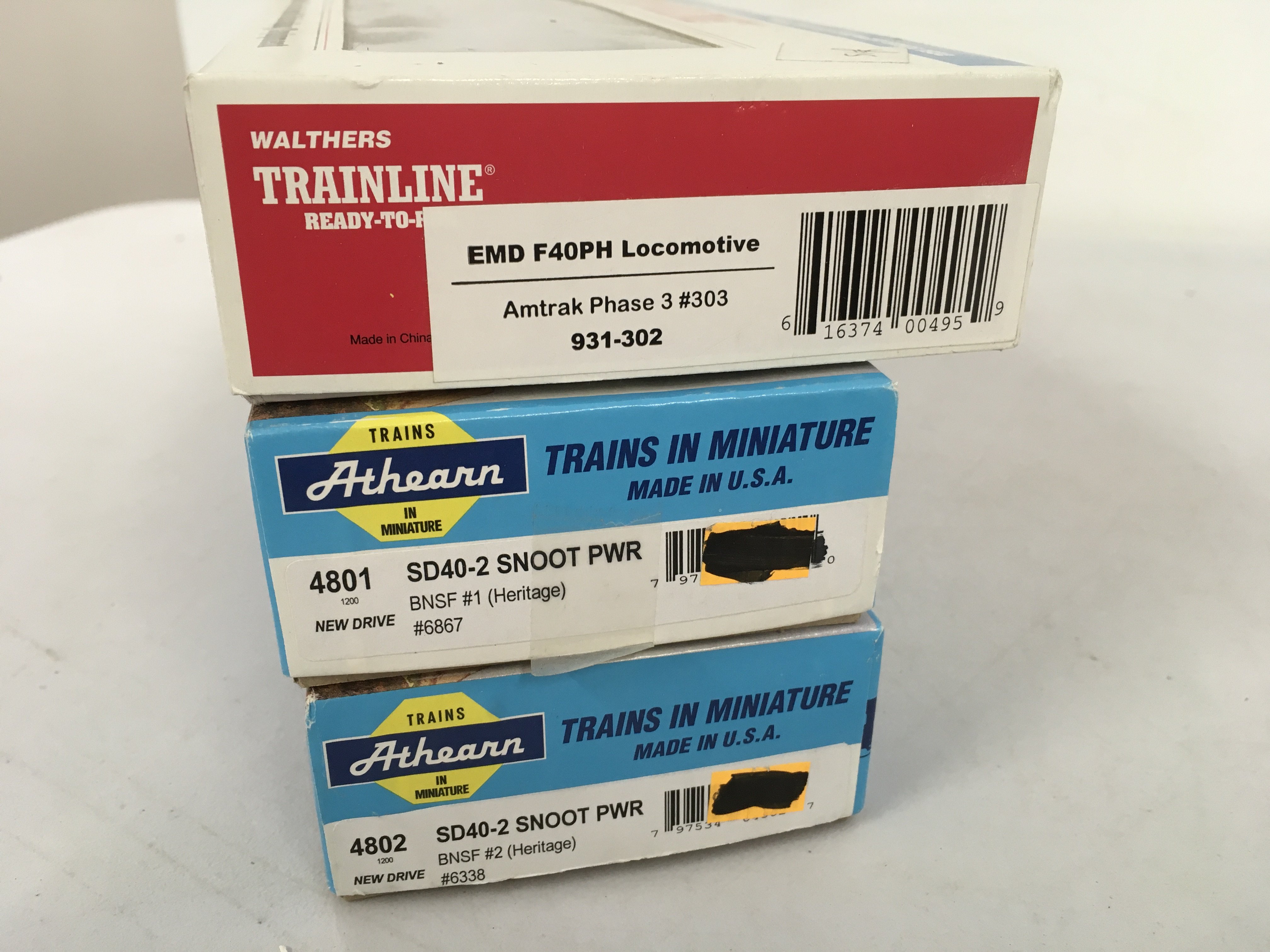 3x boxed HO gauge model railway locomotives includes Walthers EMD F40PH and Athearn 4802 .. 4801. No reserve