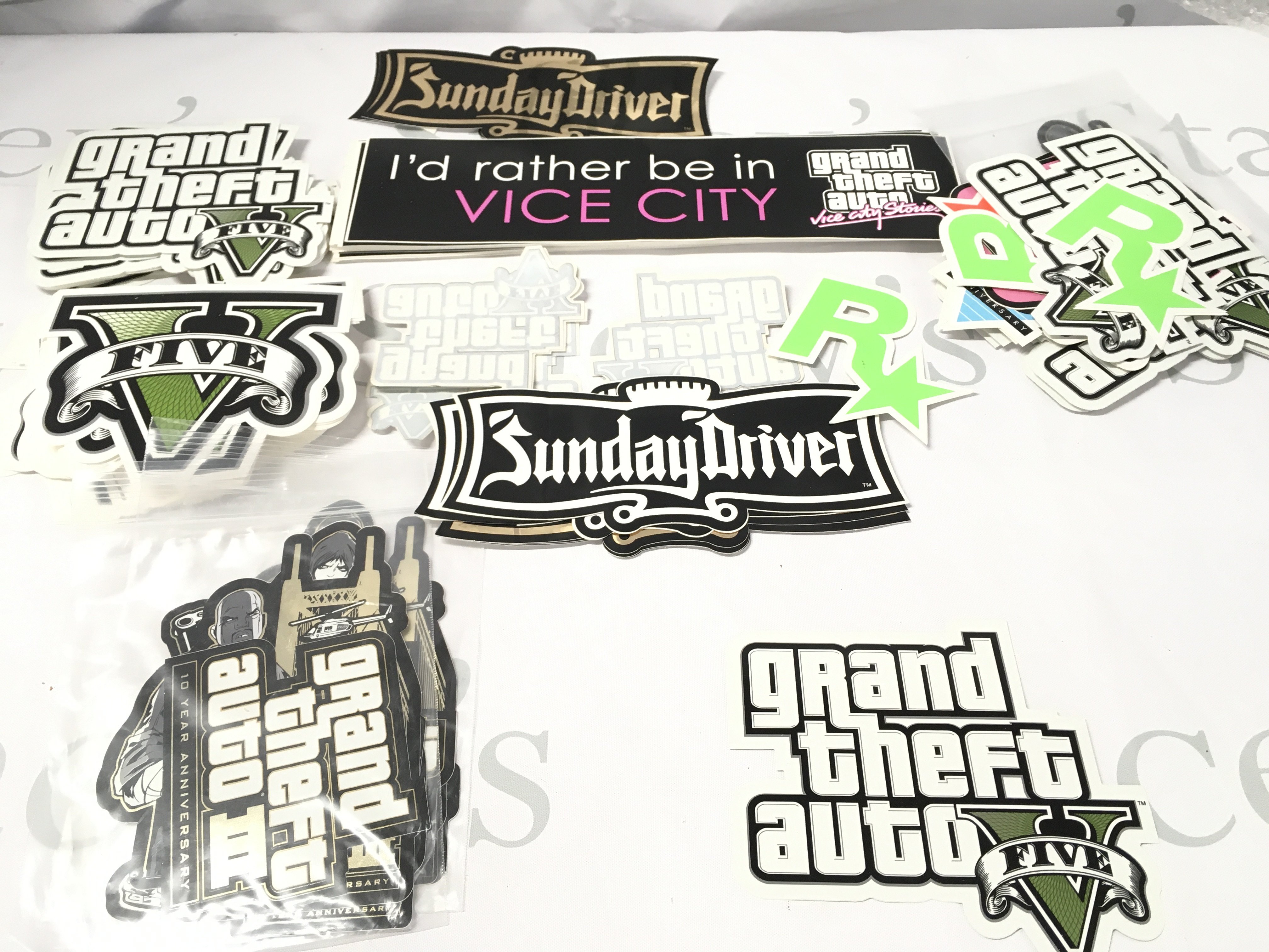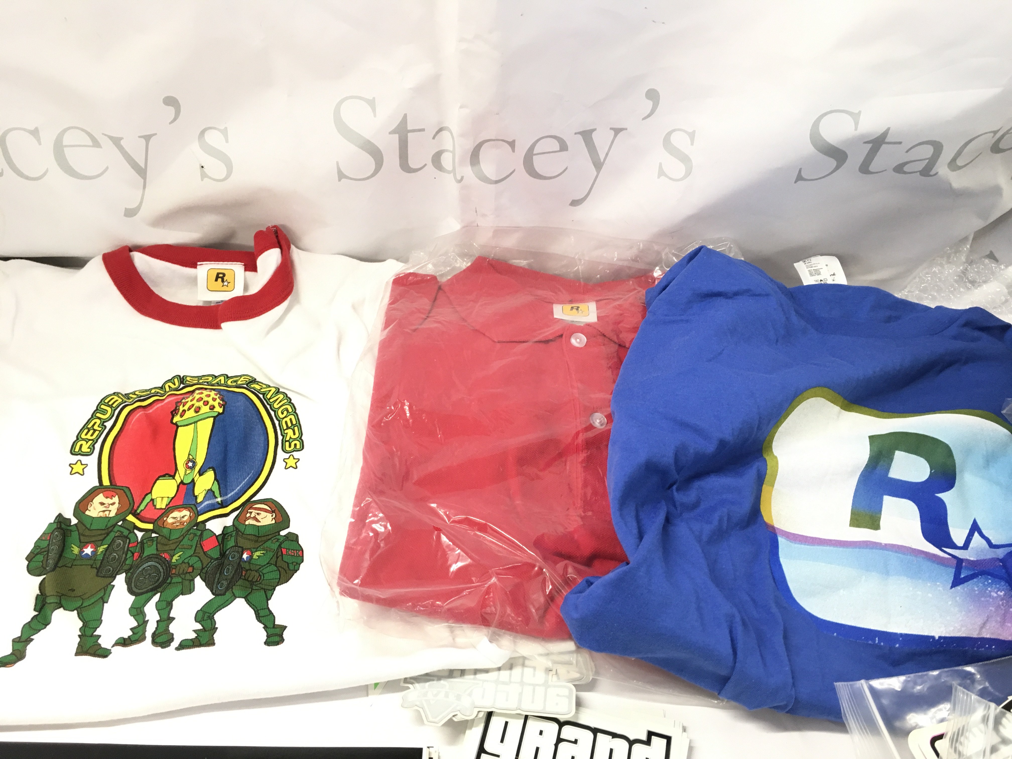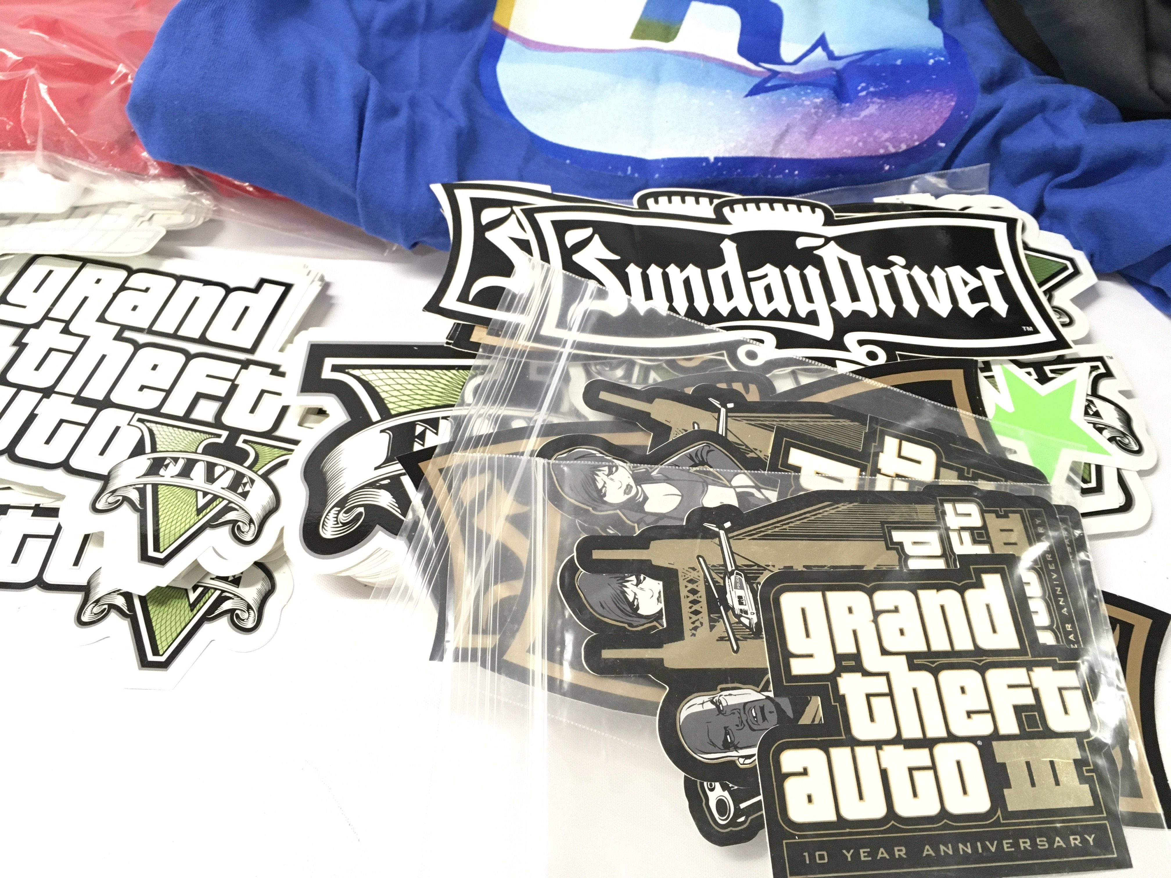 A Collection of Rock Star Games Grand Theft Auto Promotional Items Including Stickers. T-Shirts. Caps. Pin Badges. Etc.