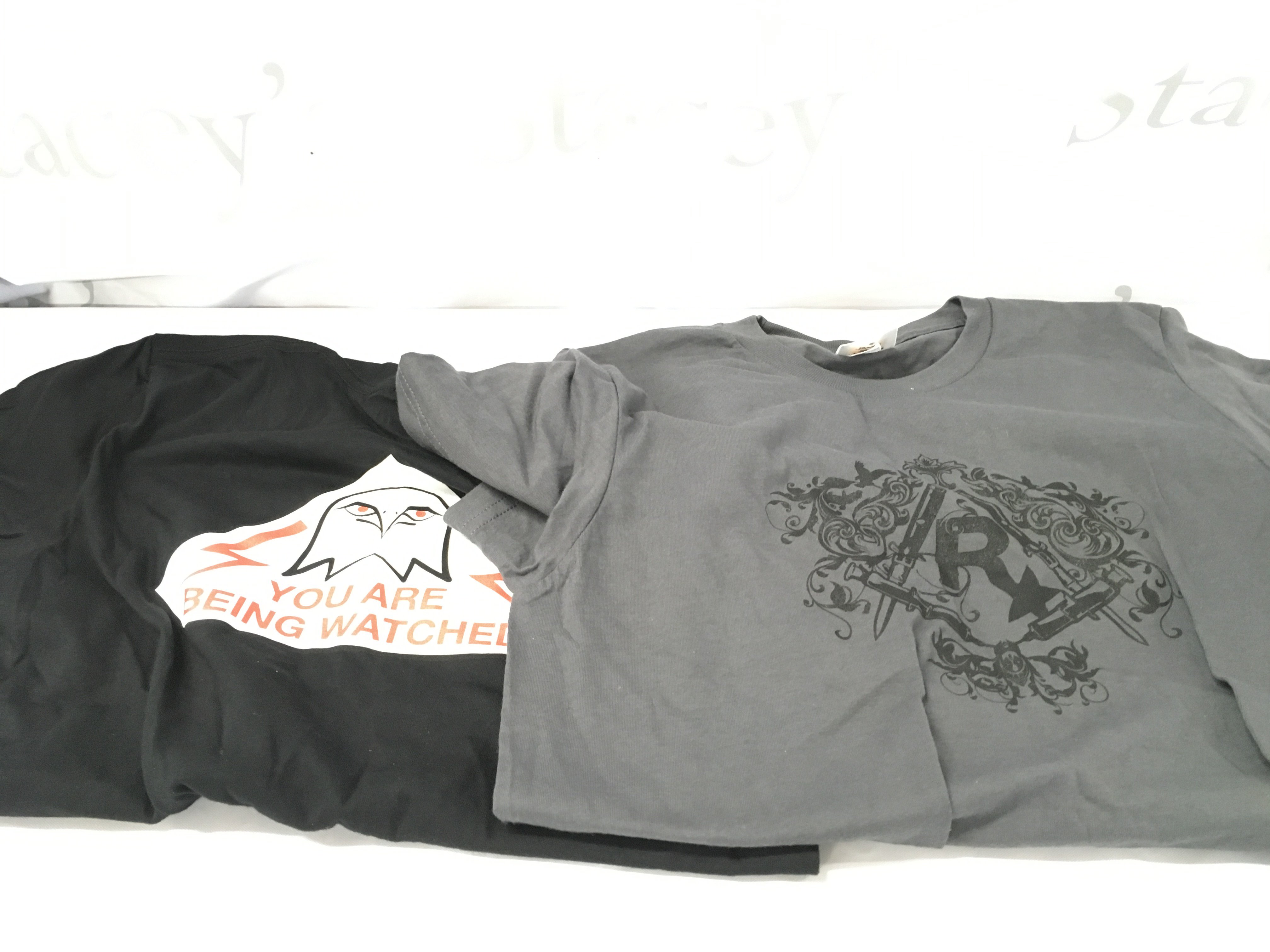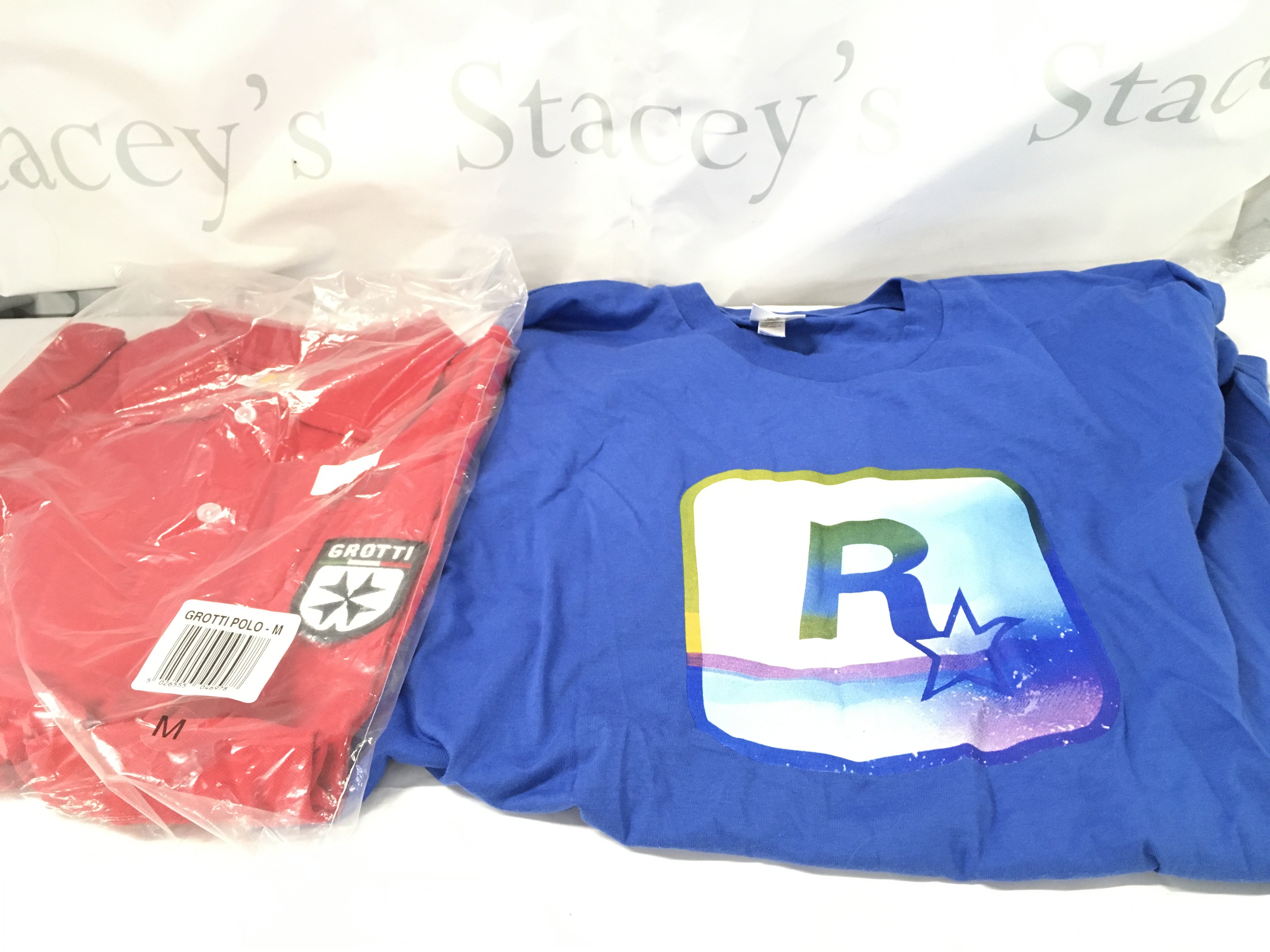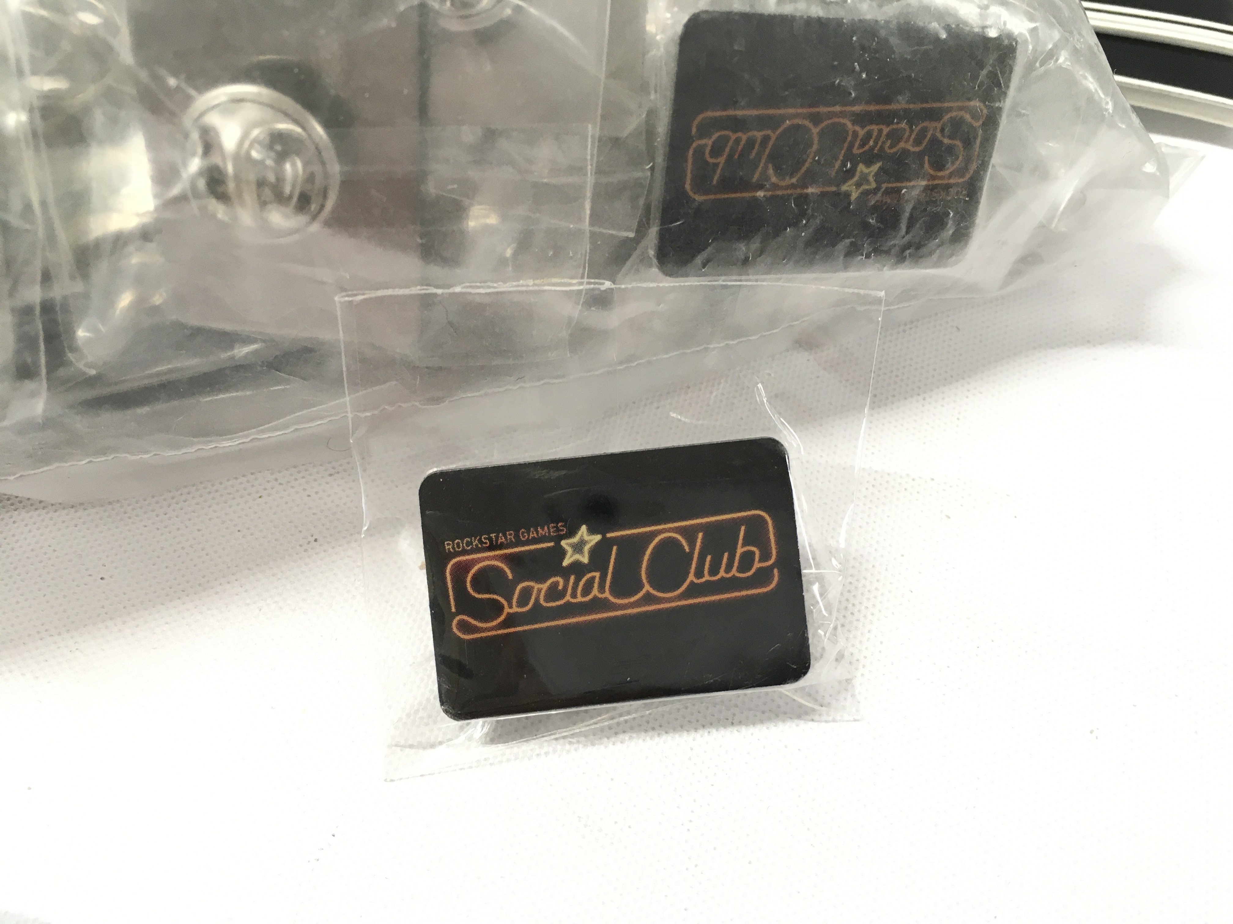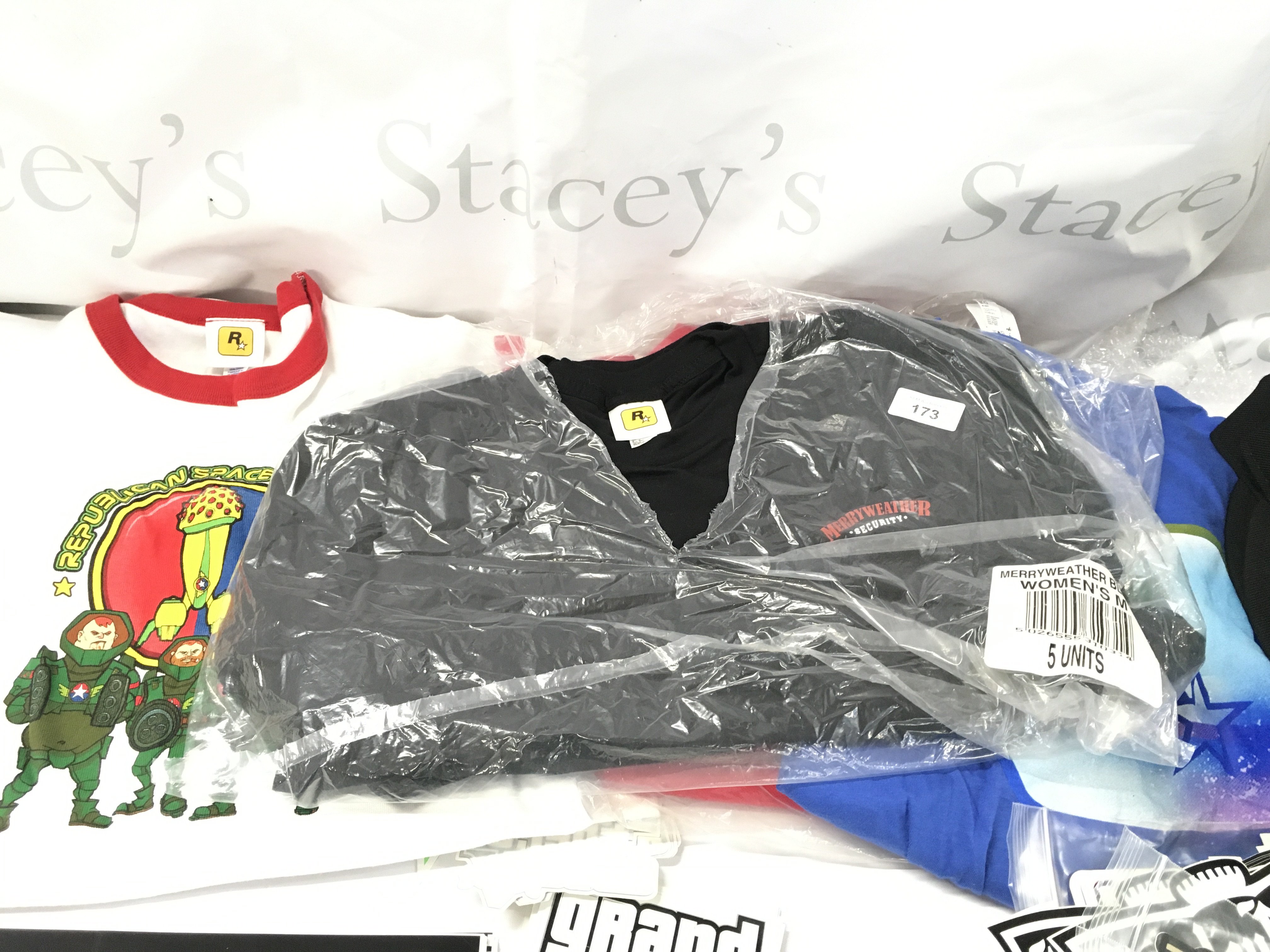 A Collection of Rock Star Games Grand Theft Auto Promotional Items Including Stickers. T-Shirts. Caps. Pin Badges. Etc.