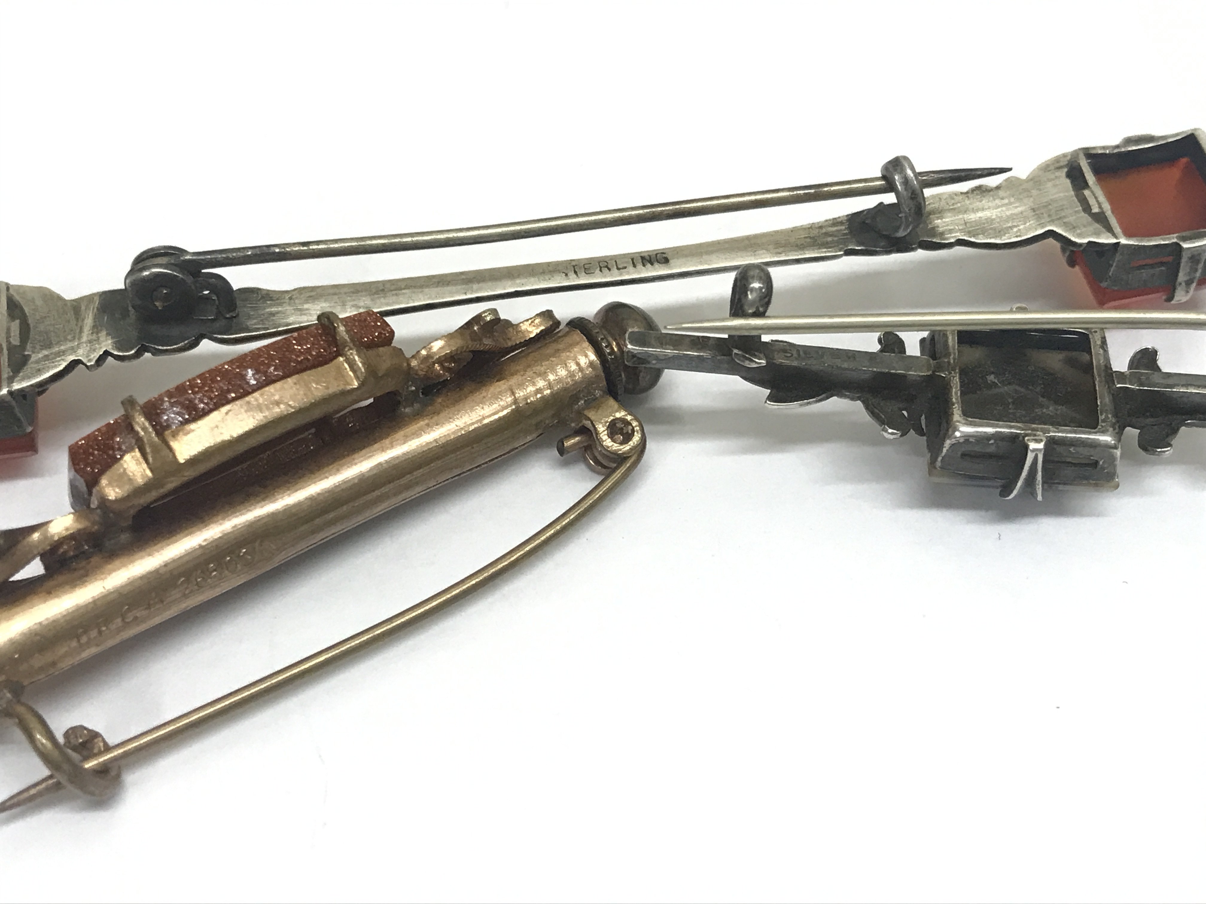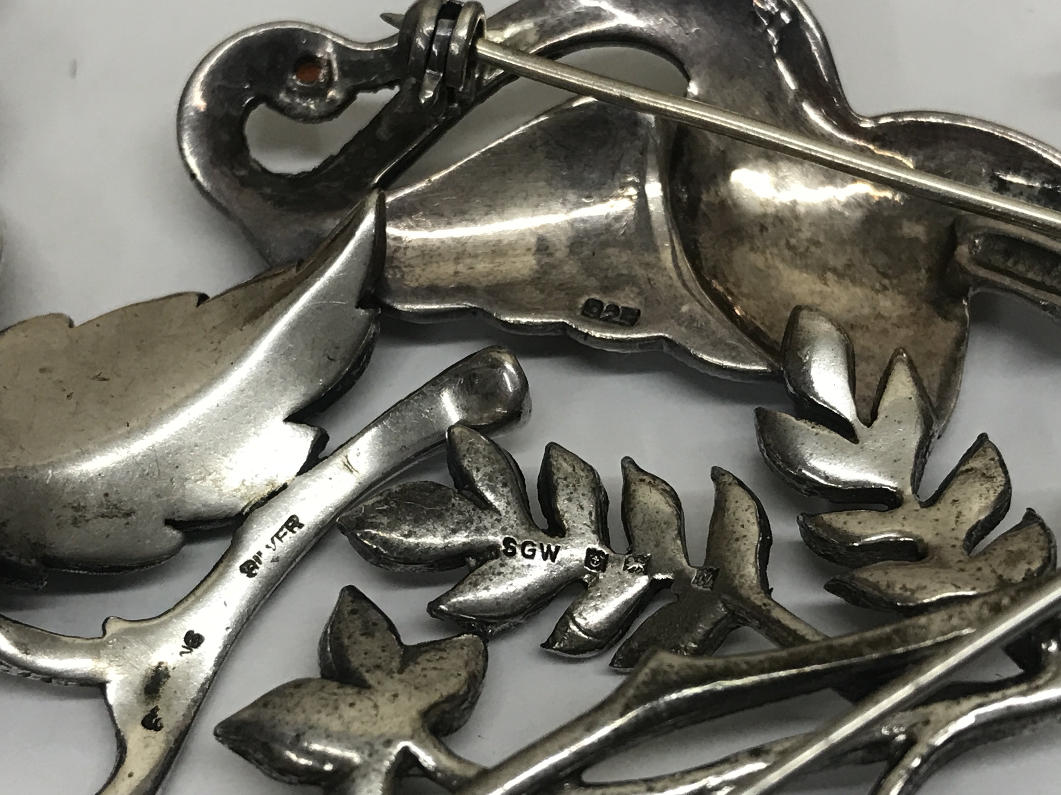 Vintage 3 silver and marcasite brooches, gold stone brooch, silver agate cloak bar brooch, silver agate brooch. Postage category A