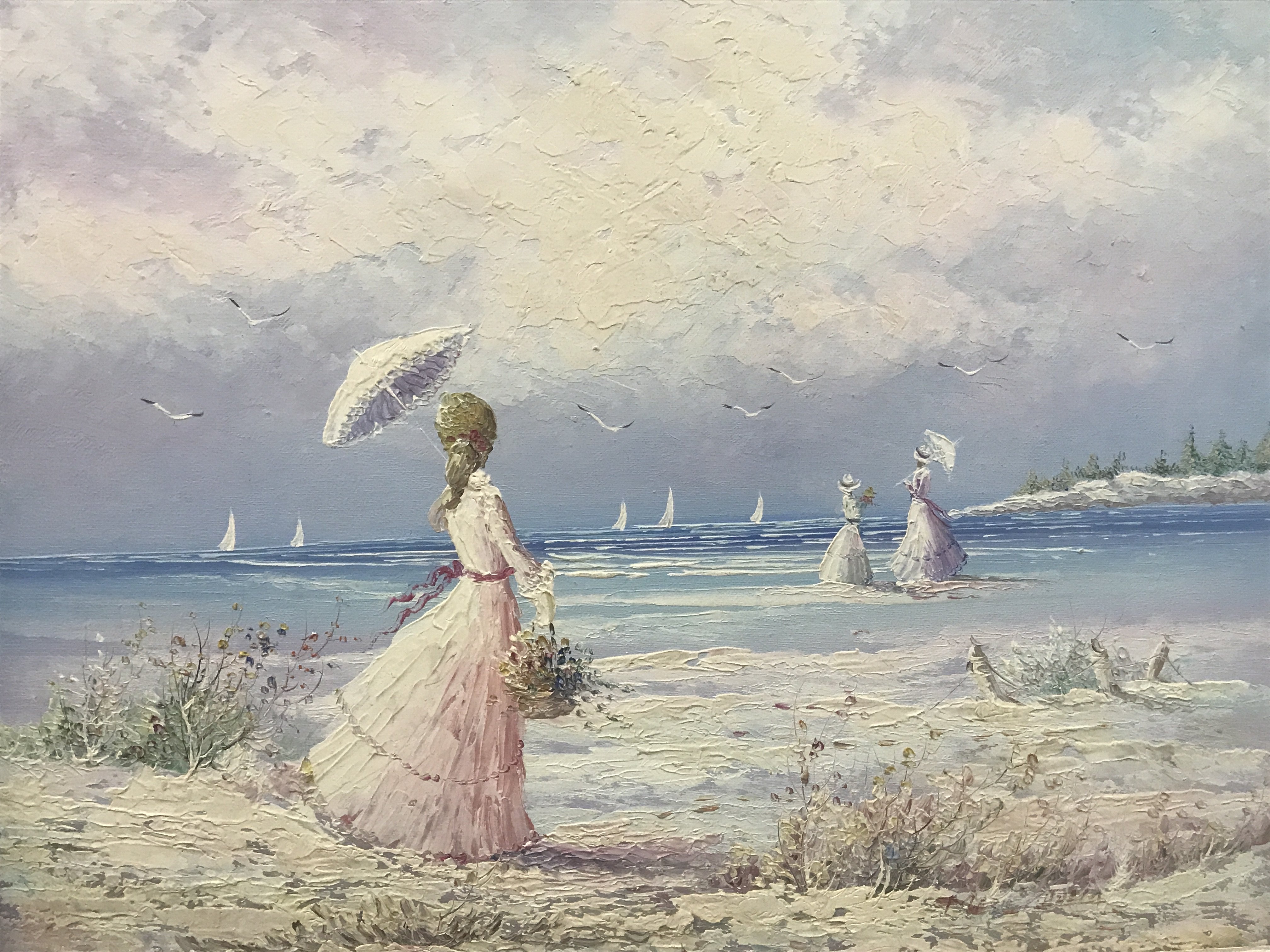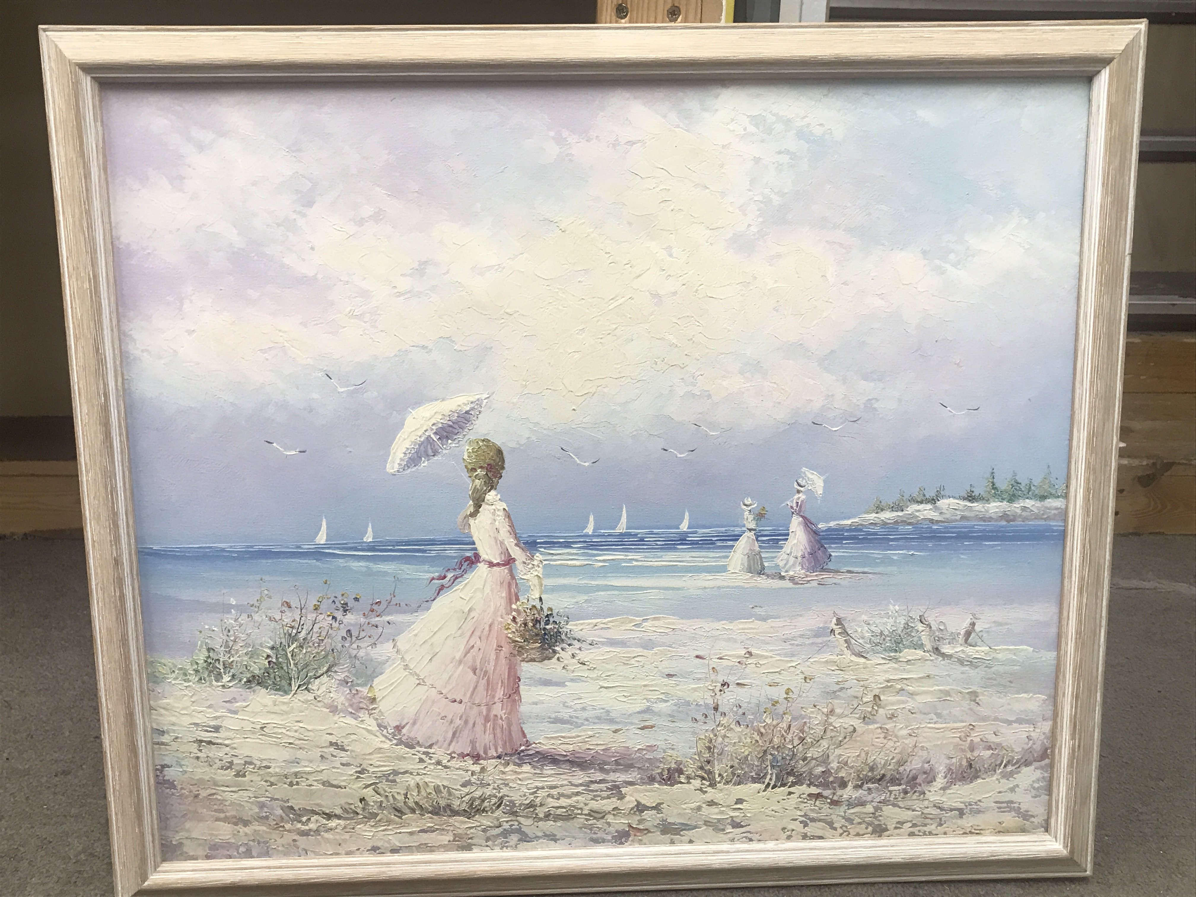 A mid 20th century style framed French Impressionist oil on canvas painting of a lady at a beach signed Marie Charlot , dimensions 46x66cm