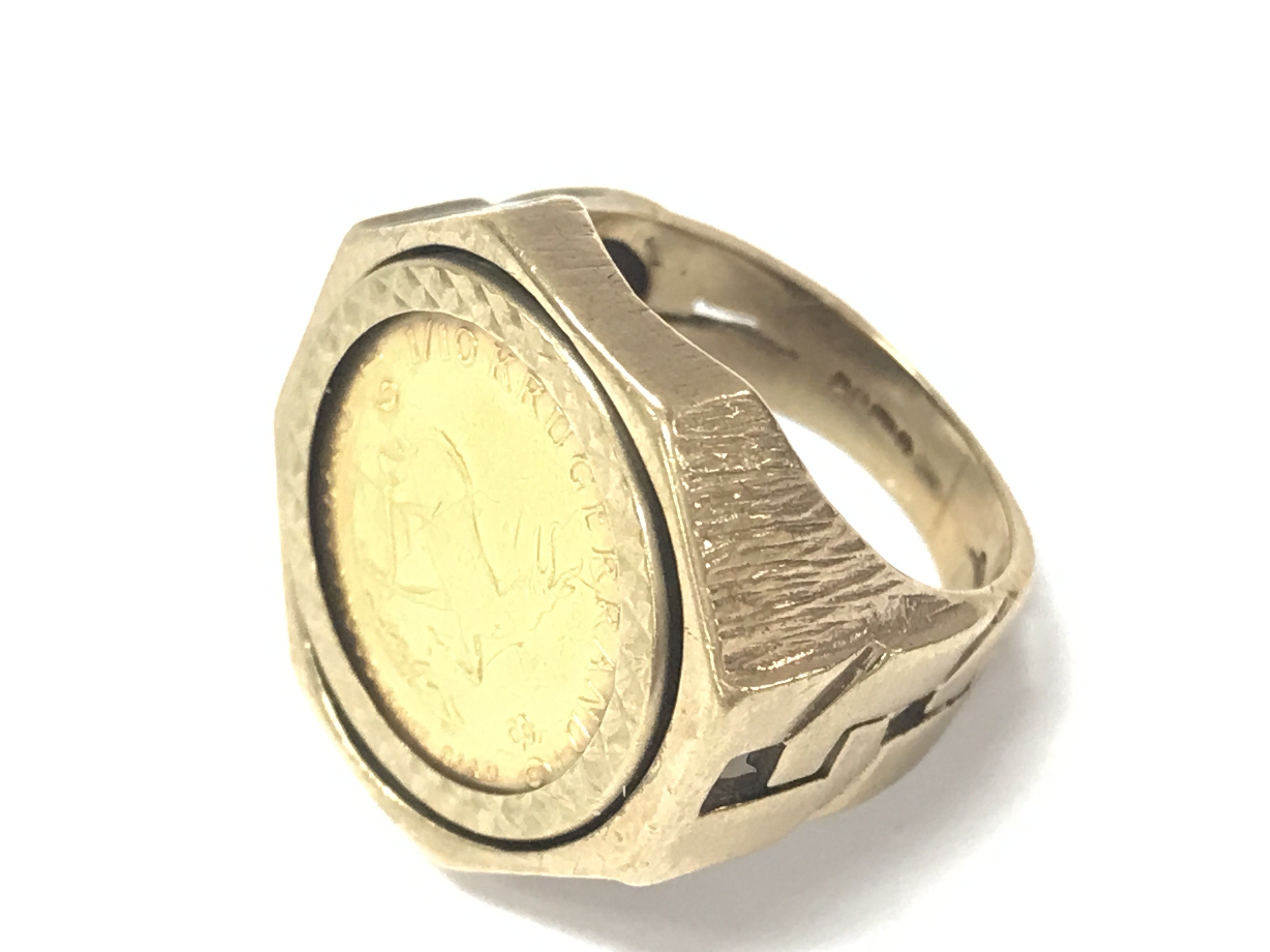 A 9ct gold ring set with a 1/10oz 1986 Krugerrand. Size J 1/2 and 9.29g