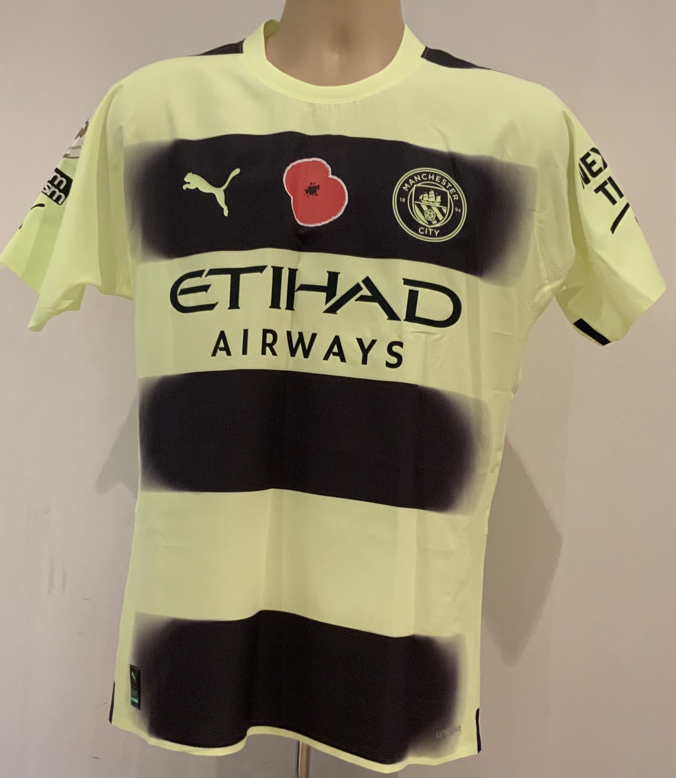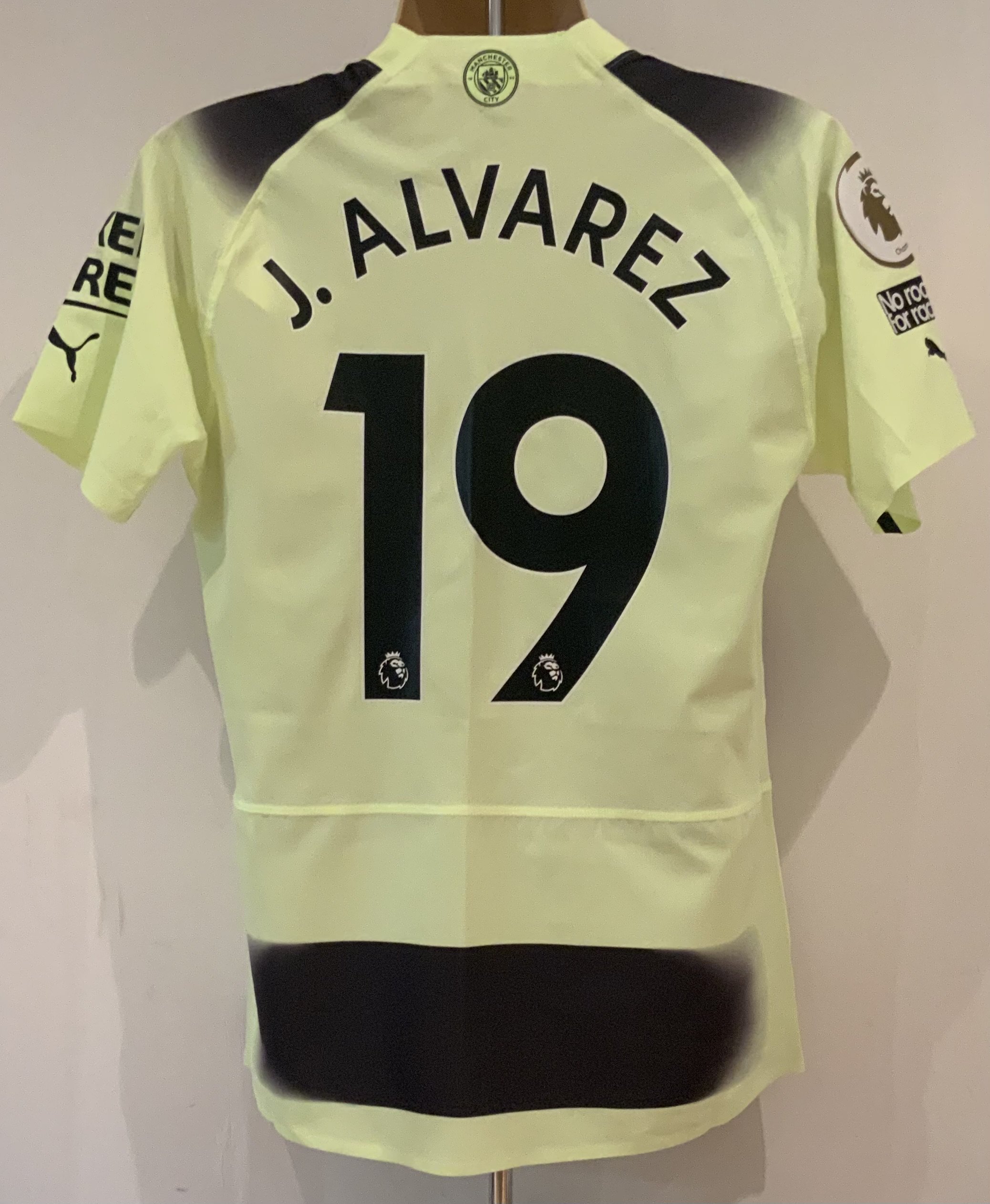 Manchester City 2022 - 2023 Match Issued PoppyFootball Shirt: Issued to Alvarez v Leicester. Full details with online pictures.
