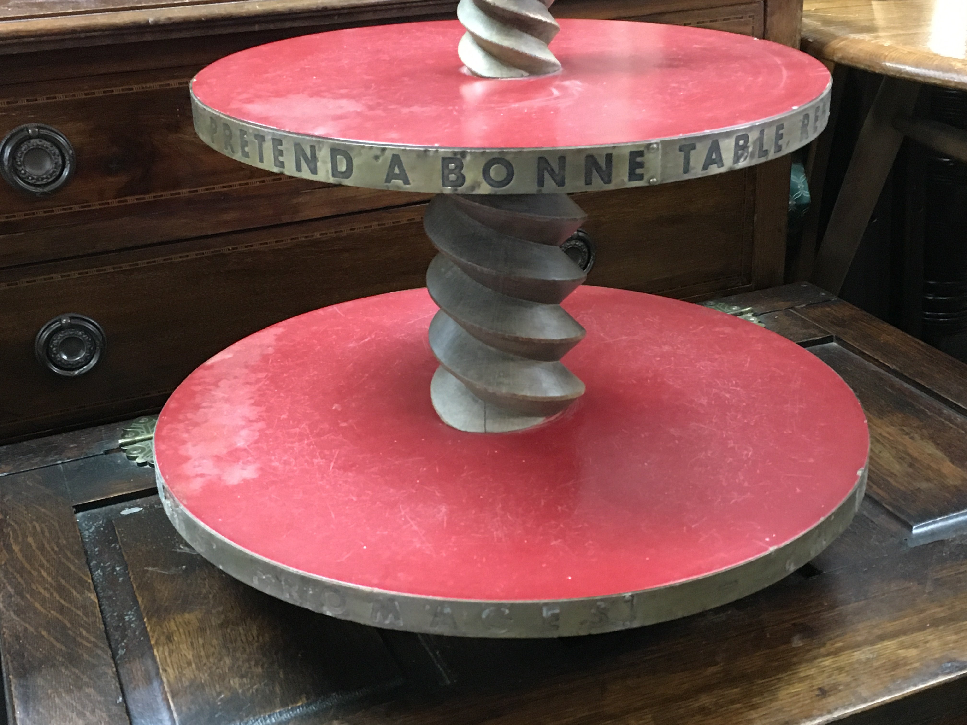 A vintage French Confrerie Nationale competition cheese display stand with interesting engraving around sides- shameful be he who without cheese pretends to pay homage to a good table. 50cm tall