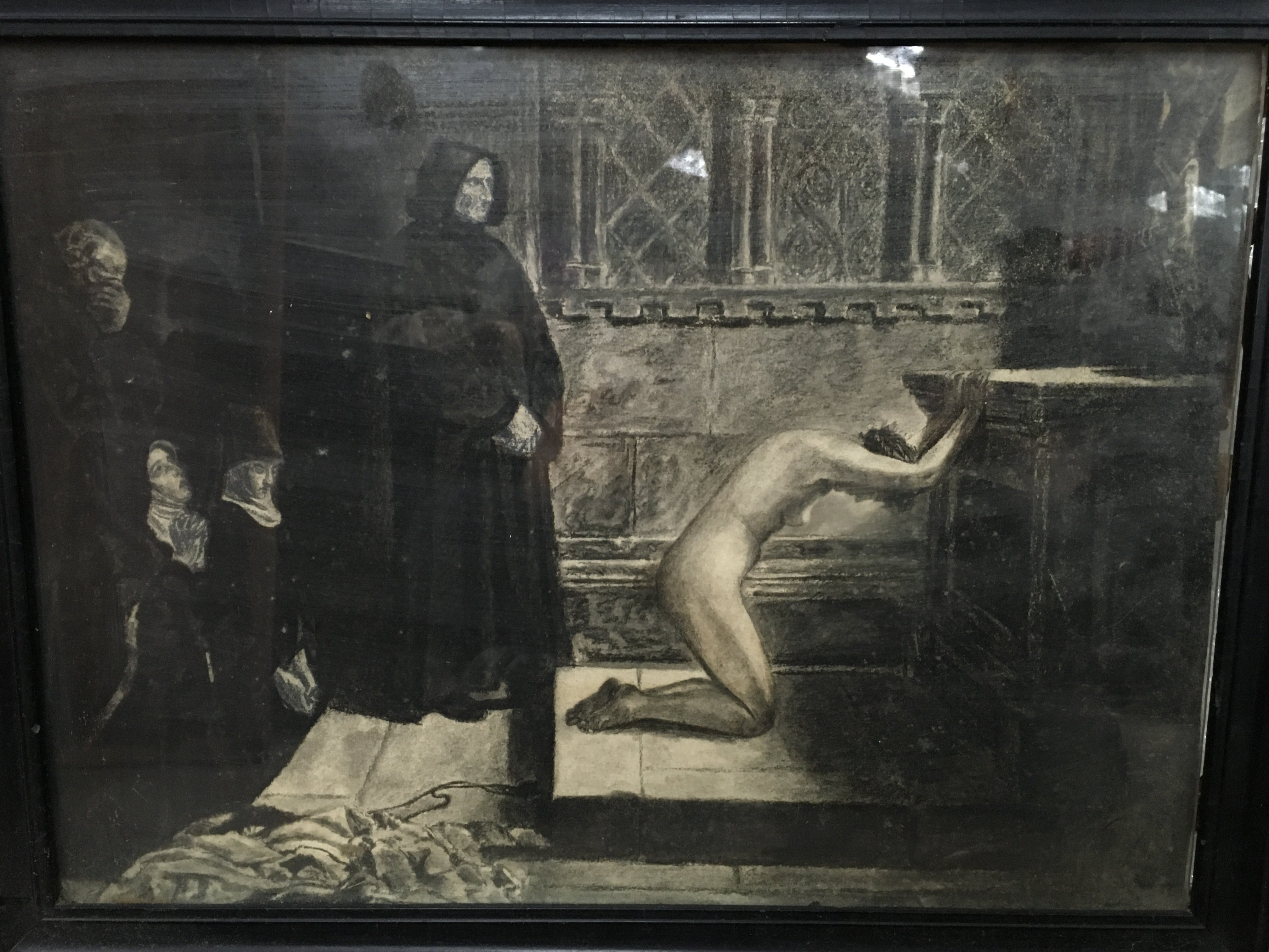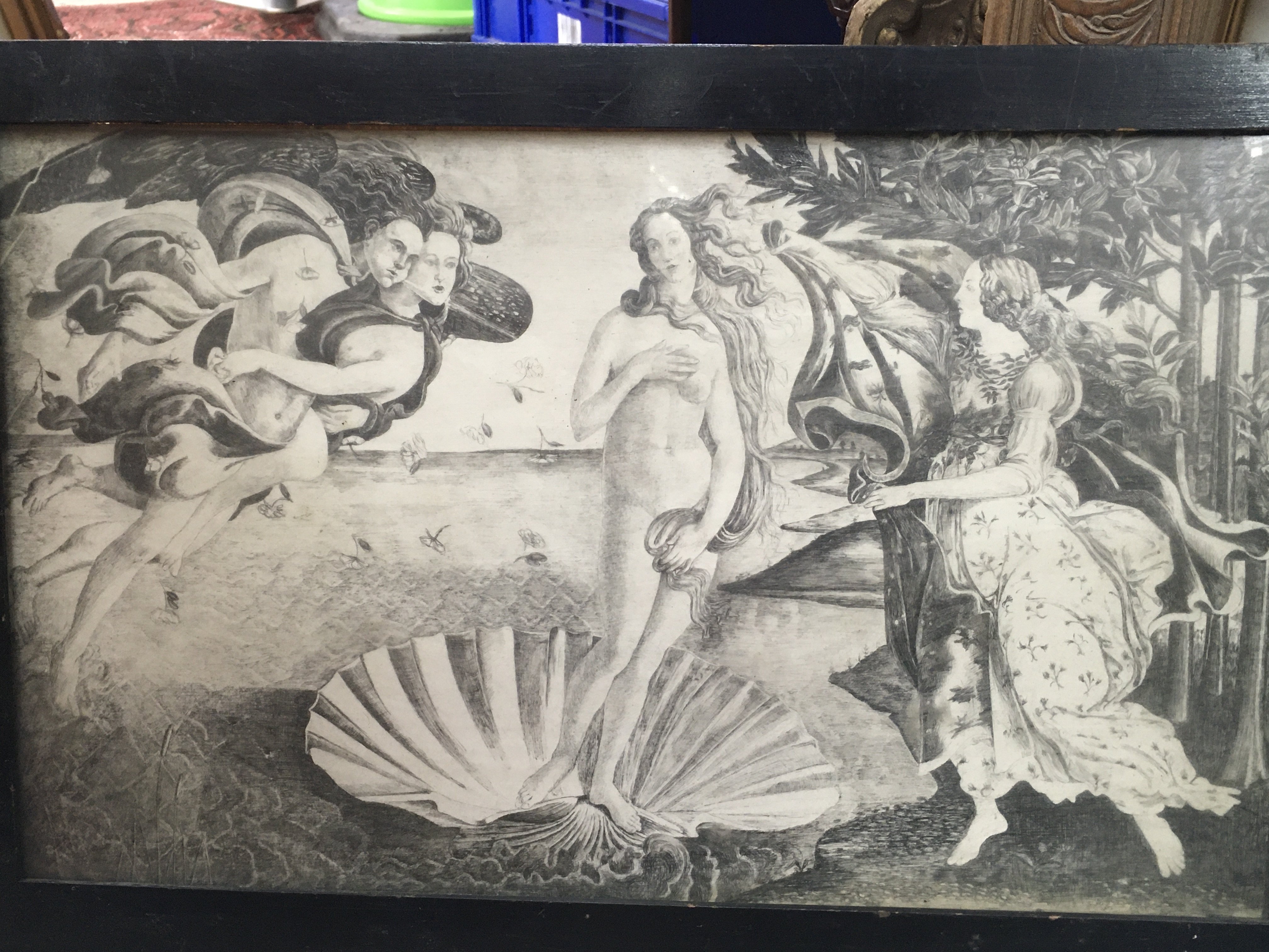 A collection of gilt and gesso picture frames and charcoal studies. 45cm wide 34cm tall, birth of Venus 47cm wide 31cm tall. This lot cannot be posted