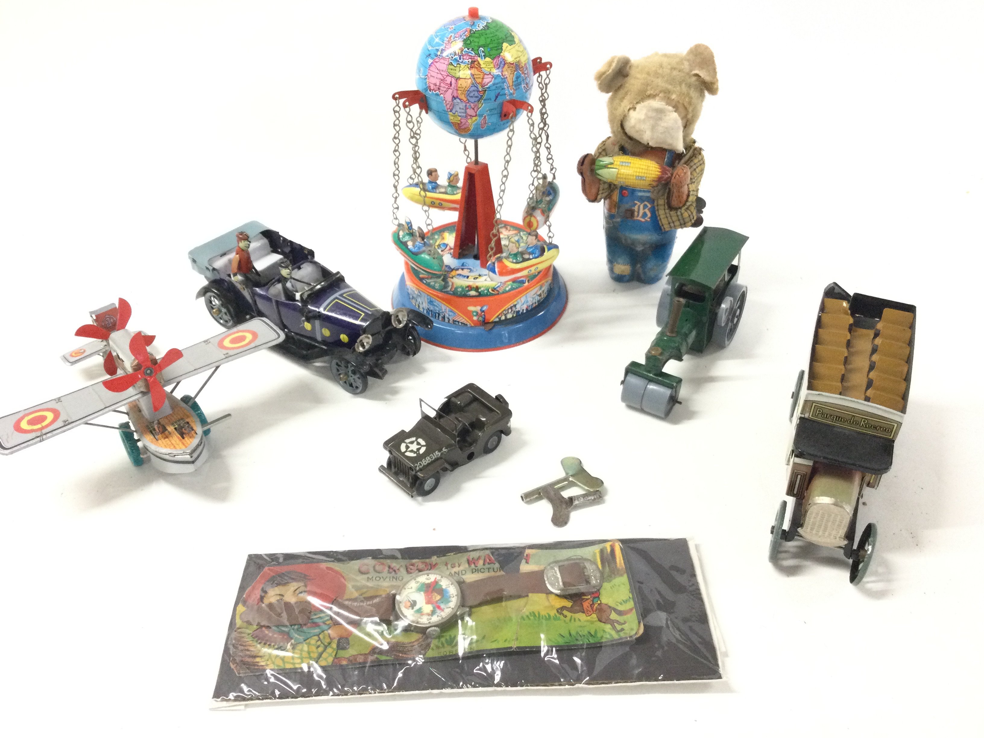 A Collection of Various Boxed And Loose Tinplate Toys. And A Vintage Cowboy Toy Watch.