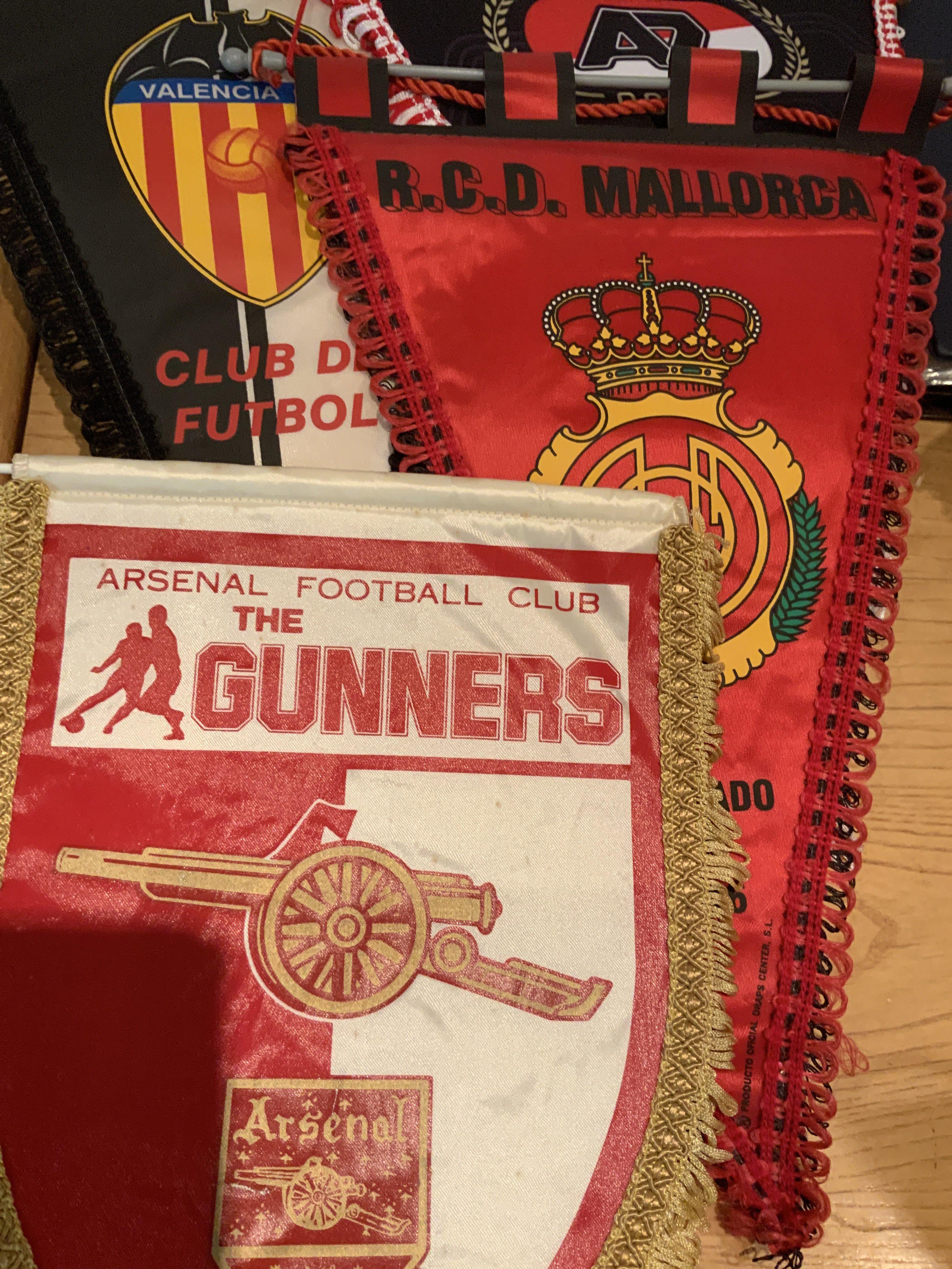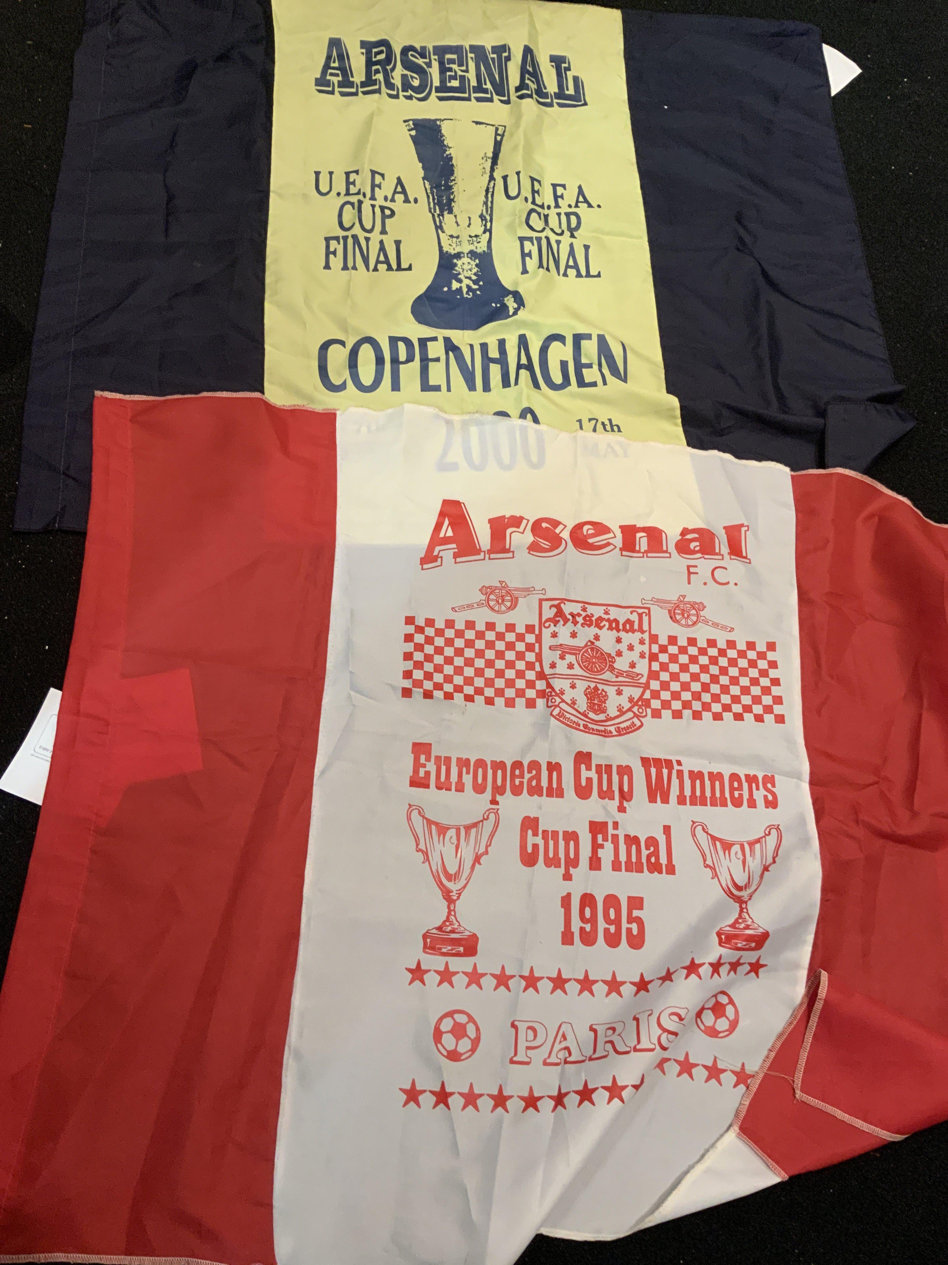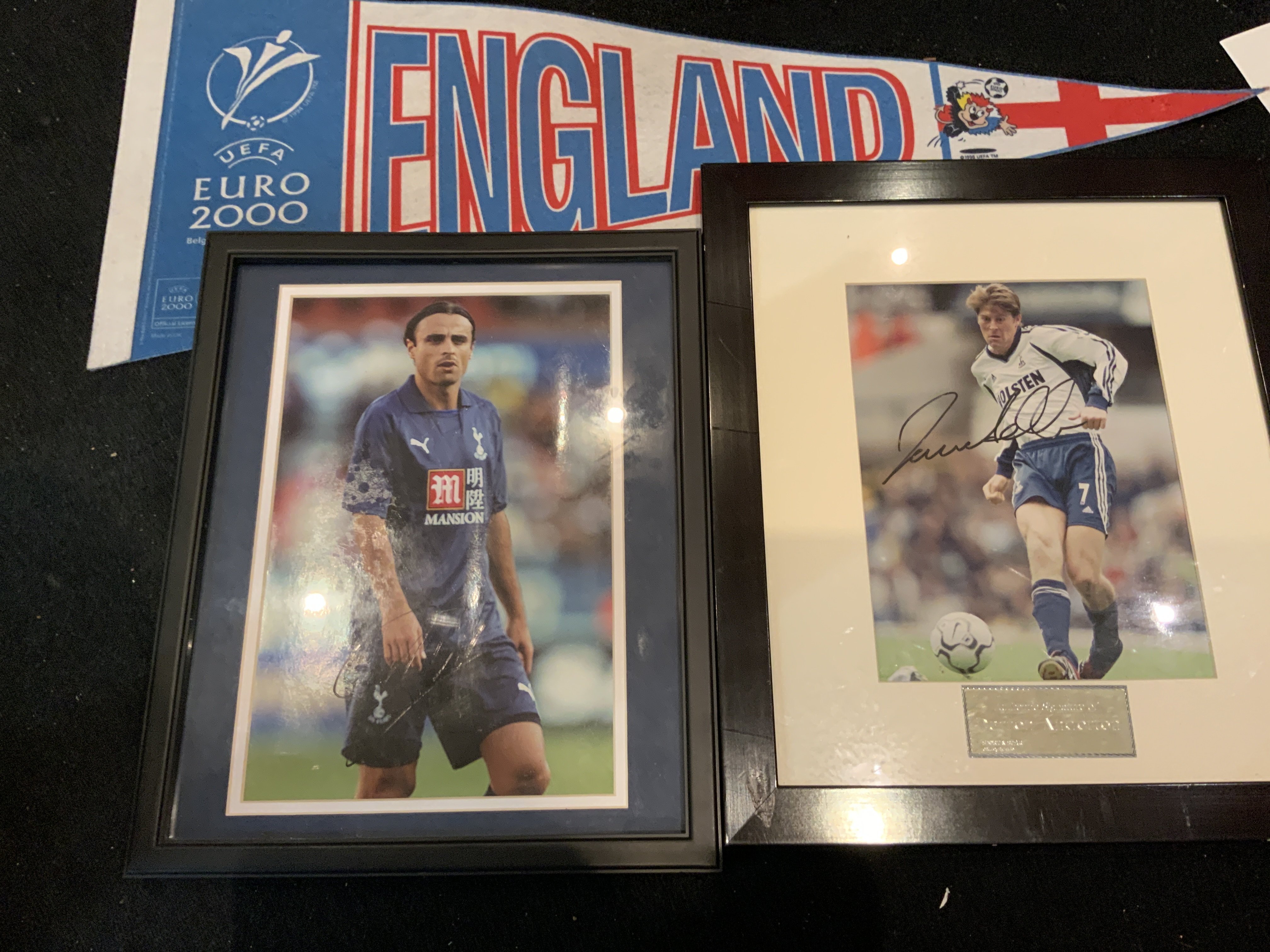 Football Memorabilia Box: Two bound volumes of home programmes for Arsenal 2015/16, approximately 50 pennants of various sizes, signed framed photos of Tottenham players Anderton and Berbatov, non sport press ohotos from the Plymouth area, tickets include 1998 World Cup England v Tunisia, 1981 FA Cup Final replay, Golf programmes, Man Utd photos, large flags for Arsenal finals in 1995 ECWC, 2000 UEFA Cup and a few cards.