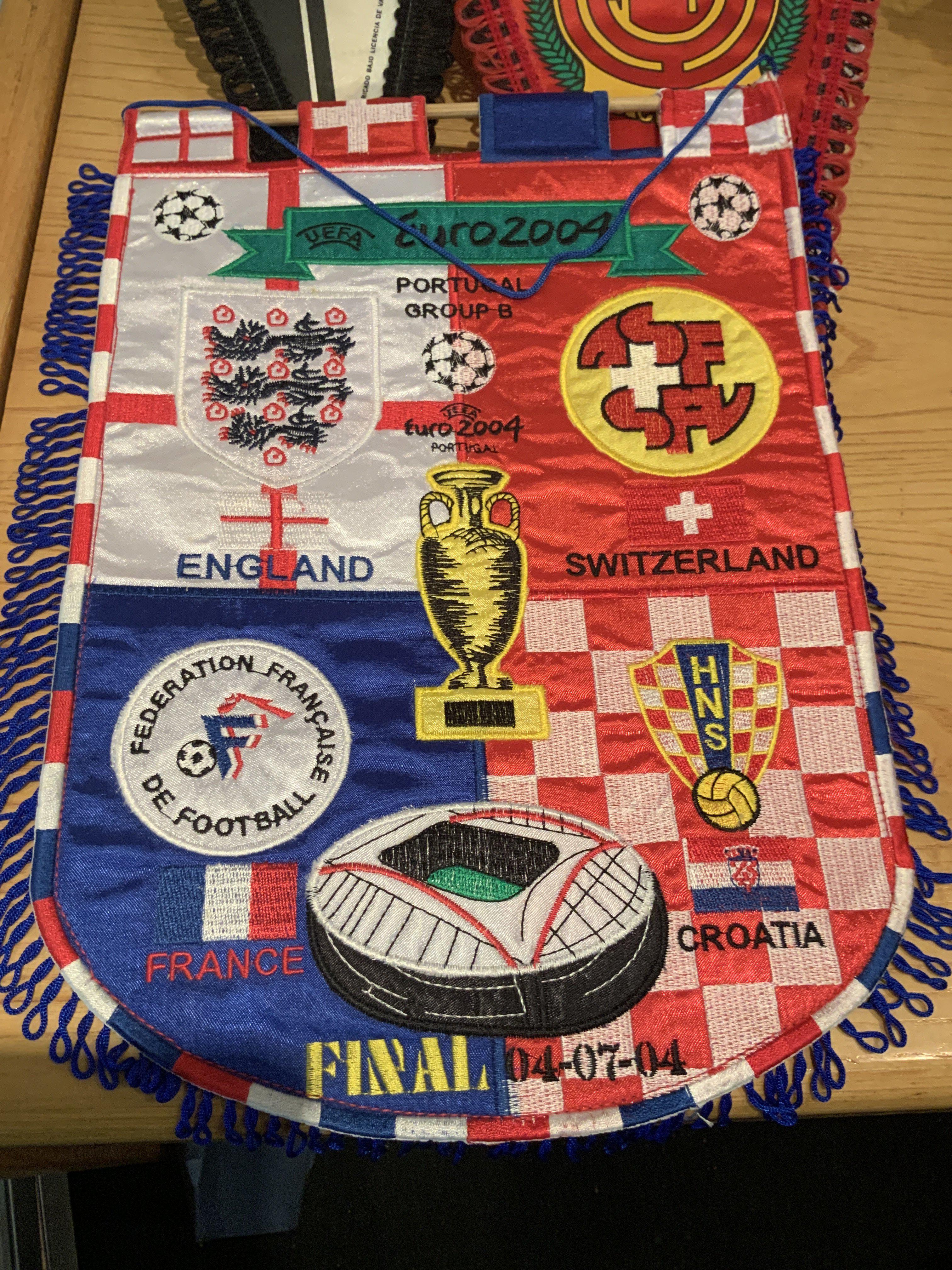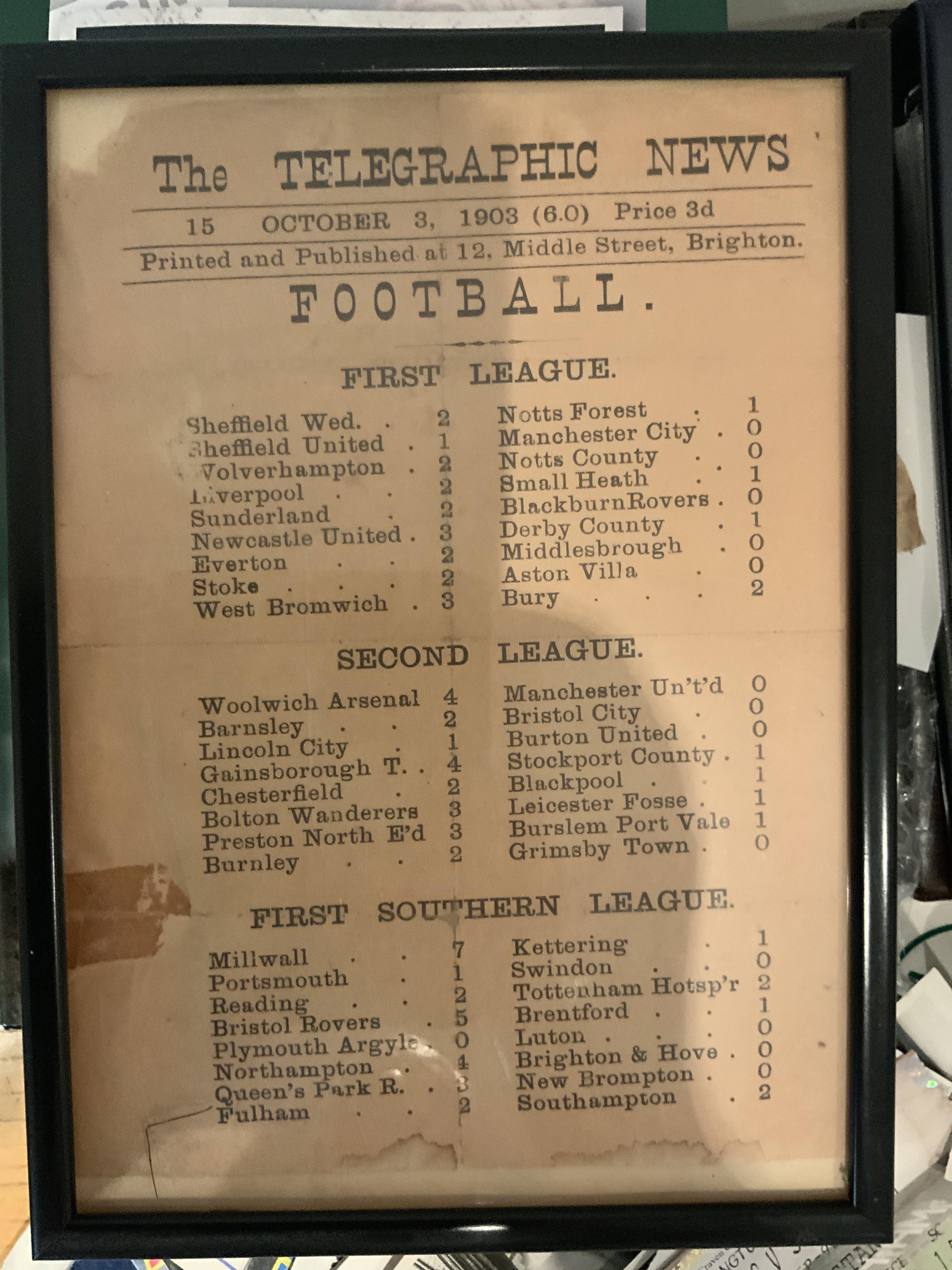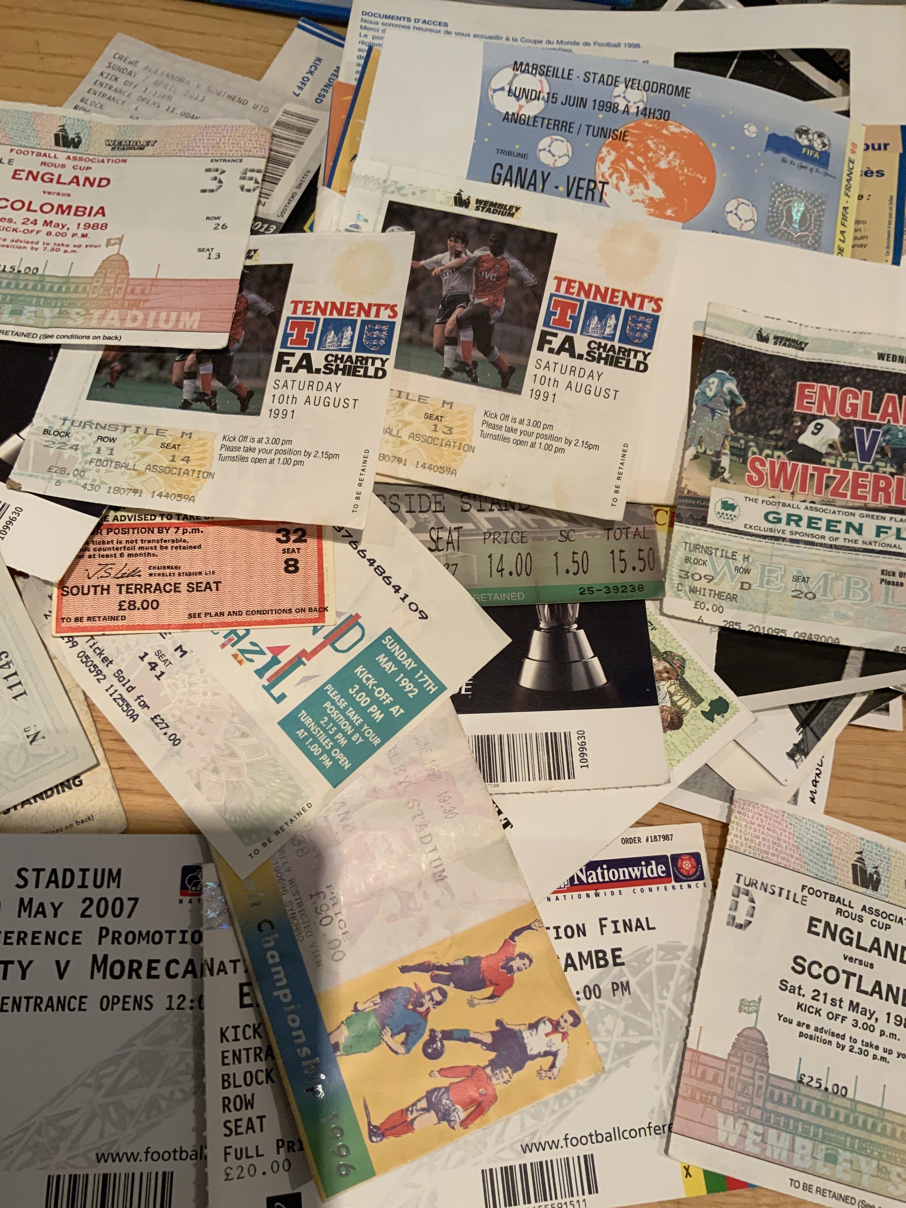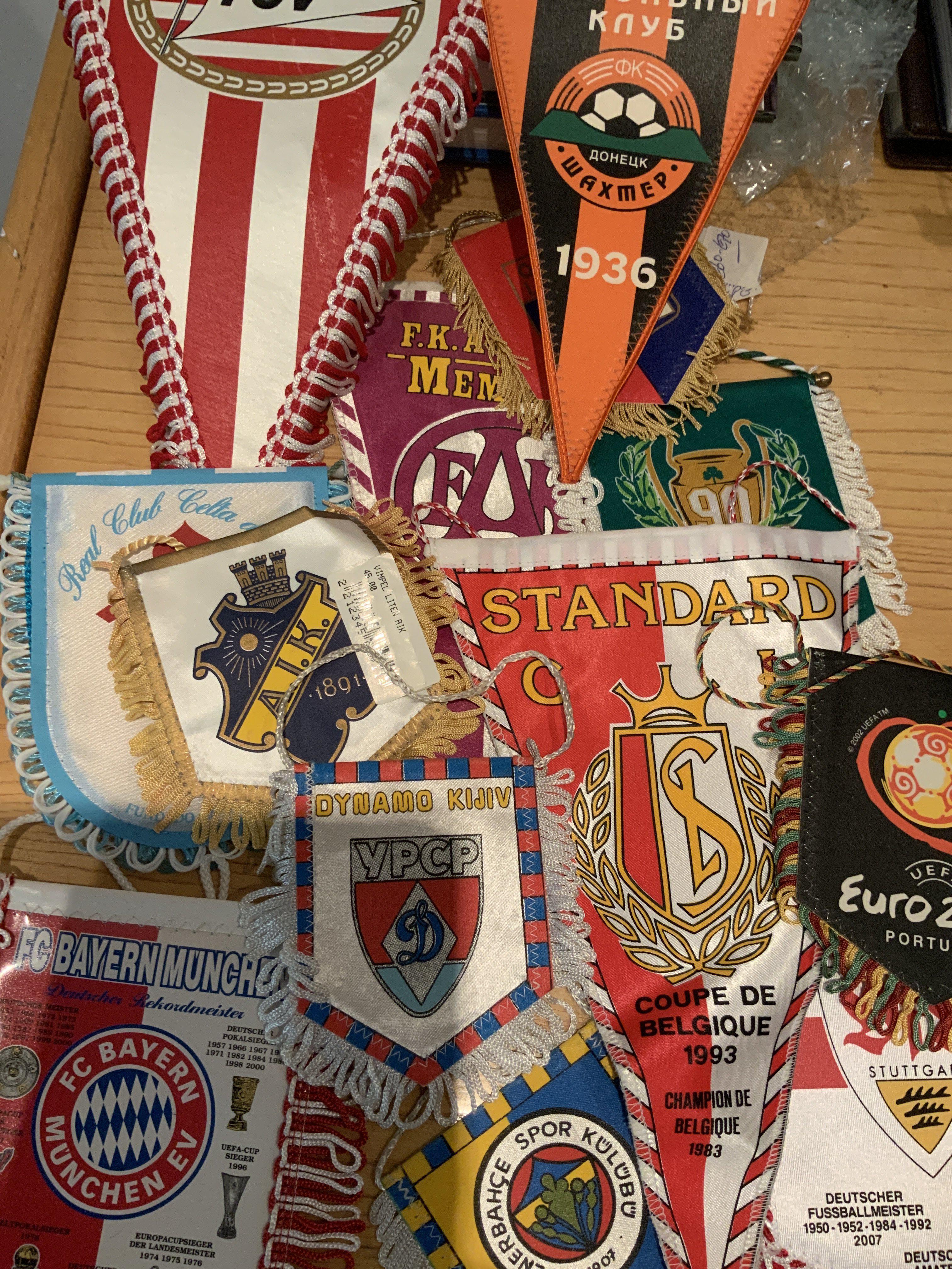 Football Memorabilia Box: Two bound volumes of home programmes for Arsenal 2015/16, approximately 50 pennants of various sizes, signed framed photos of Tottenham players Anderton and Berbatov, non sport press ohotos from the Plymouth area, tickets include 1998 World Cup England v Tunisia, 1981 FA Cup Final replay, Golf programmes, Man Utd photos, large flags for Arsenal finals in 1995 ECWC, 2000 UEFA Cup and a few cards.