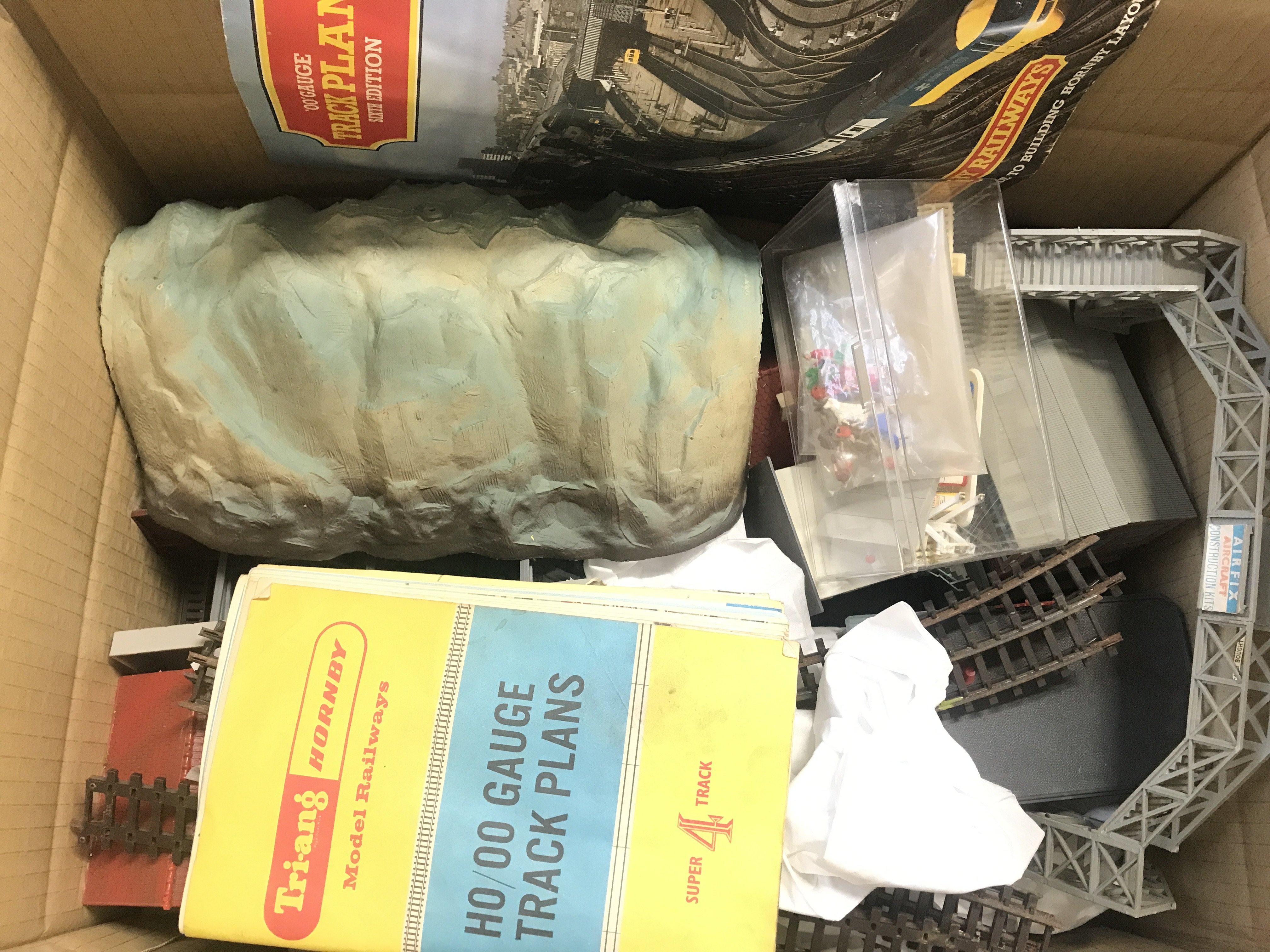 A Small Collection of 00 Gauge Track. Wagons. 2 Electric Locomotives a Clockwork Goods Train A/F. Buildings Accessories Etc.(2).
