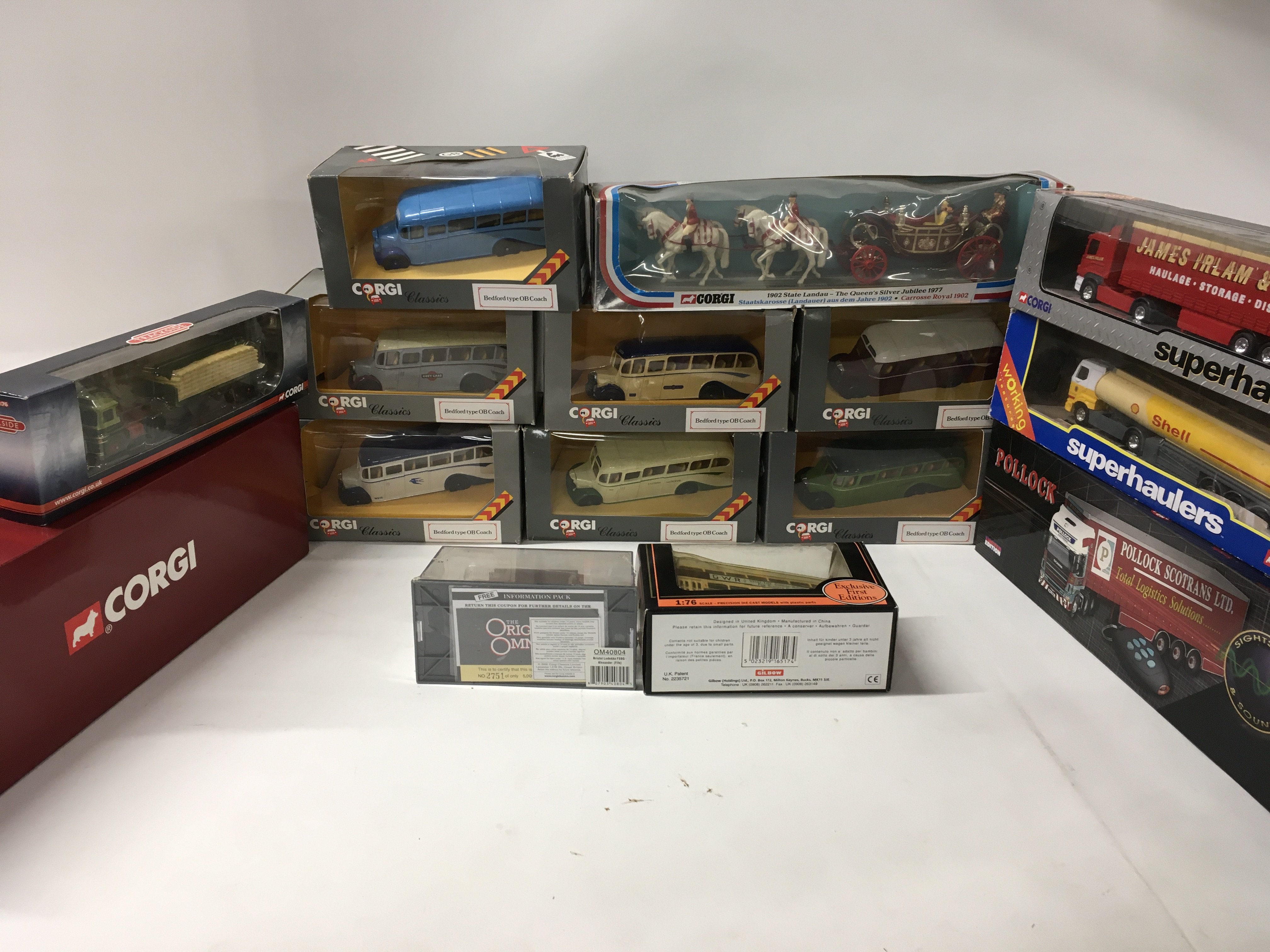A collection in excess of 10 boxed model diecast vehicles mainly buses. Also includes plastic model of queens jubilee coach with horses. Mostly by Corgi..EFE. No reserve