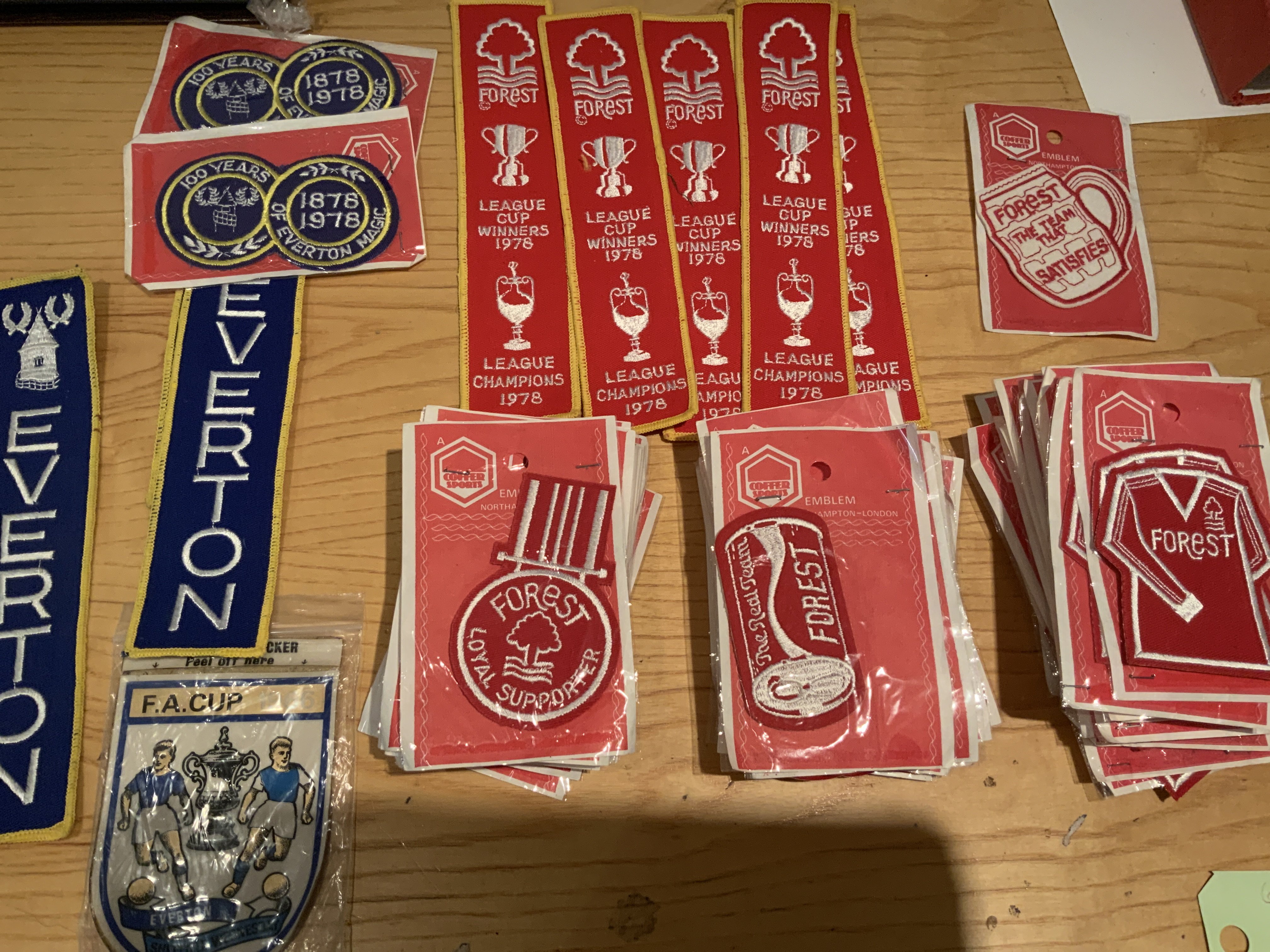 Nottingham Forest Coffer Sports Sealed Cloth Football Badge Collection:Around 60 to include Forest Loyal Supporter, Forest drinks can and the Forest shirt plus a cloth tankard and 5 Double Winners 1978. Made to sew on to jackets often denim ones in the 1970s. C/W a few Everton and CB Radio. (Est 80)