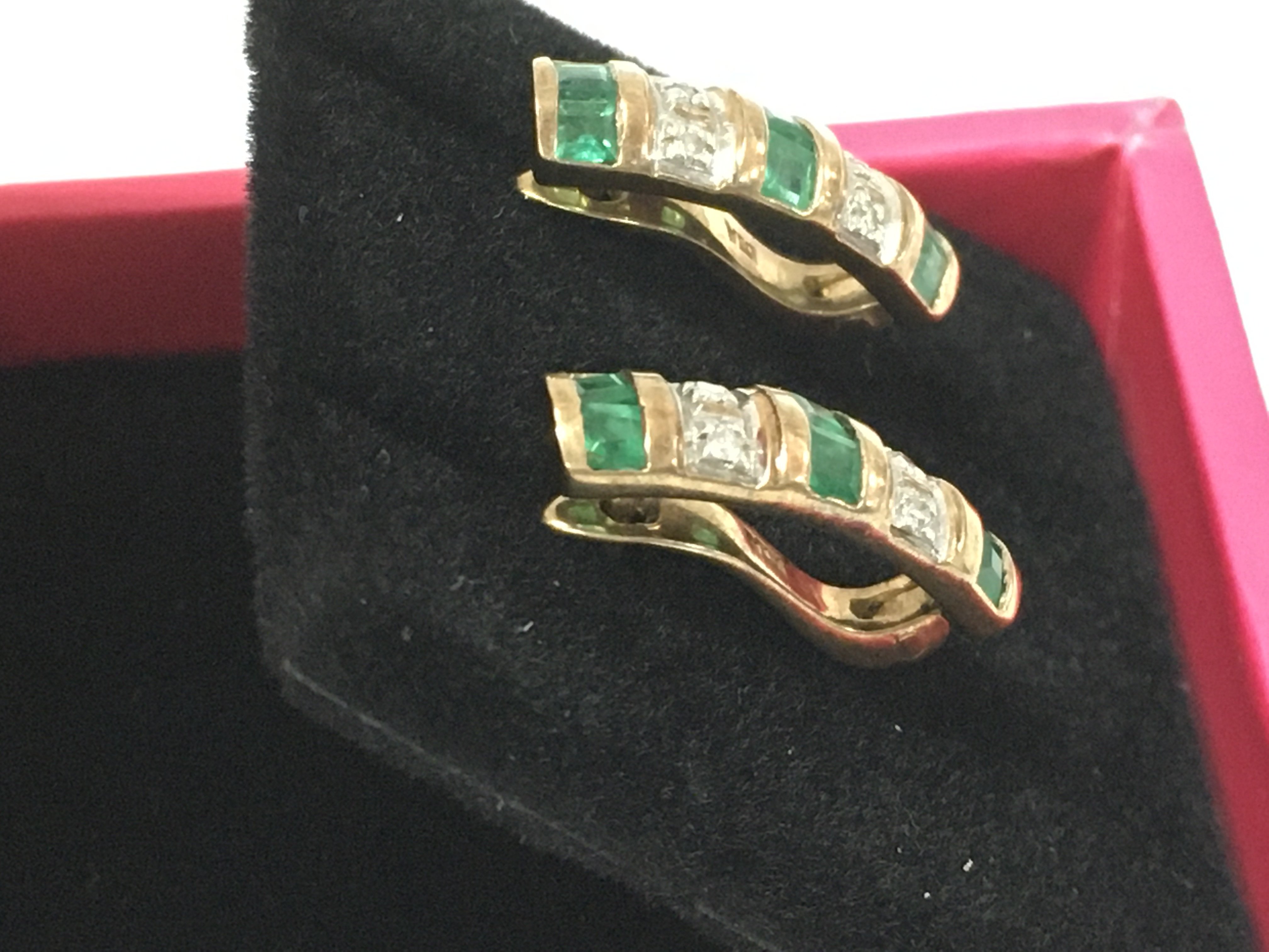 A pair of 9ct gold earring set with emeralds and diamonds. Postage B