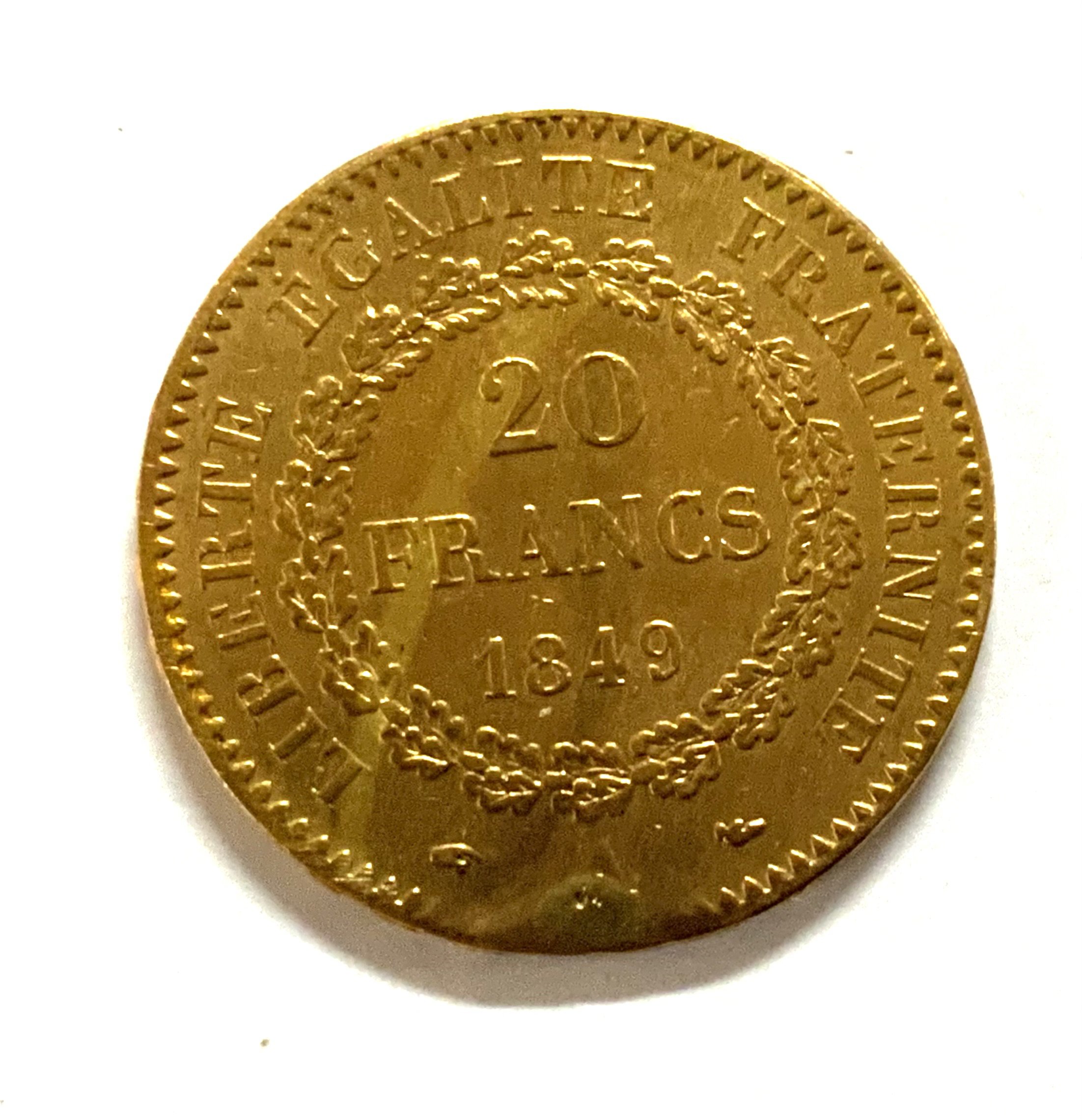 1849 French 20 Francs Gold Coin, Guardian Angel, 0.900, 6.4g. (Damage to coin edge through previous mount).