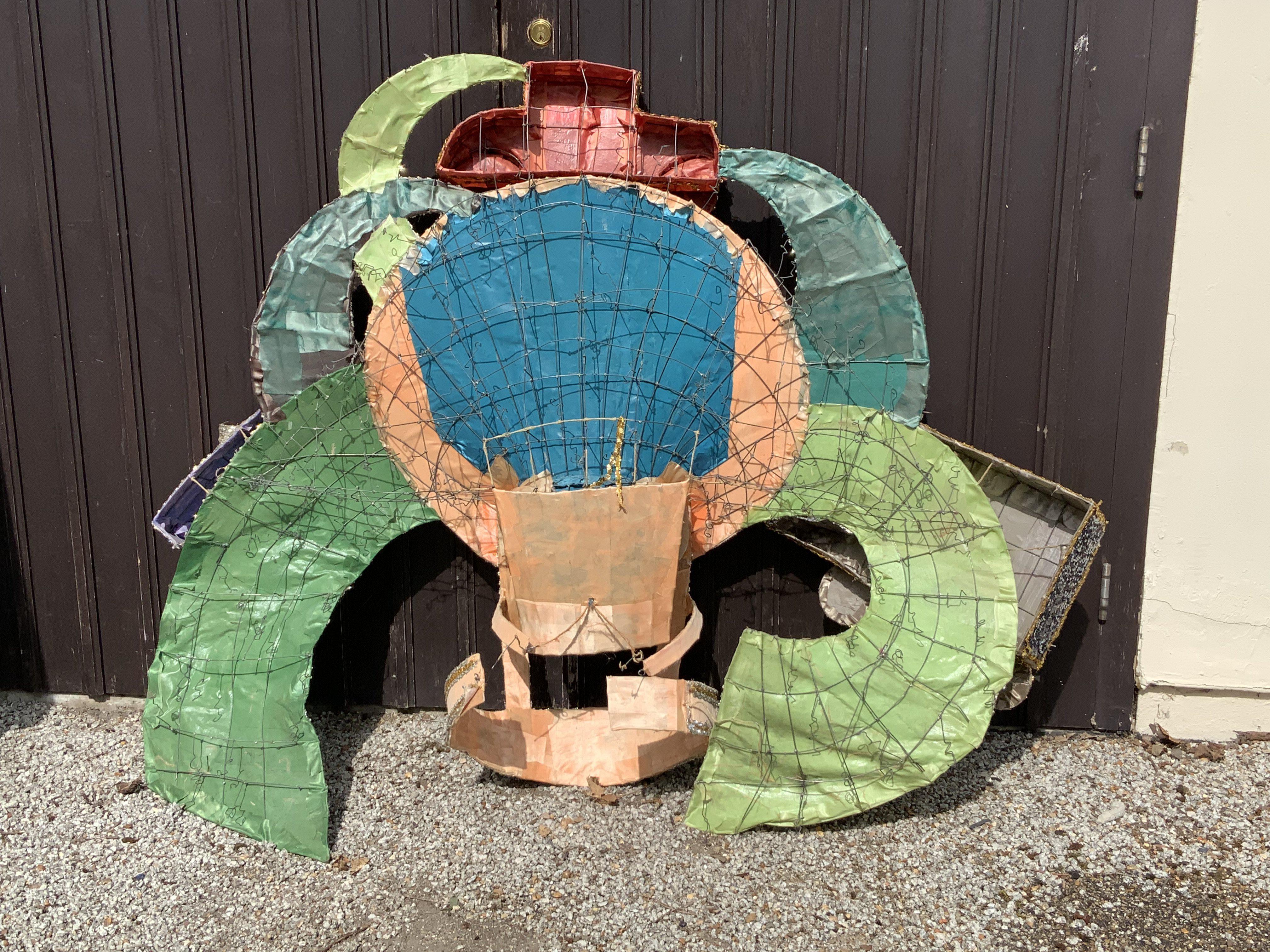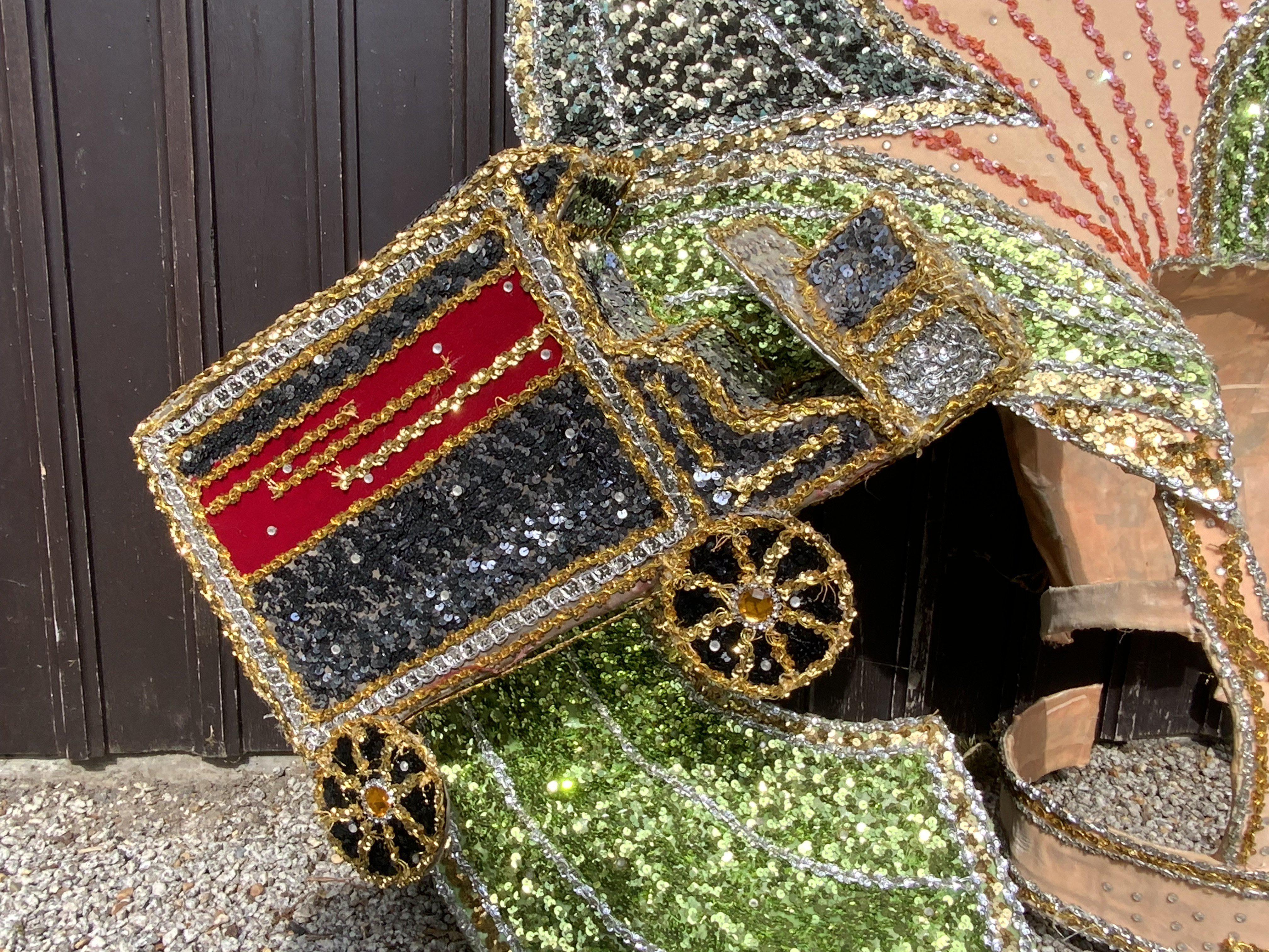 An elaborate Mardi Gras costume the theme of 1970s modern motoring showing 3 classic veichles, worn and made for the New Orleans Mardi Gras Circa 2010, Purchased at Vicky Vines Auction, Houston Texas. Wire framed and sequin covered.