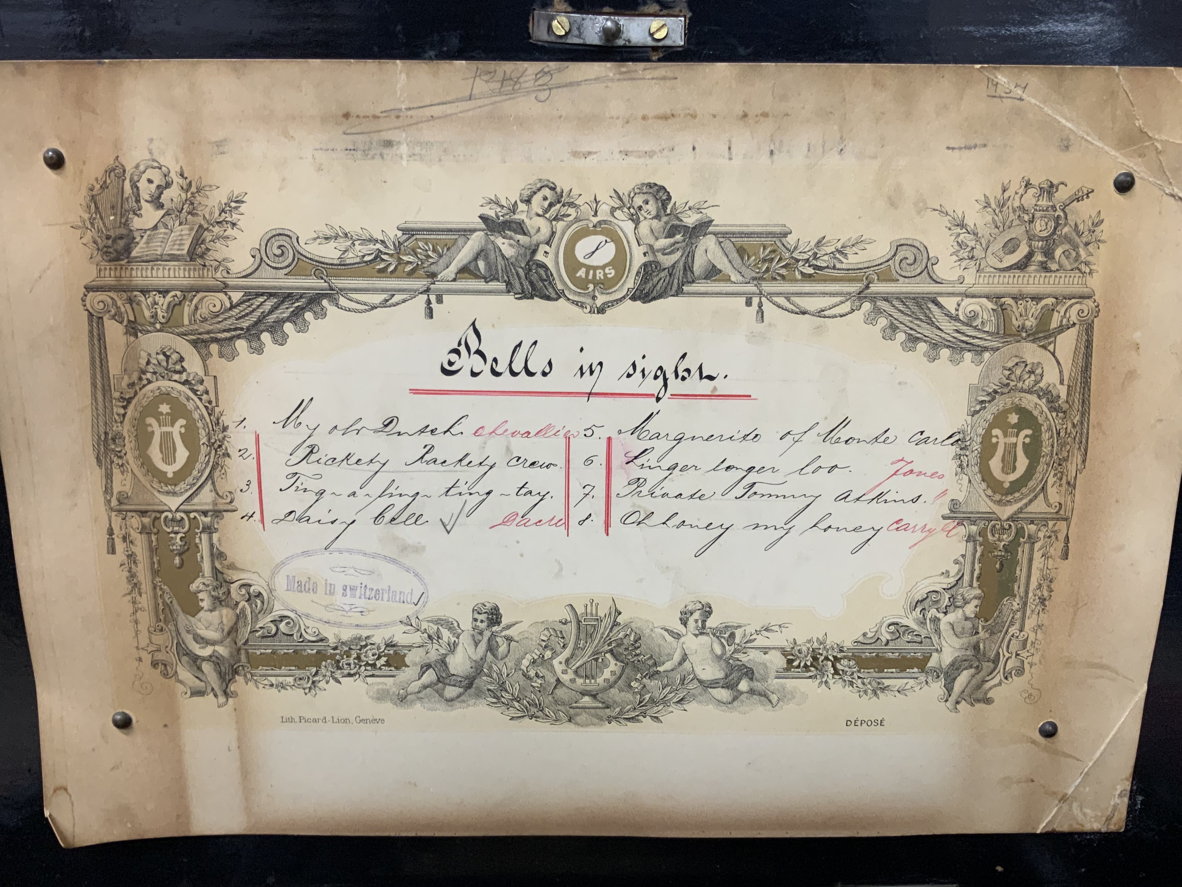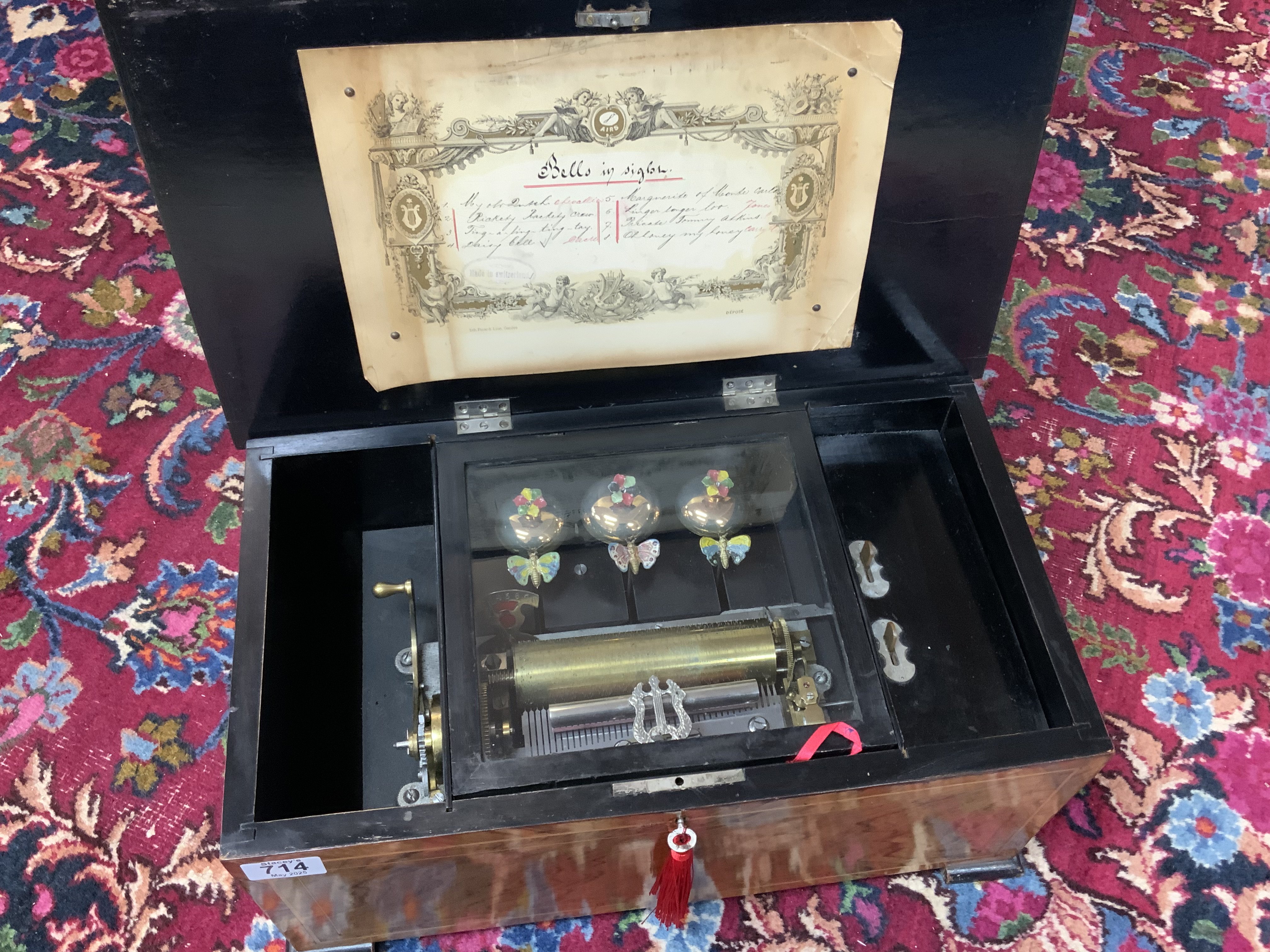 A Swiss cylinder musical box playing 8 airs as listed on tune sheet, marked Lith Picard - Lion, Geneve. 15 cm cylinder with 3 bell accompaniment. Brazilian Rosewood veneer to front and lid. Working condition. (D) 48cm x 27.5cm x 22cm.