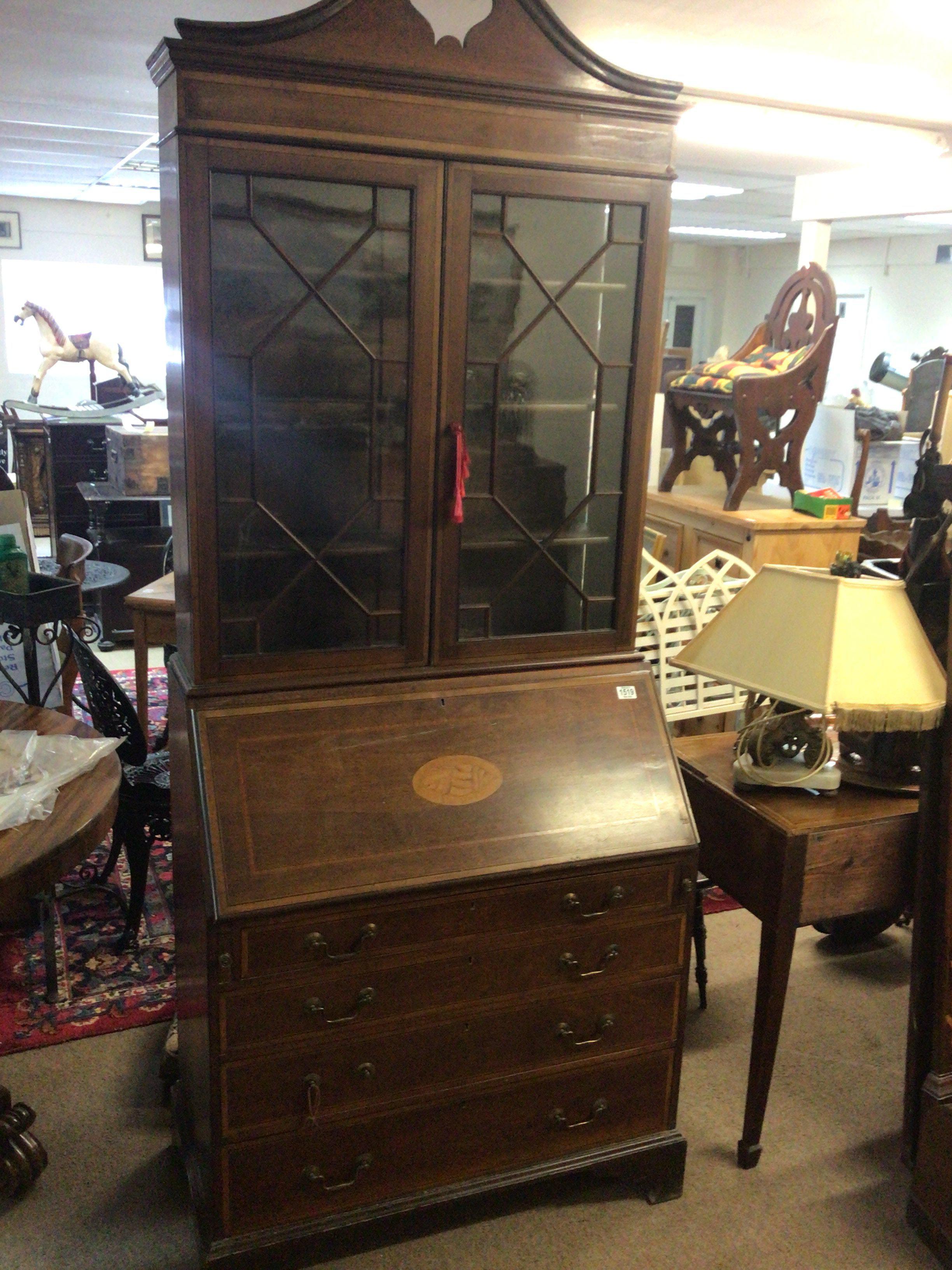 An Edwardian mahogany and satinwood banded bureau bookcase with a shaped pediment above a fall front and four graduating drawers. NO RESERVE