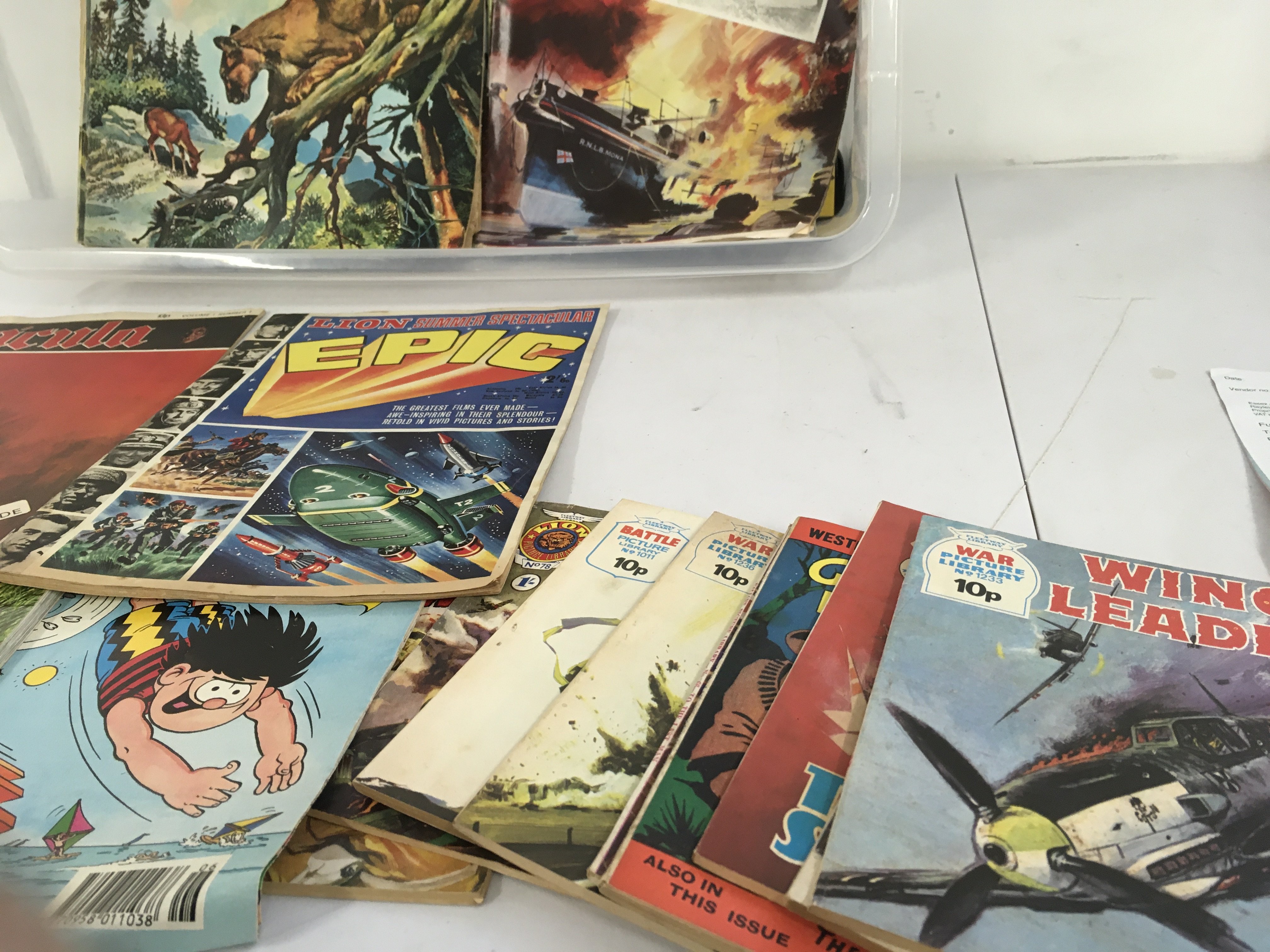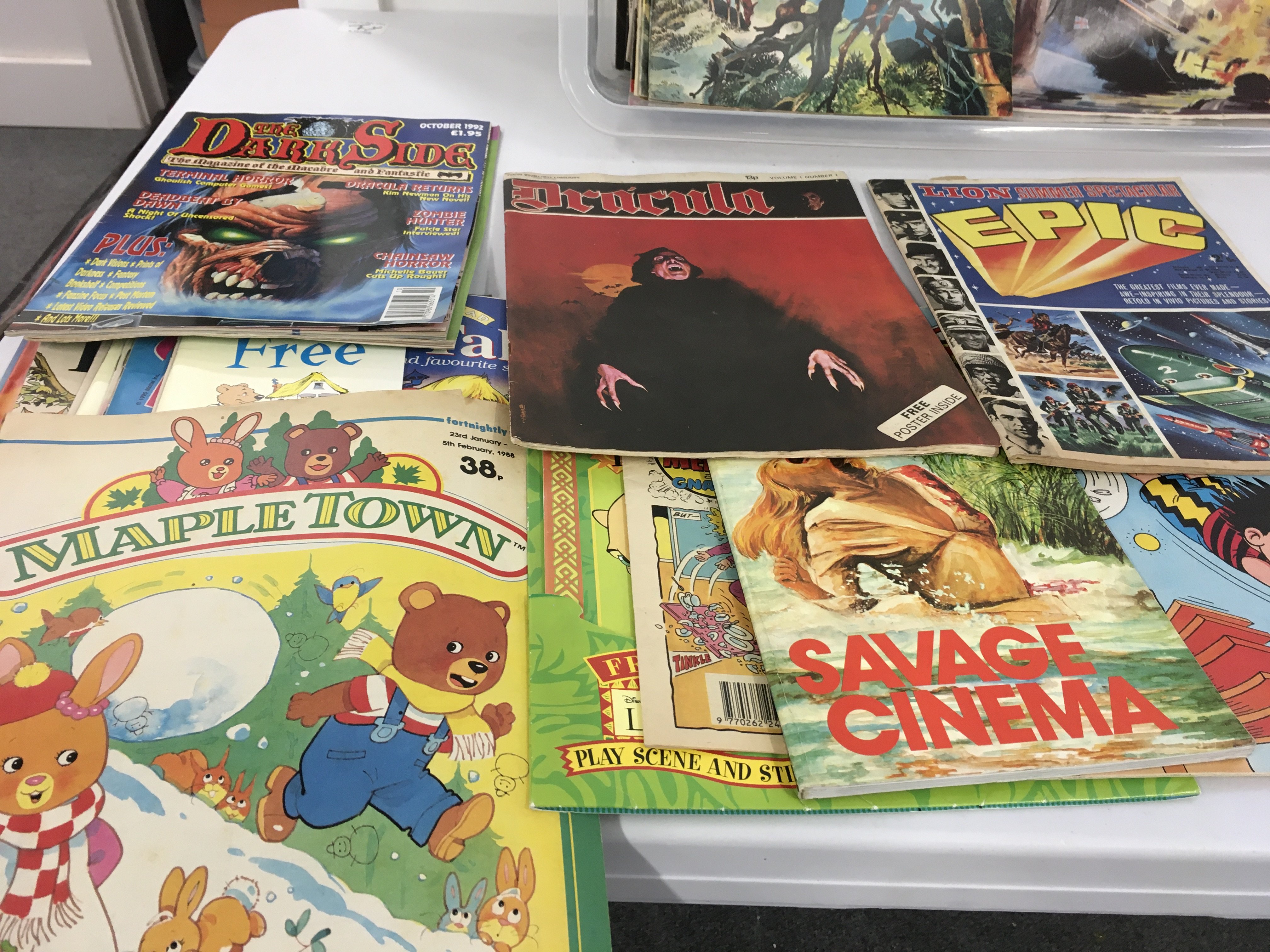 A collection of approximately 100 assorted weekly comics and magazines including Beano..Look and Learn..Headlines..Maple Town.. War Picture Library plus many other titles. No reserve.