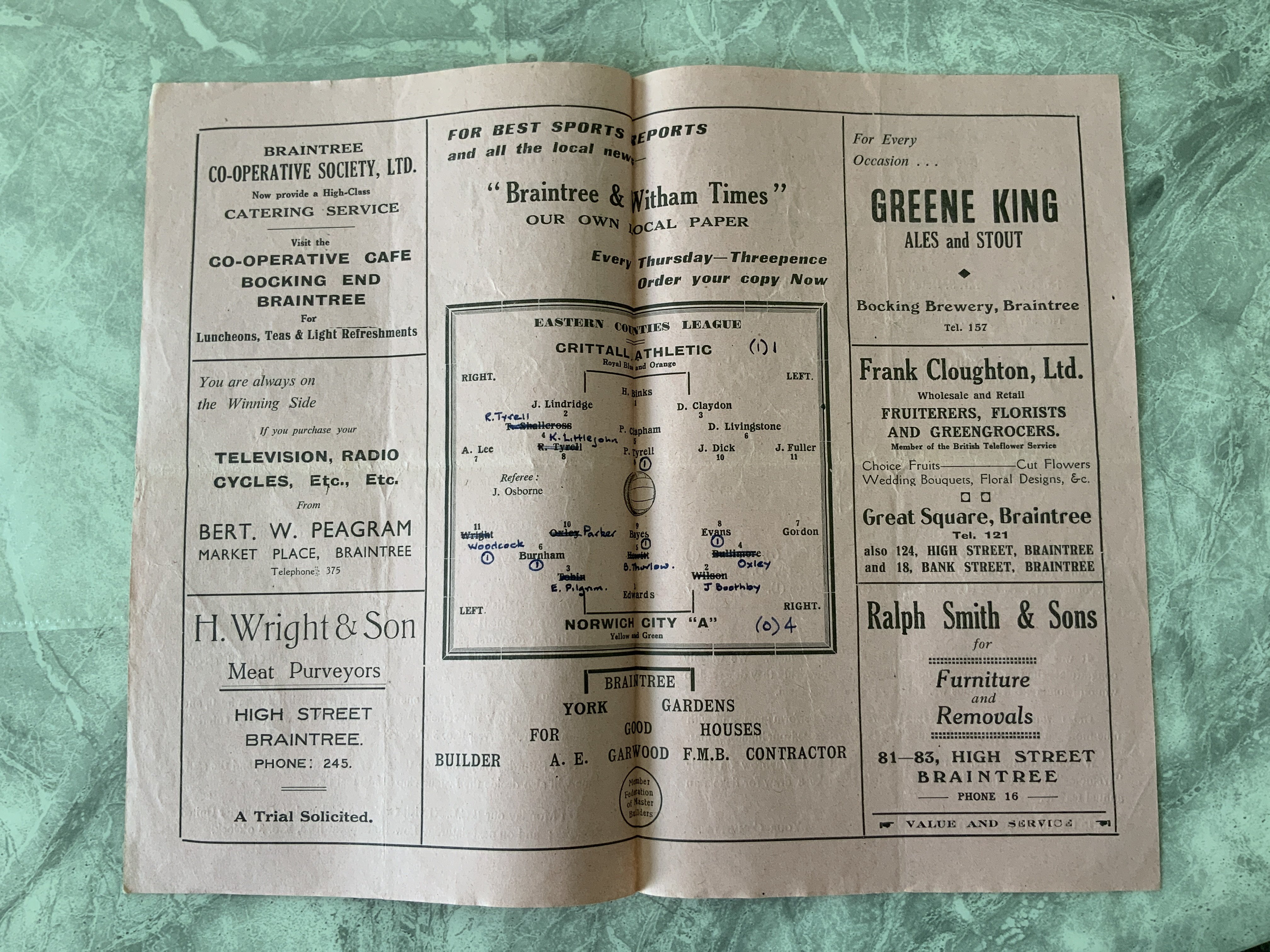 52/53 Crittall v Norwich City A Football Programme: Eastern Counties League 4 pager with team changes dated 11 4 1953. Very good with fold.