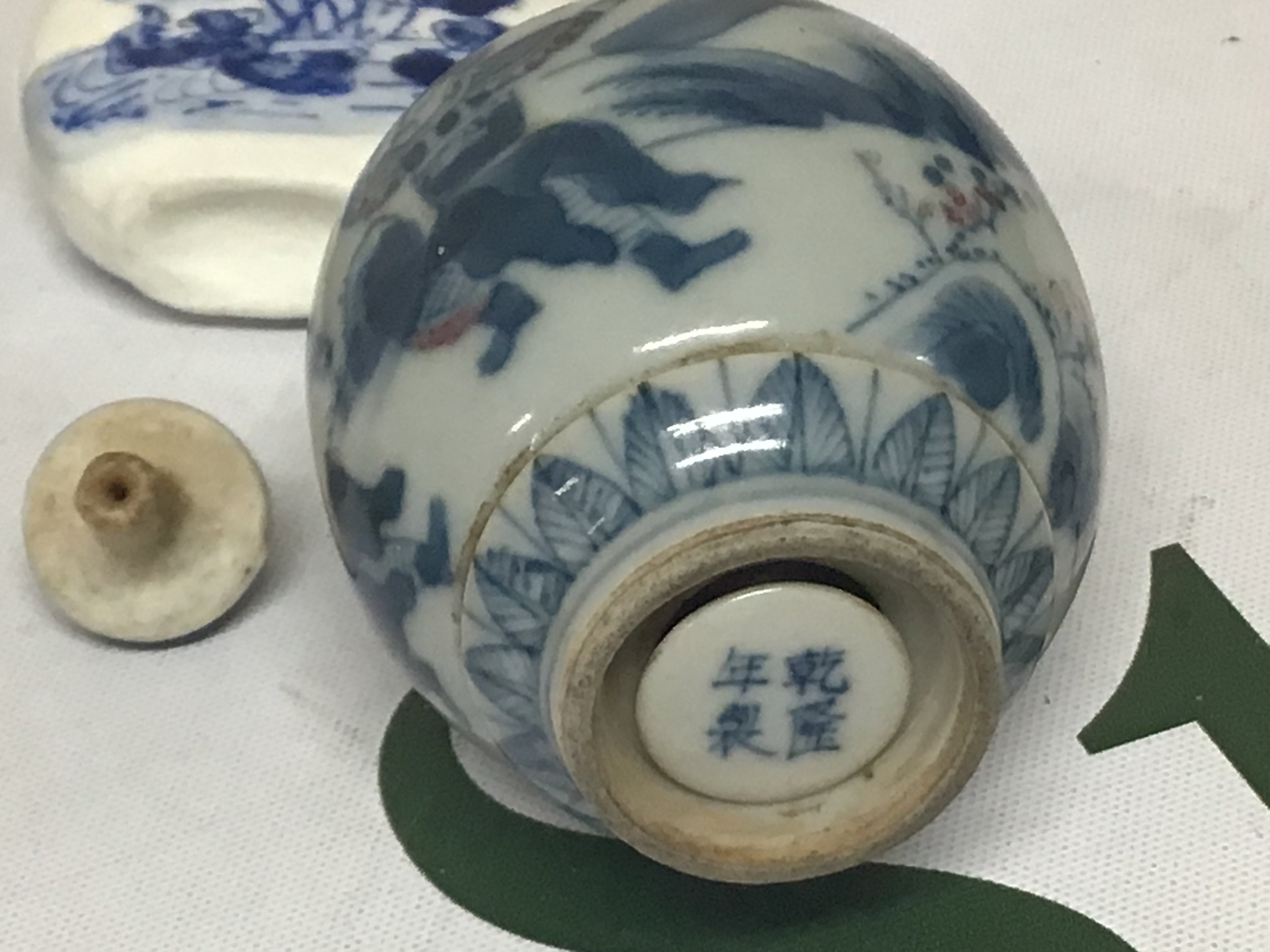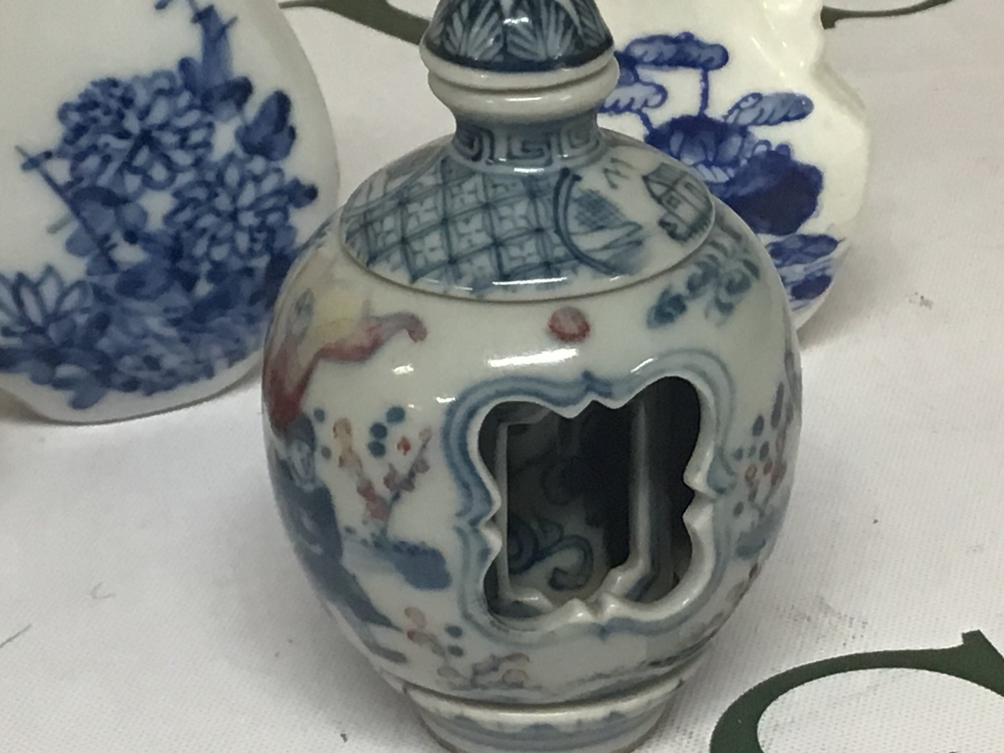 An interesting Chinese porcelain scent bottle with revolving central sections the sides decorated with figures and underglaze iron red with blue Caricature marks to the base and three other blue and white Chinese porcelain scent bottles. (4). NO RESERVE