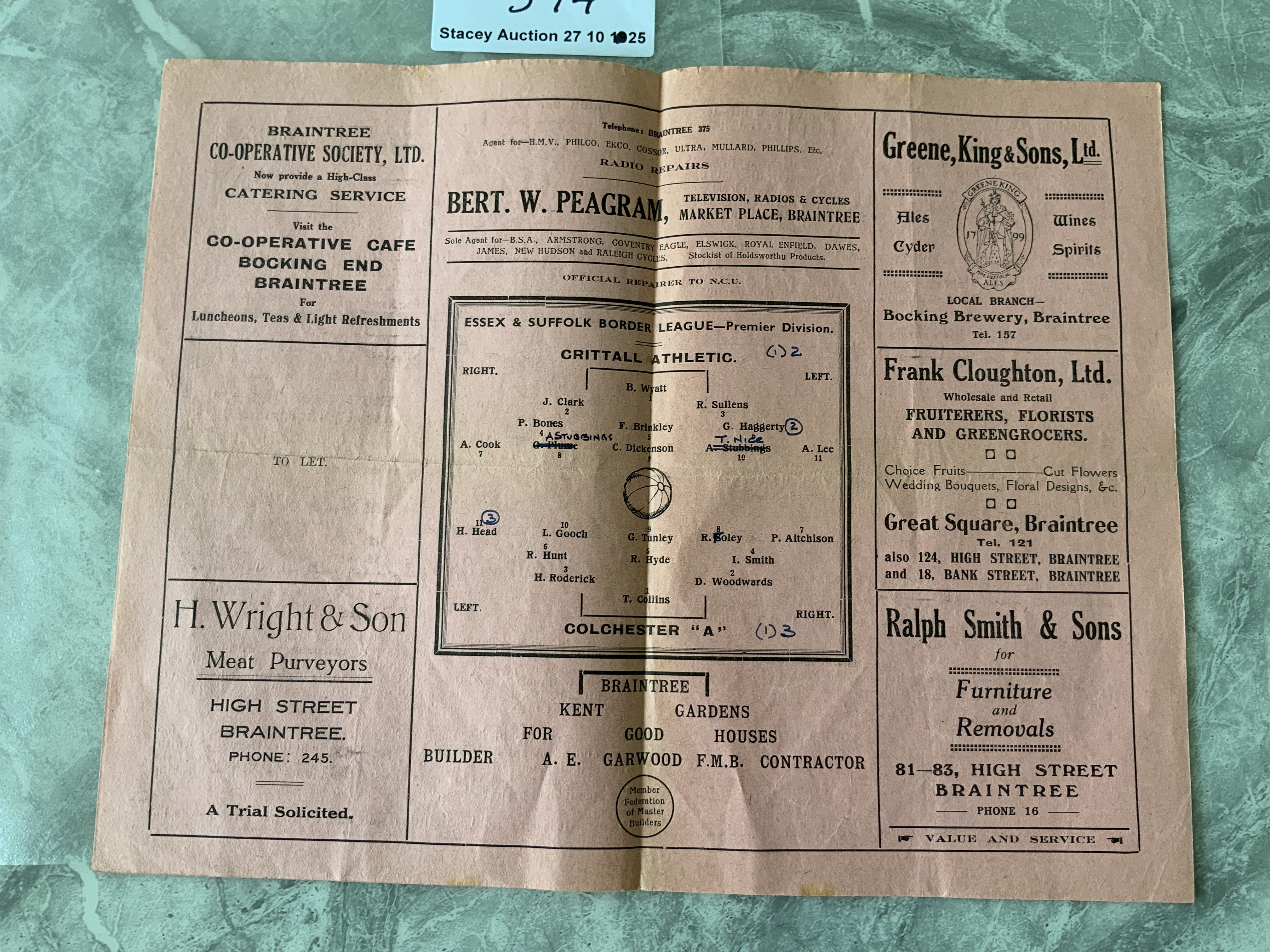 50/51 Crittall v Colchester United Football Programme: Essex + Suffolk Border League with team changes dated 21 10 1950. Very good from Colchesters first season in the league.