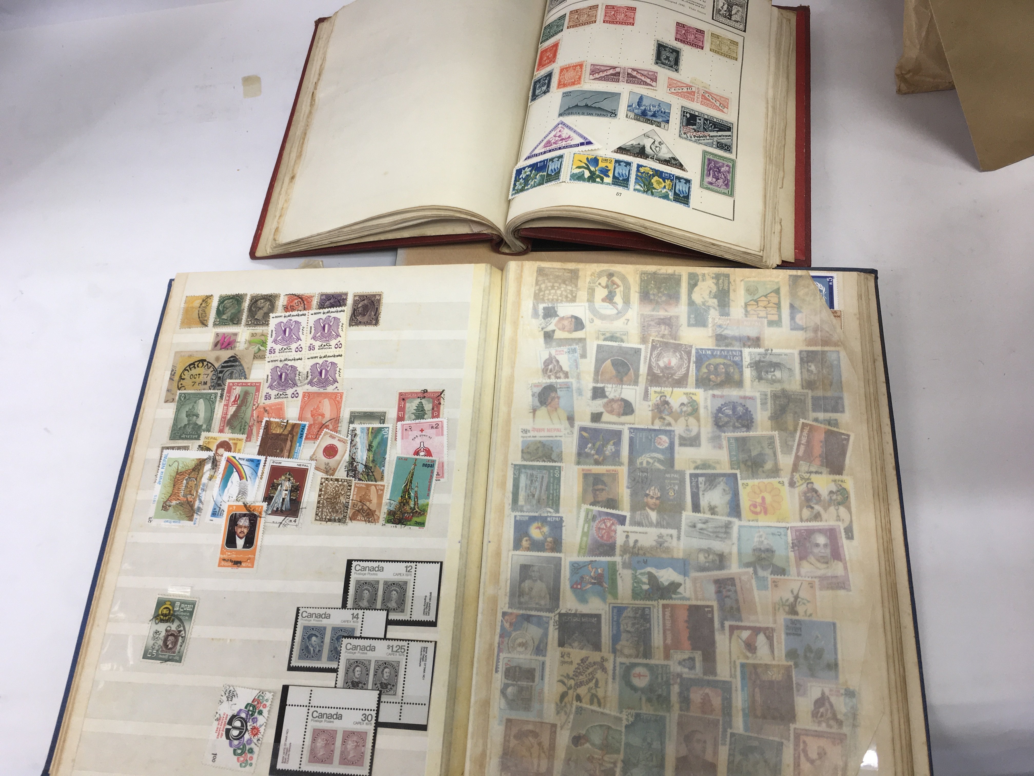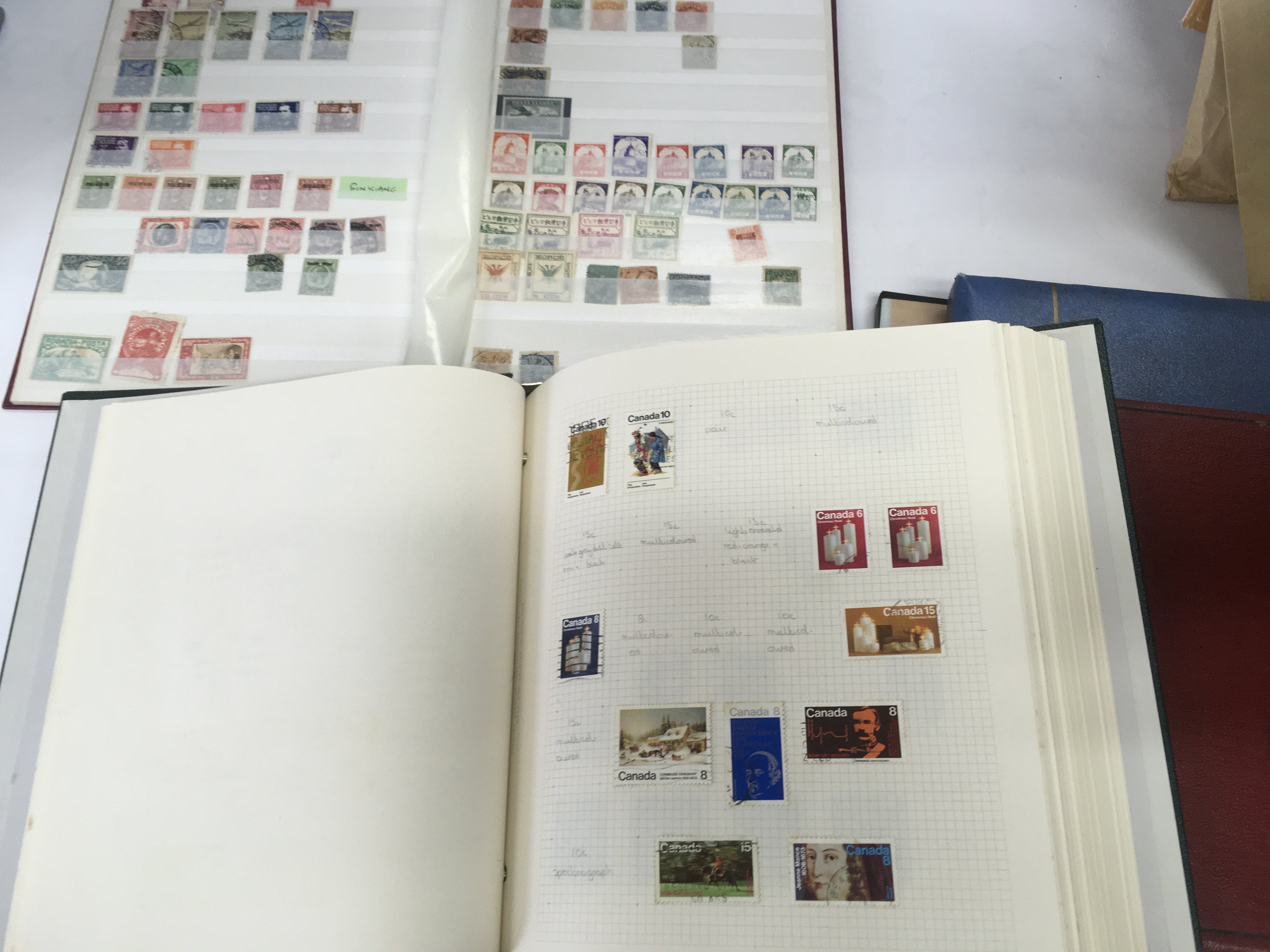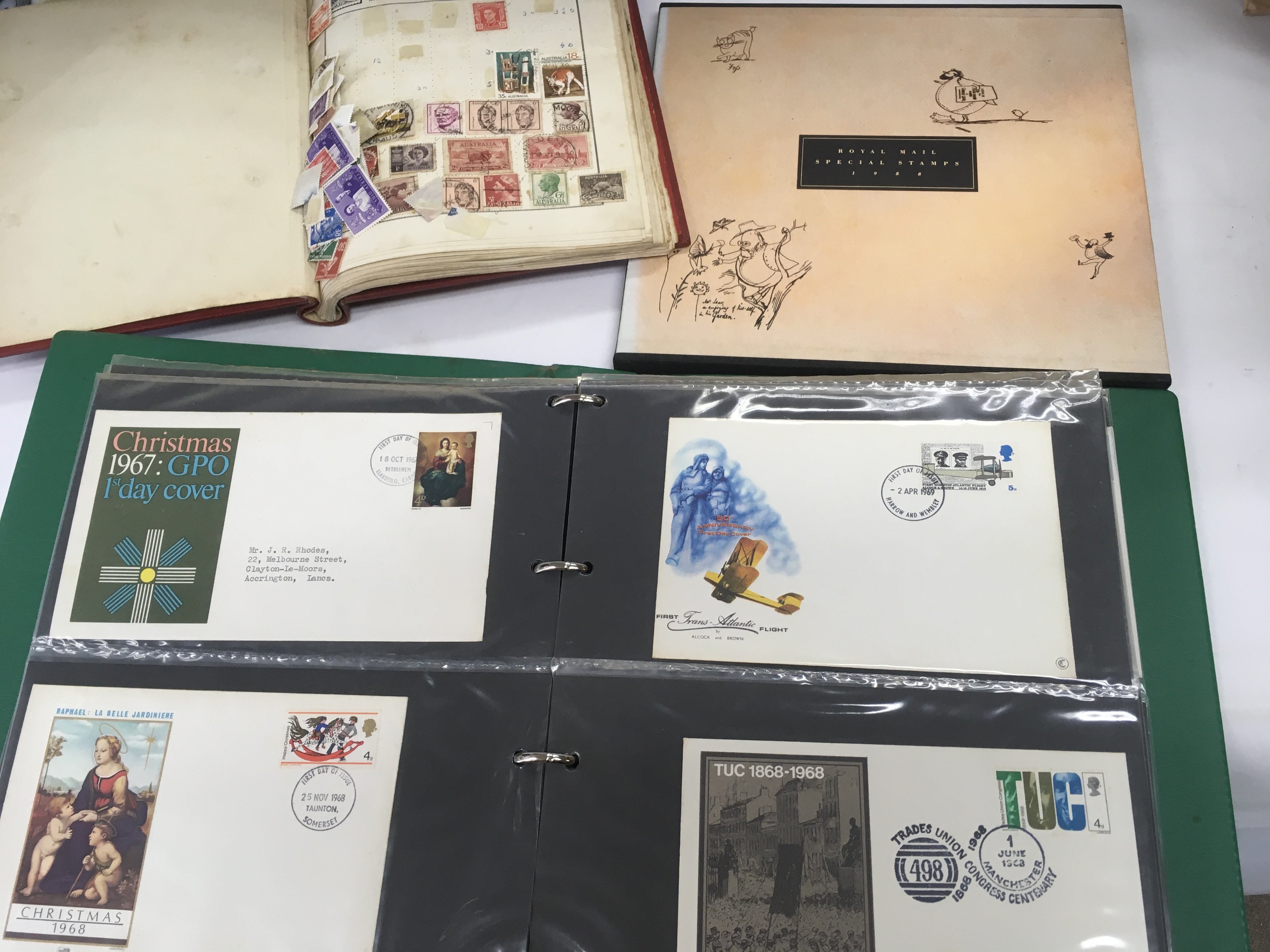 A box of world + GB stamps, First day covers and presentation packs.