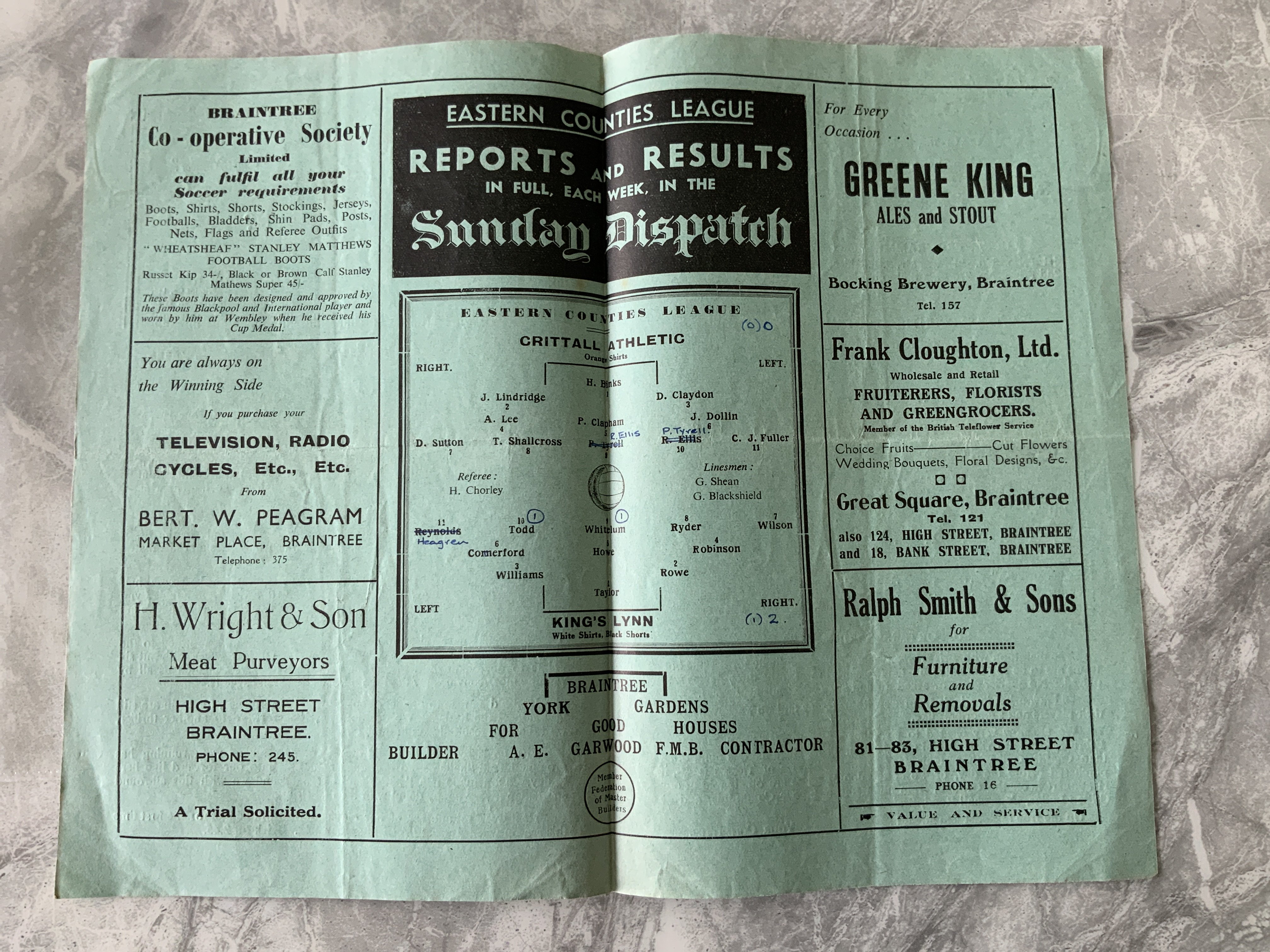 53/54 Crittall v Kings Lynn Football Programme: Eastern Counties League with team changes dated 6 2 1954. Very good with light fold.