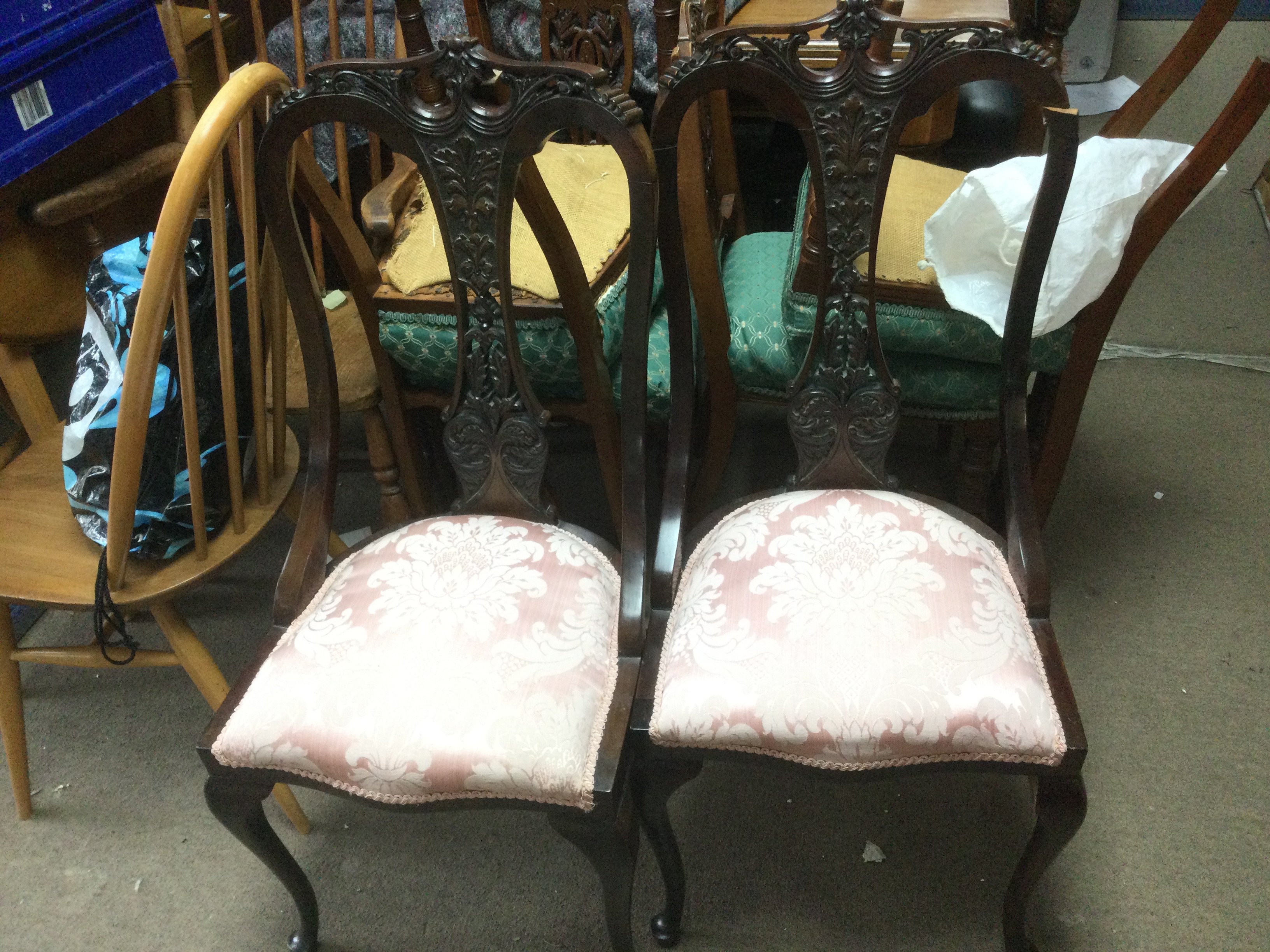A pair of Edwardian chairs in pink draylon upholstery. Shipping category D. NO RESERVE