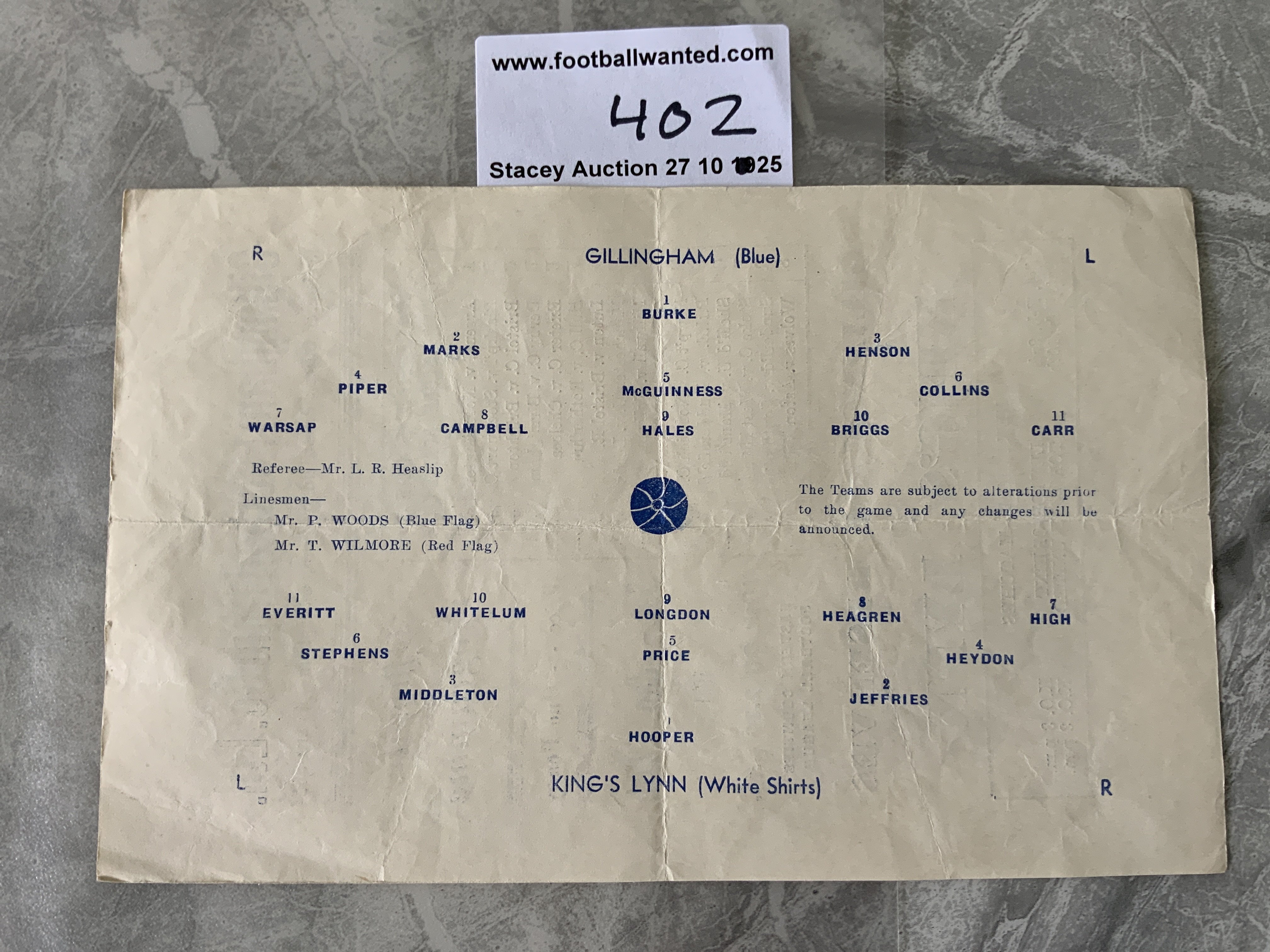 50/51 Gillingham Reserves v Kings Lynn Football Programme: Eastern Counties League single sheet with no team changes dated 27 1 1951. Very good with fold. Gillinghams first season back in the league.