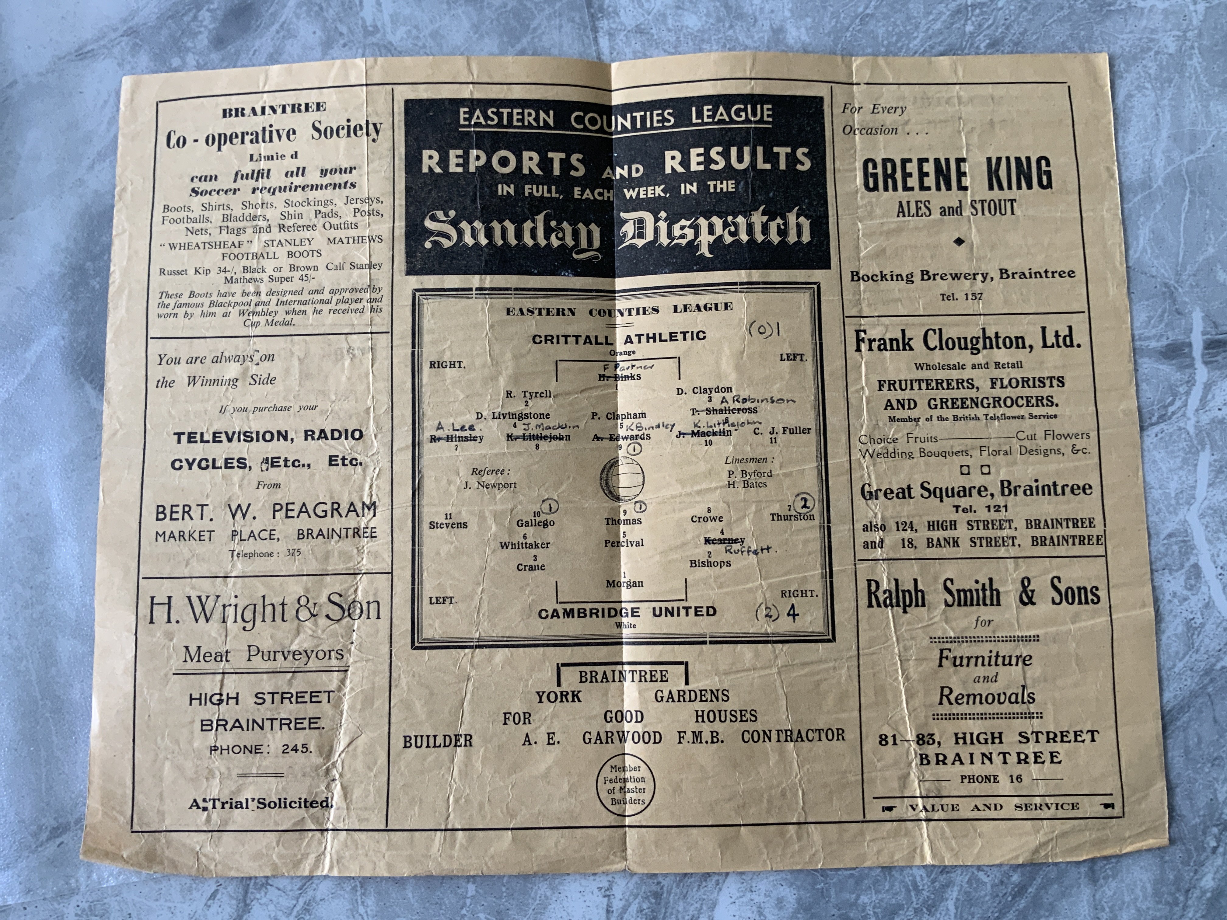53/54 Crittall v Cambridge United Football Programme: Eastern Counties League match with team changes dated 29 8 1953. Fair/good with creasing.