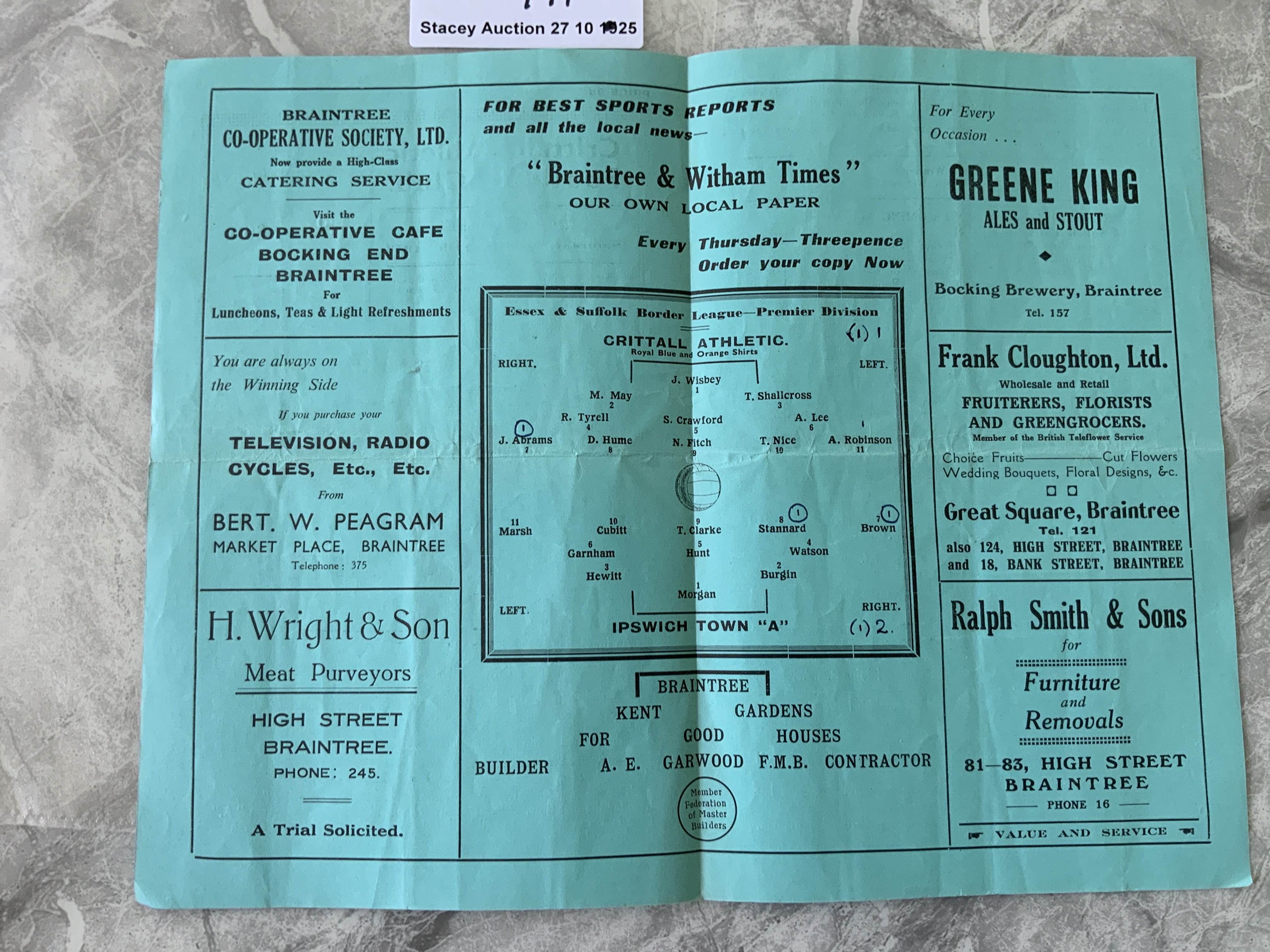 52/53 Crittall v Ipswich Town A Football Programme: Essex + Suffolk Border League match with no team changes dated 11 10 1952. Very good with score and scorers noted.