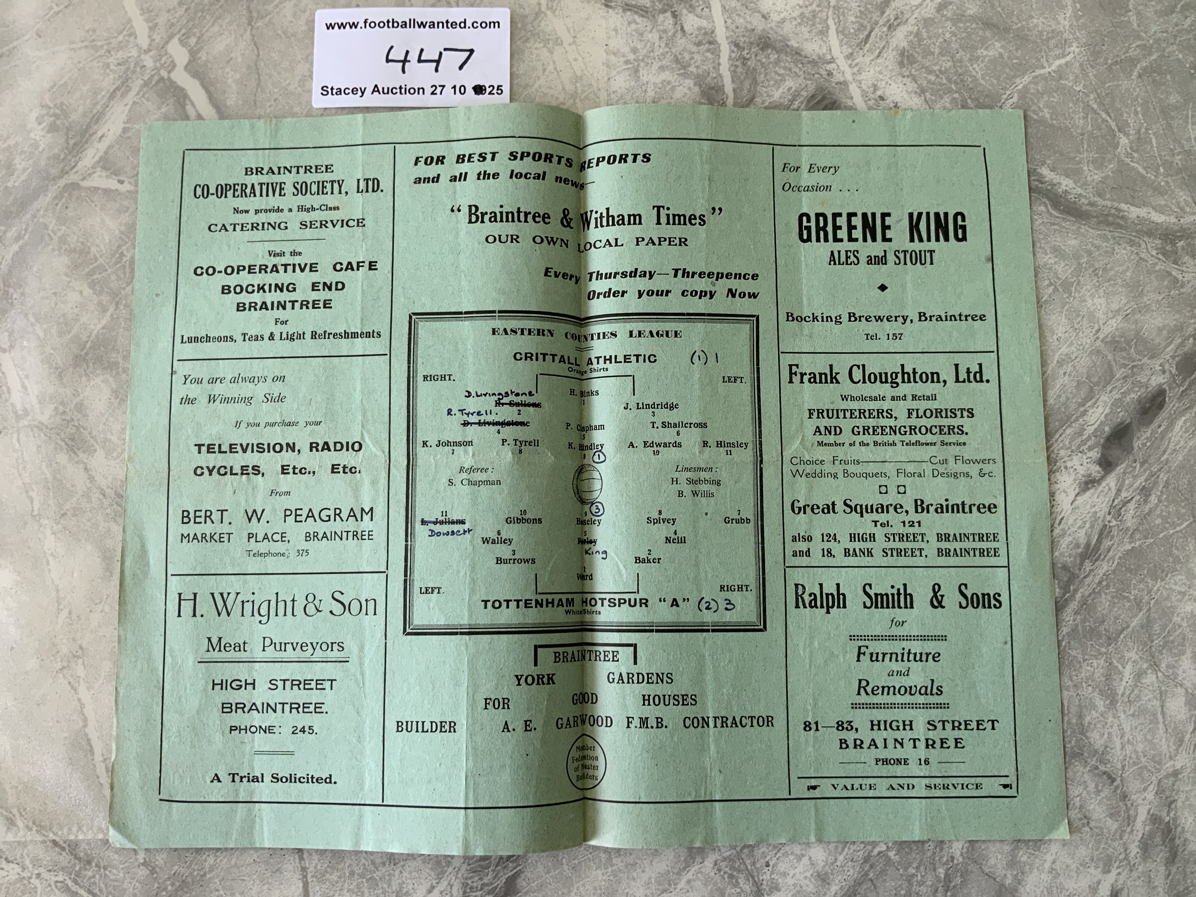 52/53 Crittall v Tottenham A Football Programme: Eastern Counties League match with team changes dated 3 1 1953. Very good with fold.