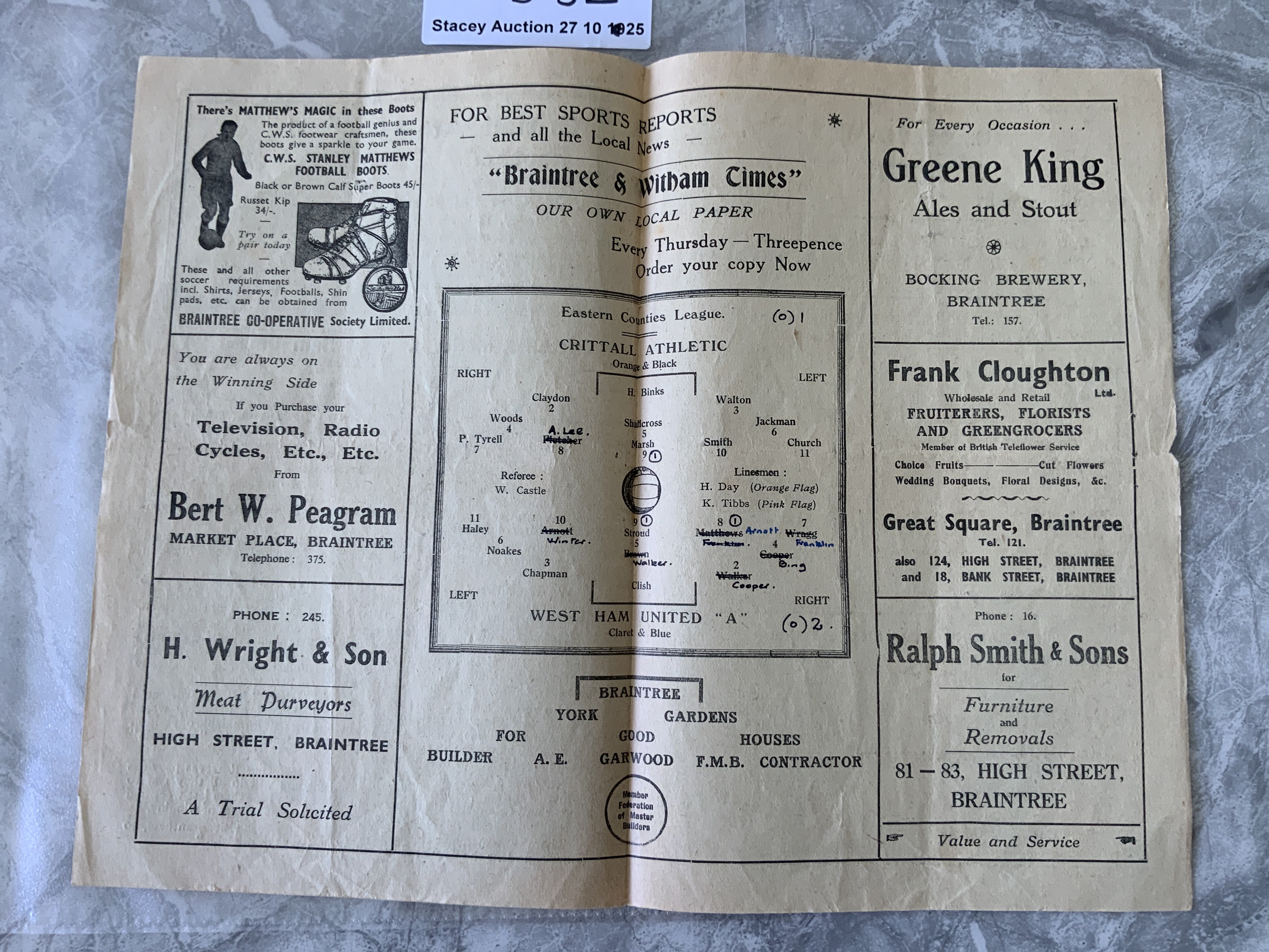 54/55 Crittall v West Ham A Football Programme: Eastern Counties League match with team changes dated 12 3 1955. Very good.