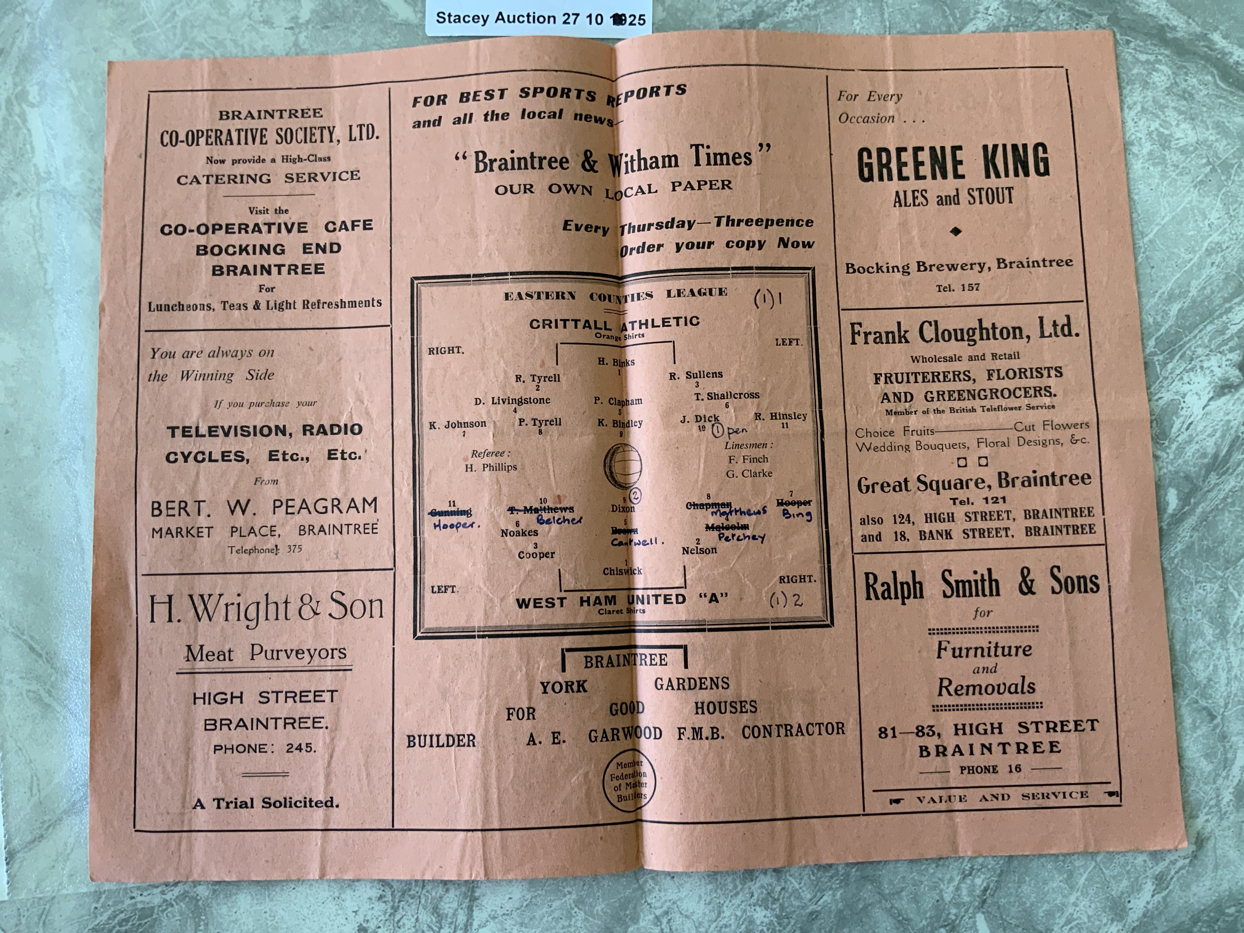 52/53 Crittall v West Ham A Football Programme: Eastern Counties League match with team changes dated 20 12 1952. Very good with folding.