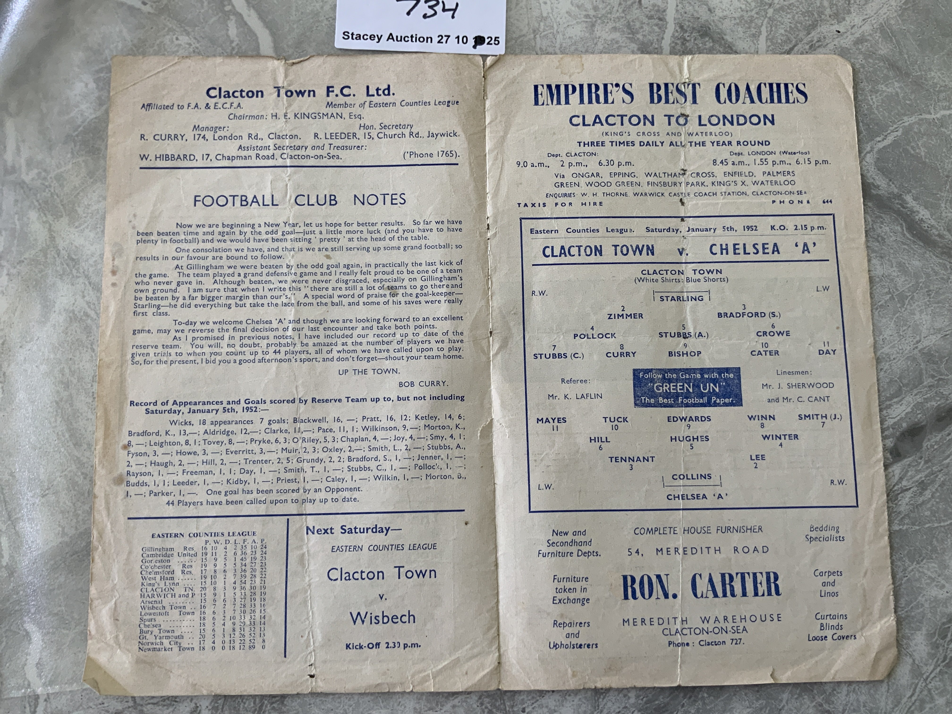 51/52 Clacton Town v Chelsea A Football Programme: Eastern Counties League match with no team changes. Fair condition with folding and wear.