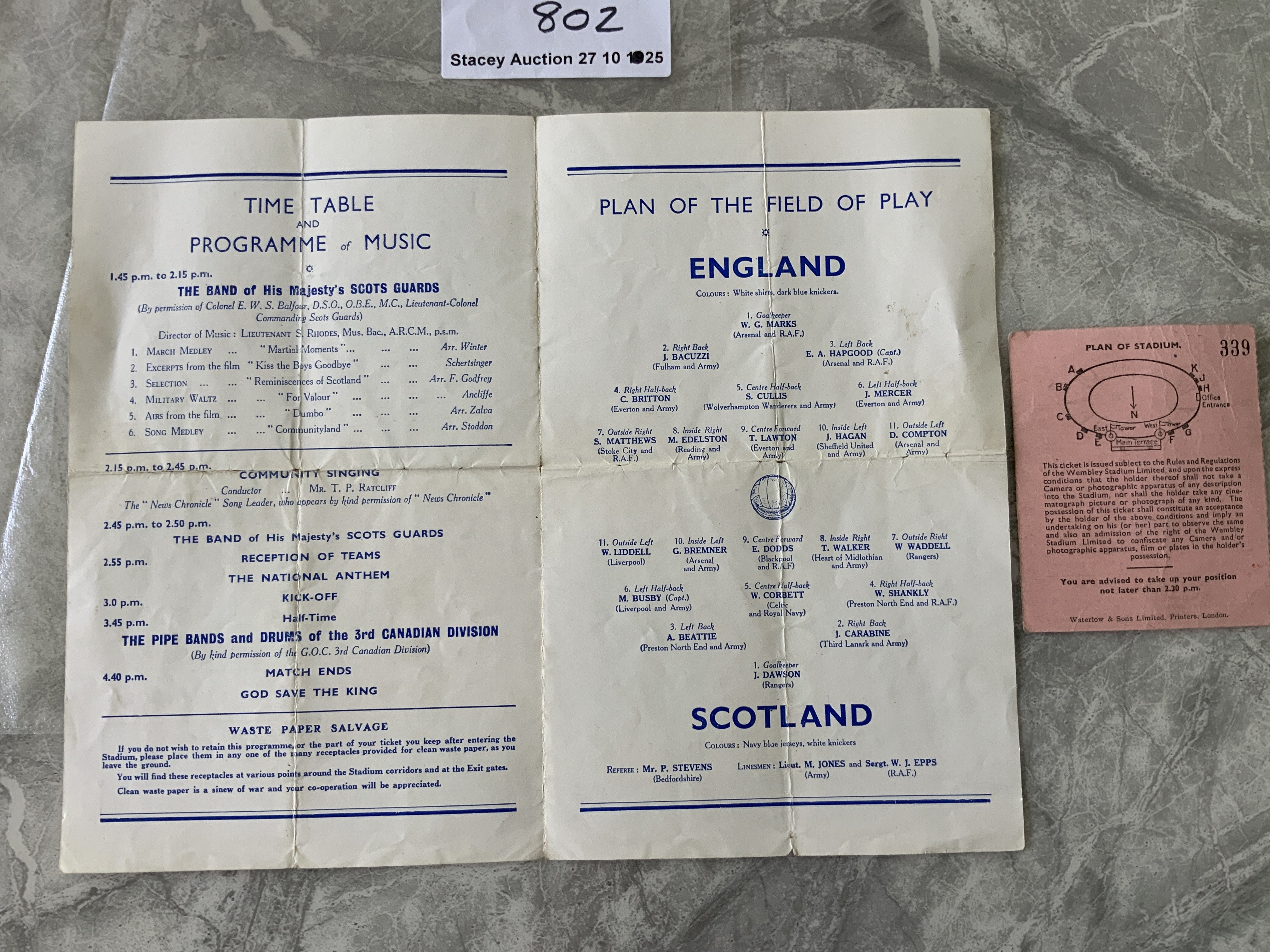 1942 England v Scotland Football Programme + Ticket: Programme for war time International has heavy folding with ticket in good condition with lightly pencilled autograph of Everton and England player C Britton.