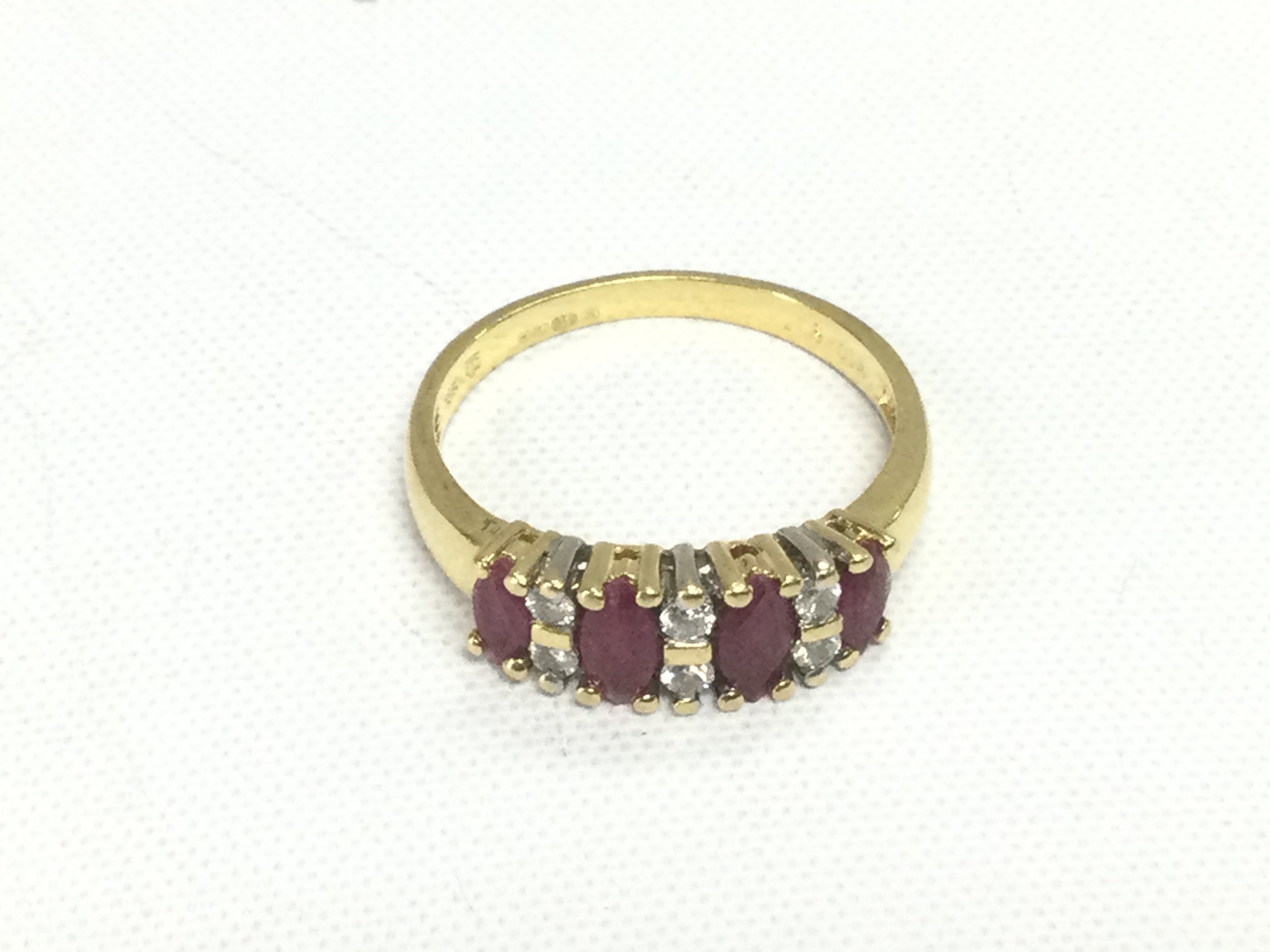 An 18ct gold, ruby and marquise cut diamond ring, approx 3.4g and approx size N-O. Shipping category A.
