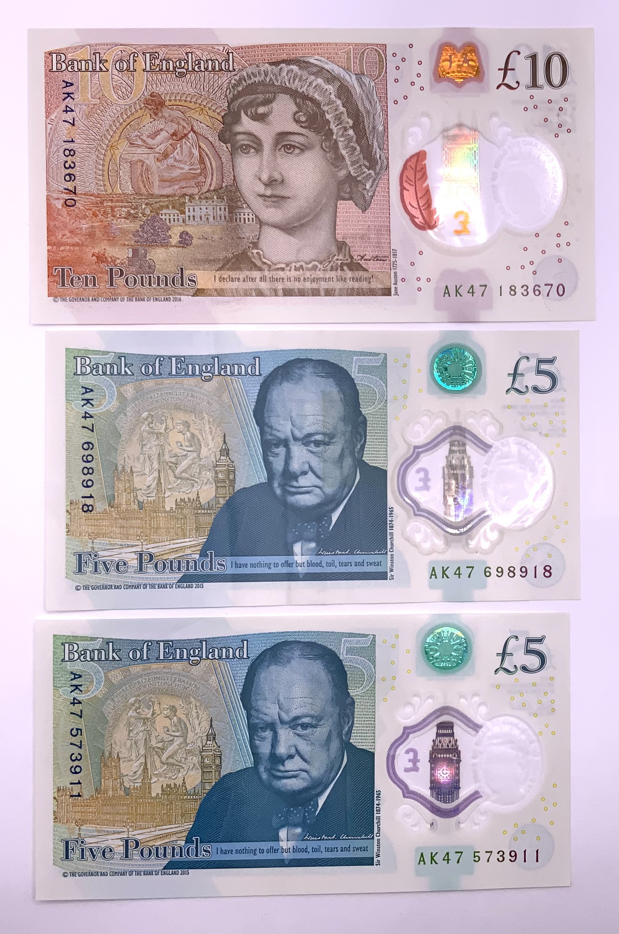 AK47 Serial number 5 note issue AK47573911/ AK47698918 together with 10 note AK47183670 (A)- NO RESERVE