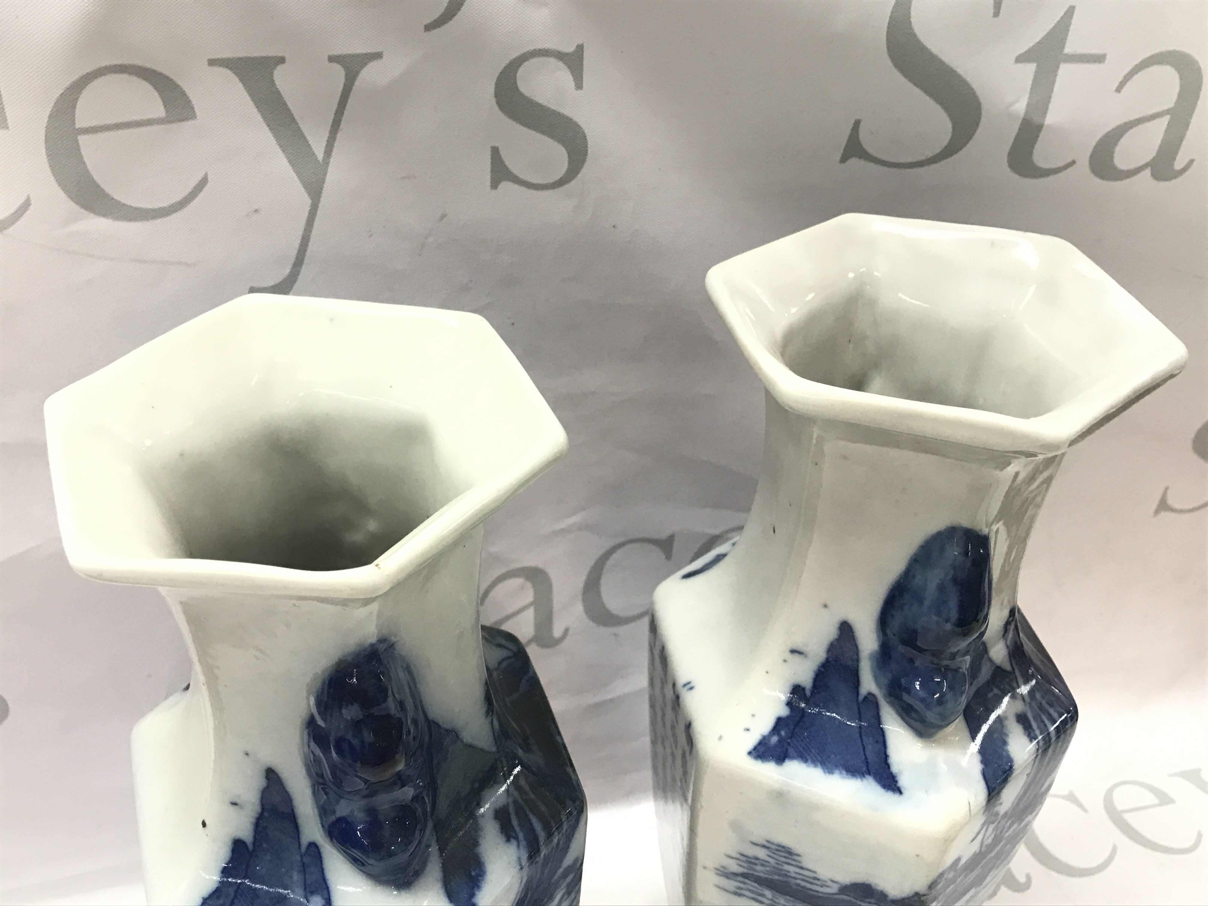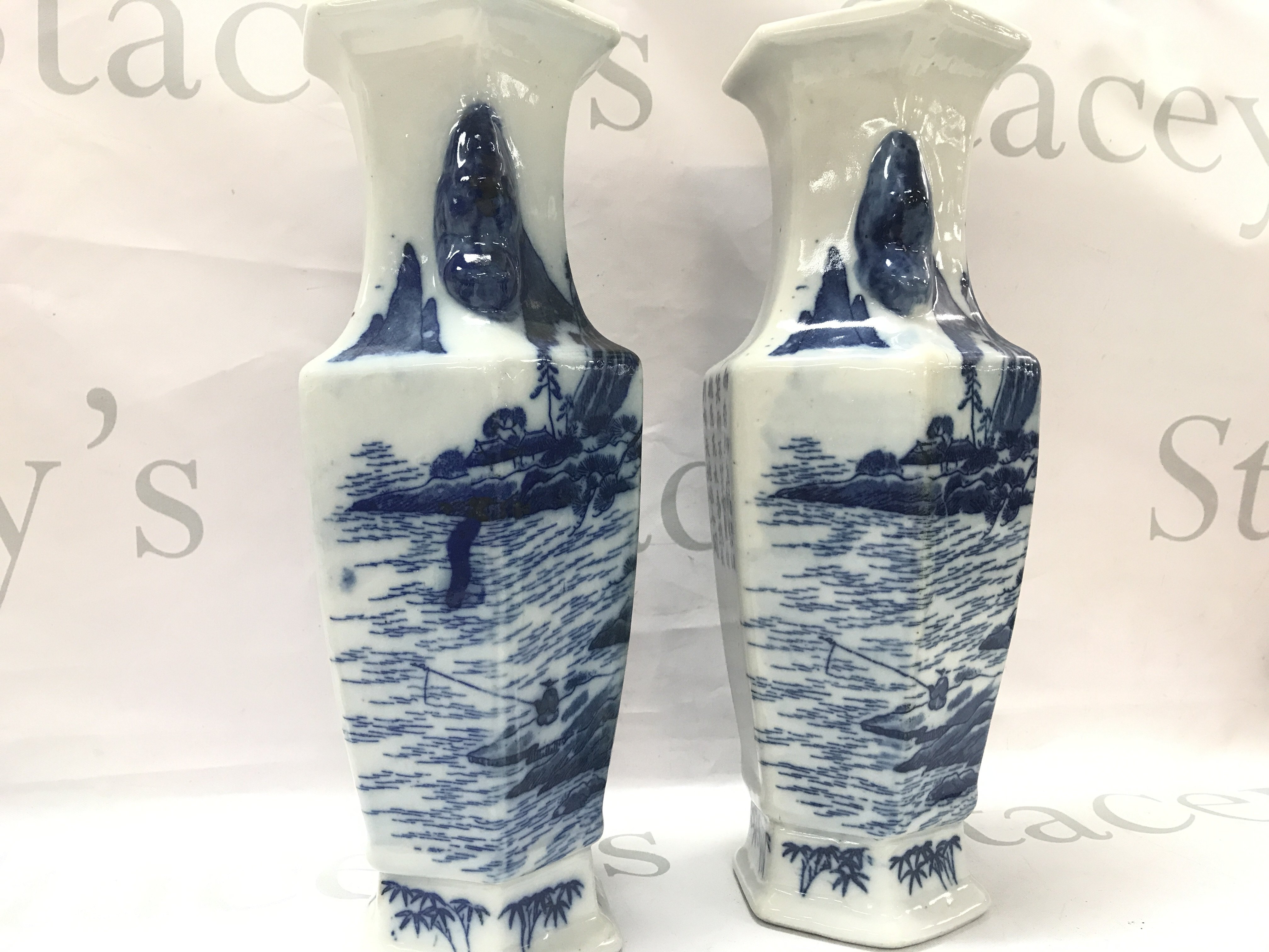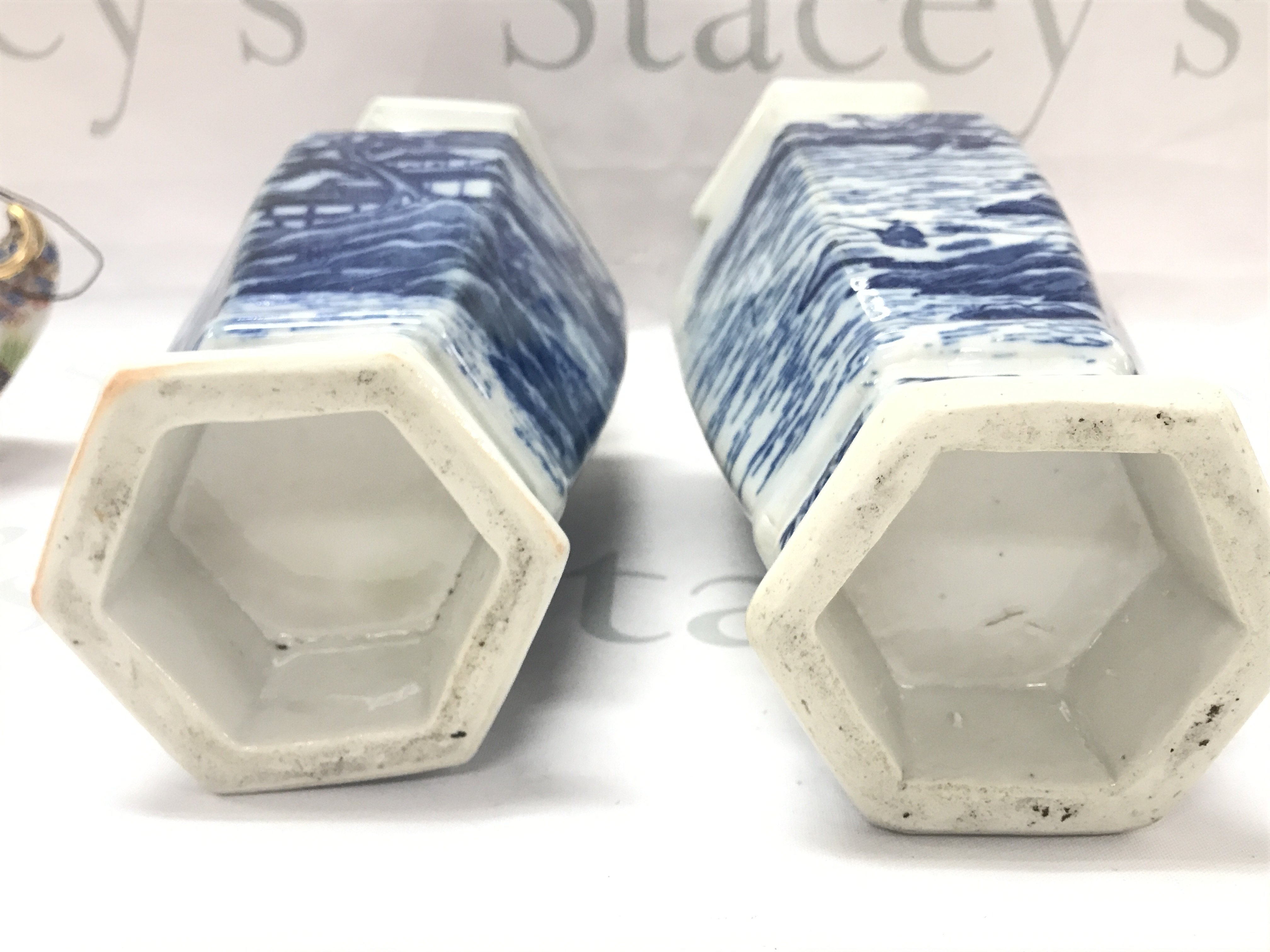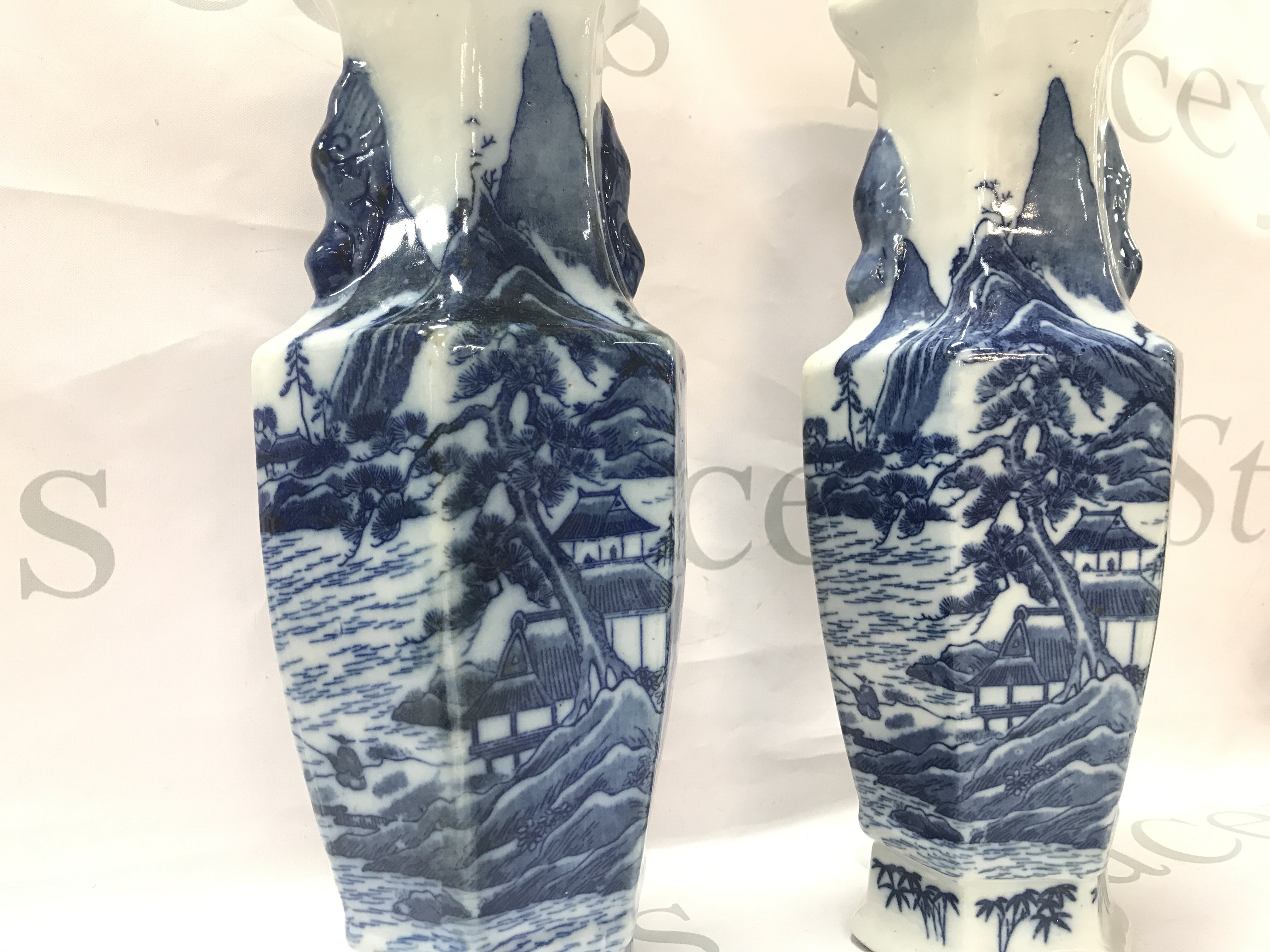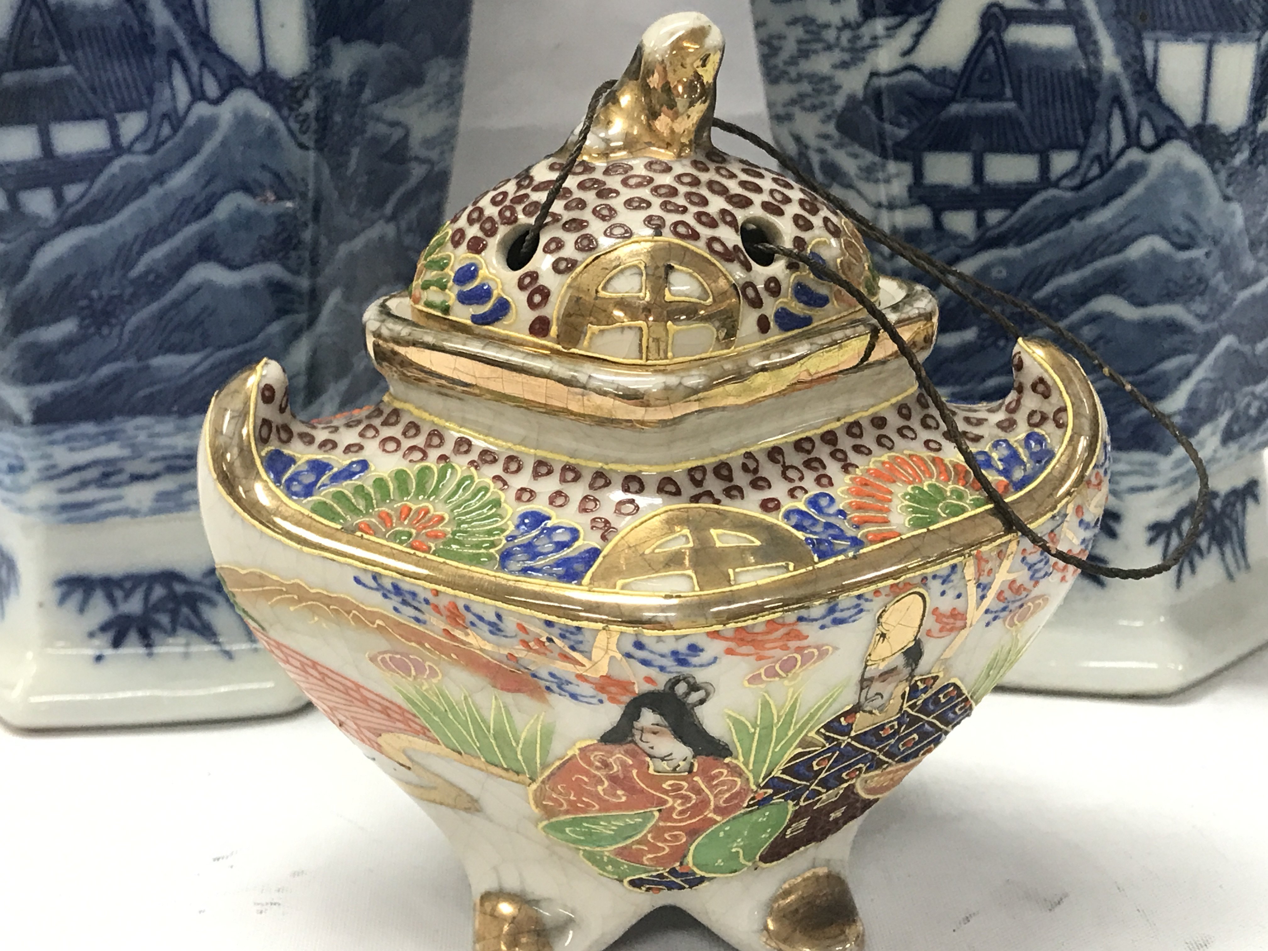 A pair of 20th century Japanese blue and white vases (29cm tall) and an incense burner, this lot cannot be posted