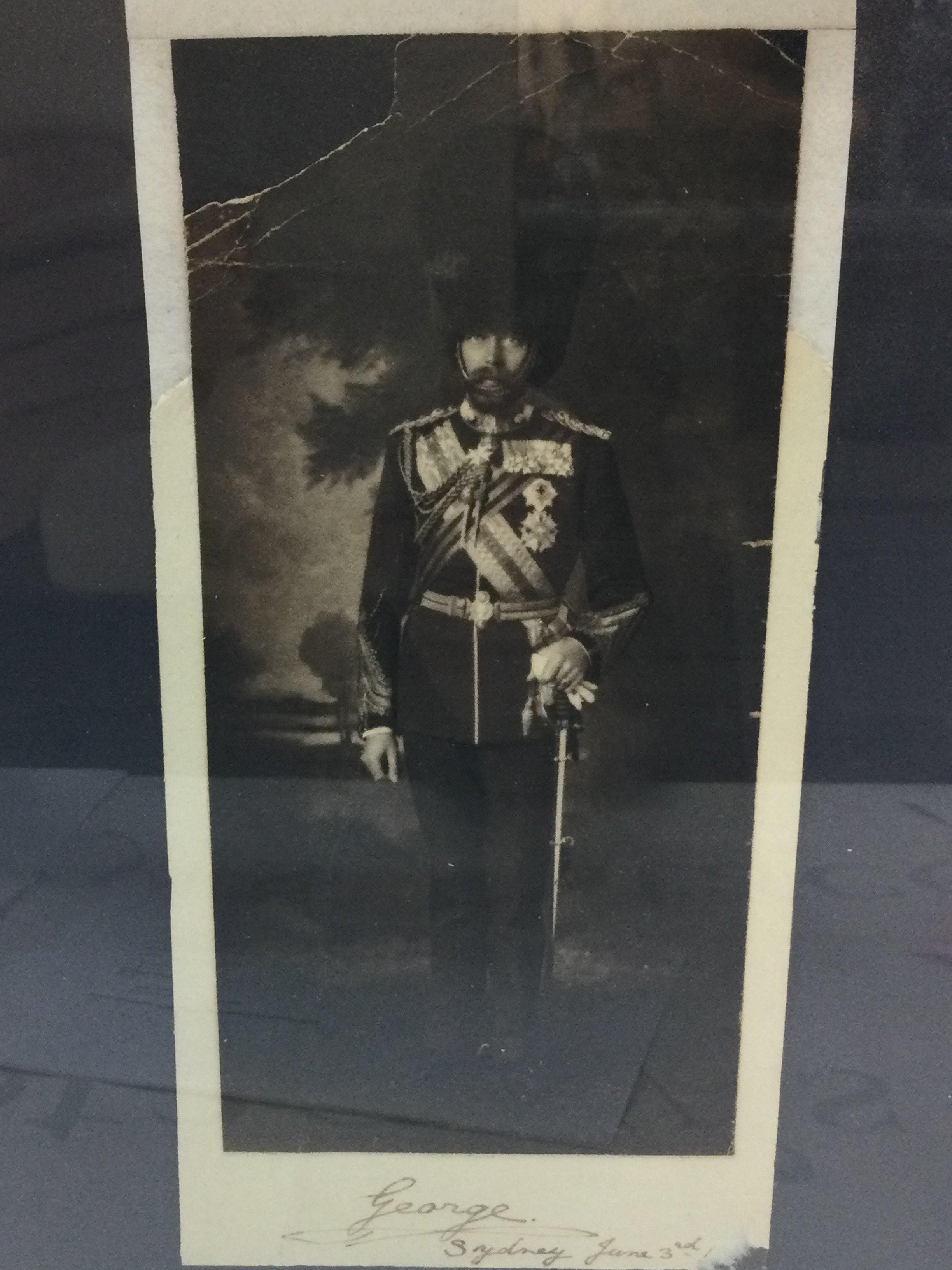 Royal Interest ,a framed signed King George V Photograph in military uniform, inscribed George, Sydney , June 3rd. From the family archive of Lord Stamfordham, Private secretary to Queen Victoria and later King George V . Postage catB
