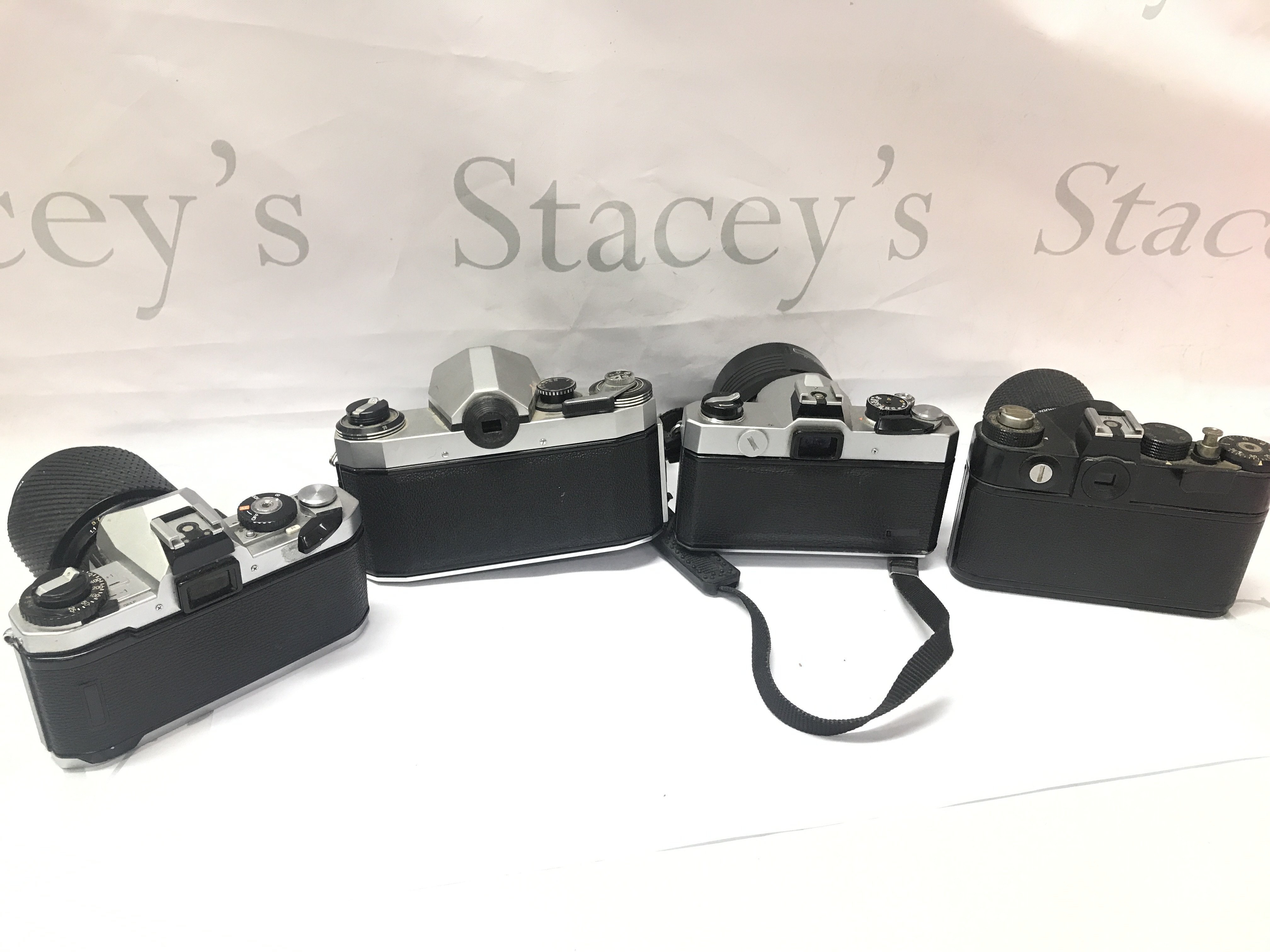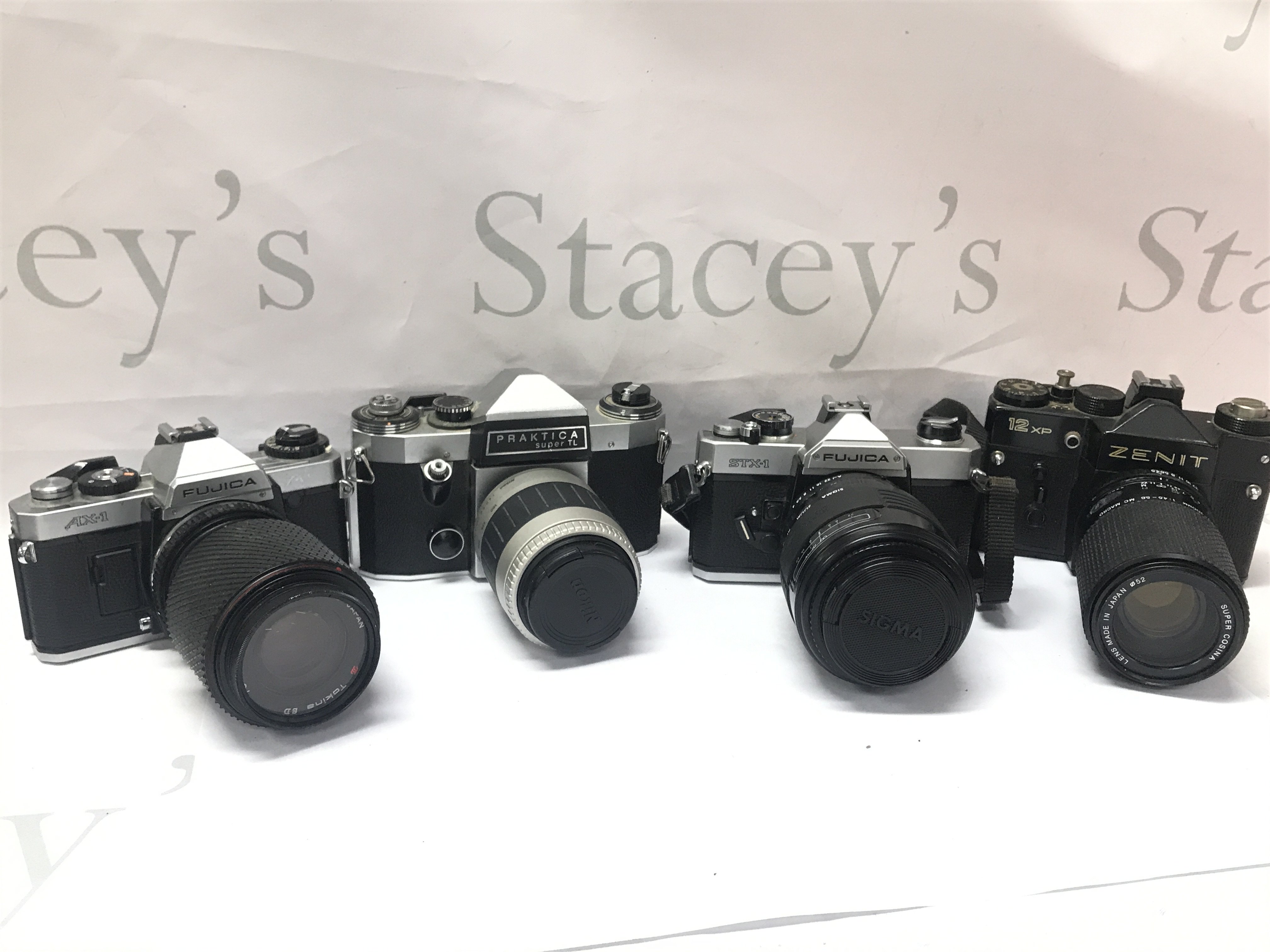 A selection of vintage SLR cameras including Fujica AX1 , Praktica super TL, Zenit 12XP. Postage category C