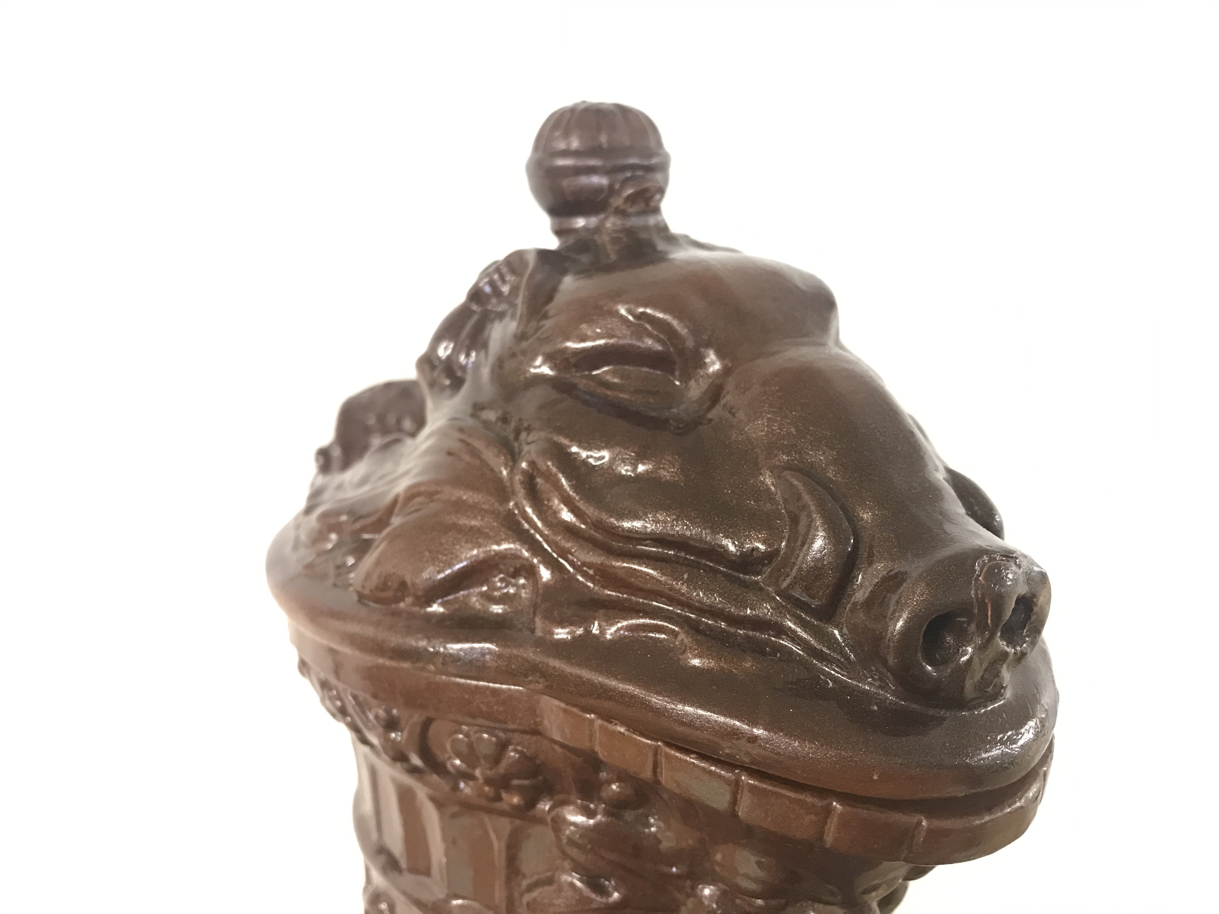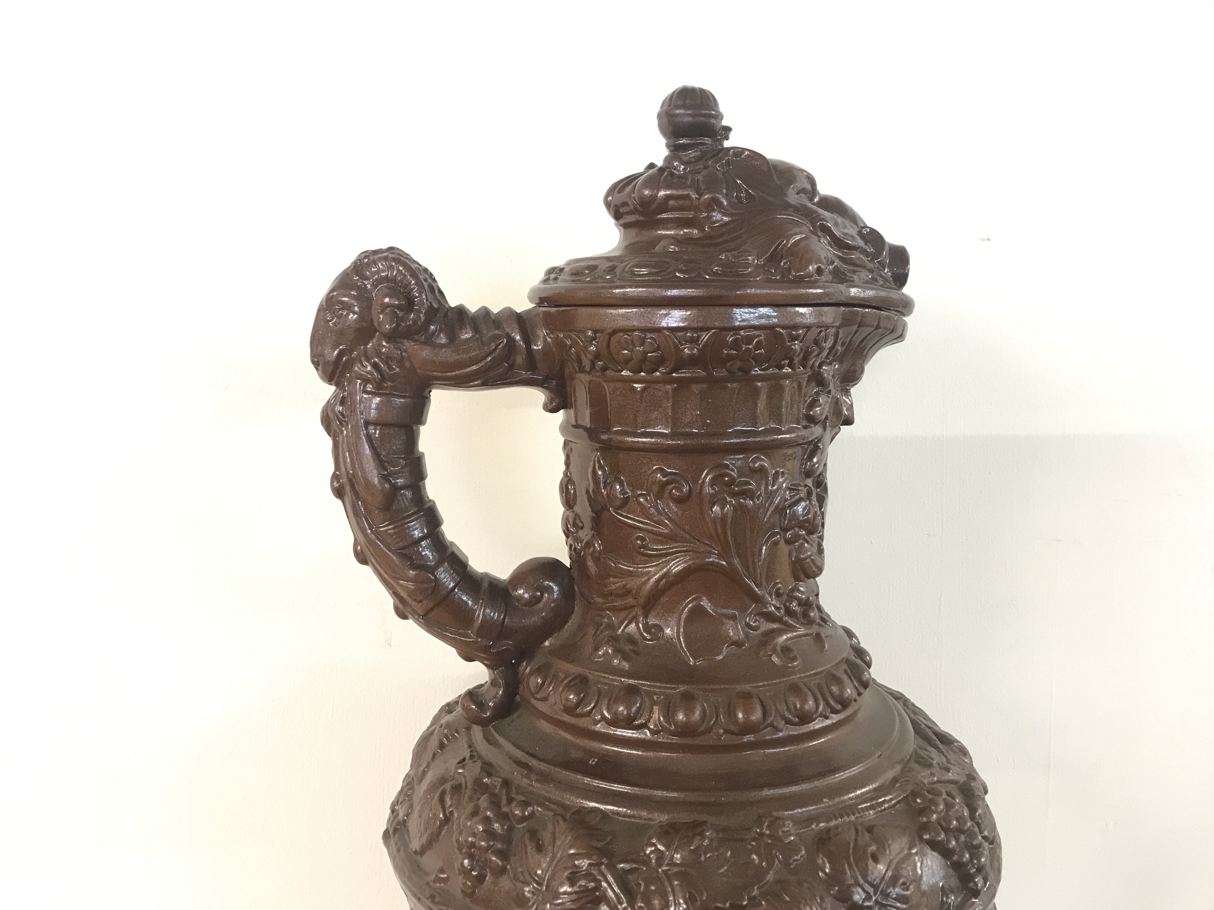 A German pottery ewer, Metilach style decorated with classical style figures and animals. 53cm tall approximately .This lot cannot be posted