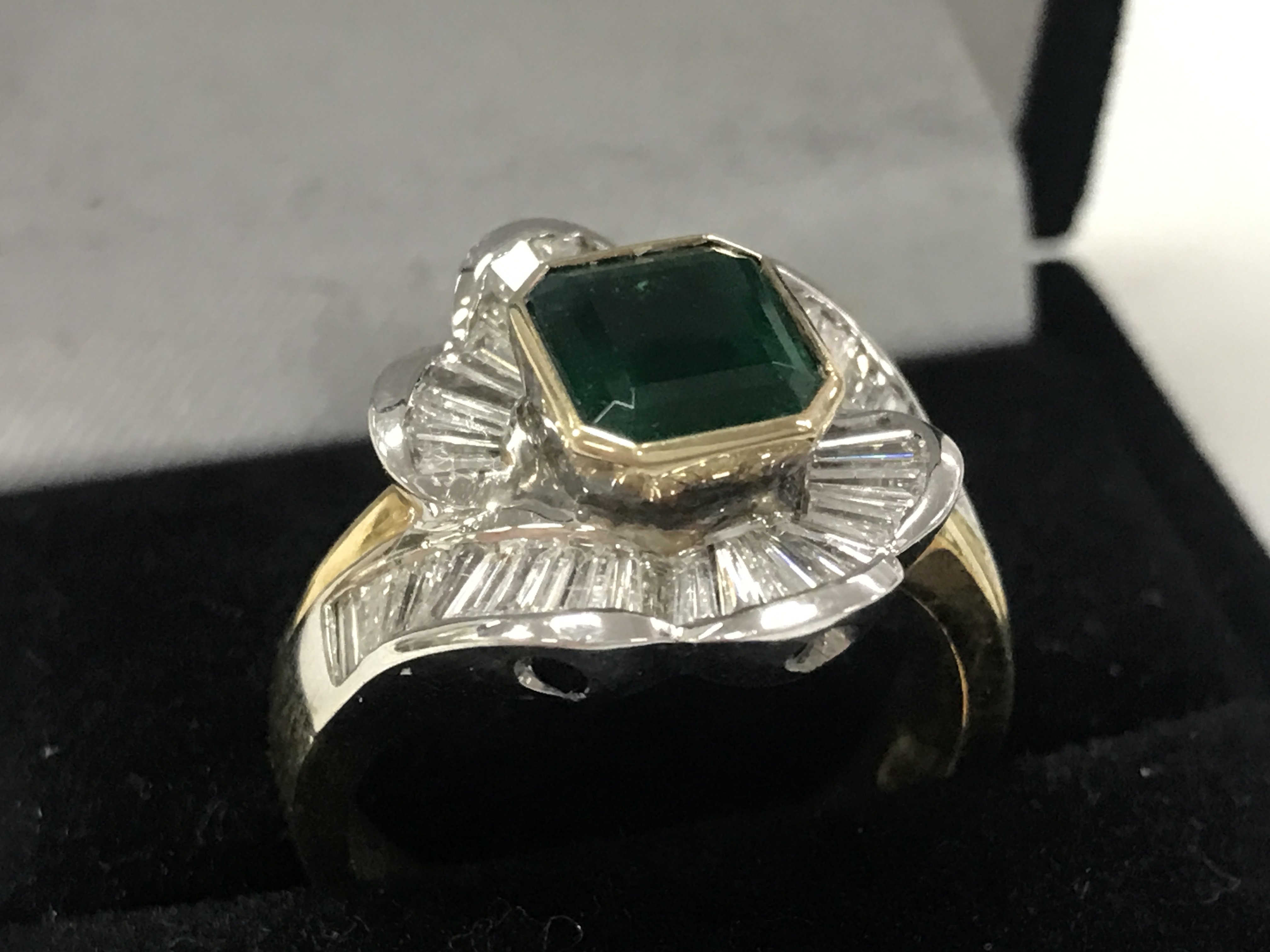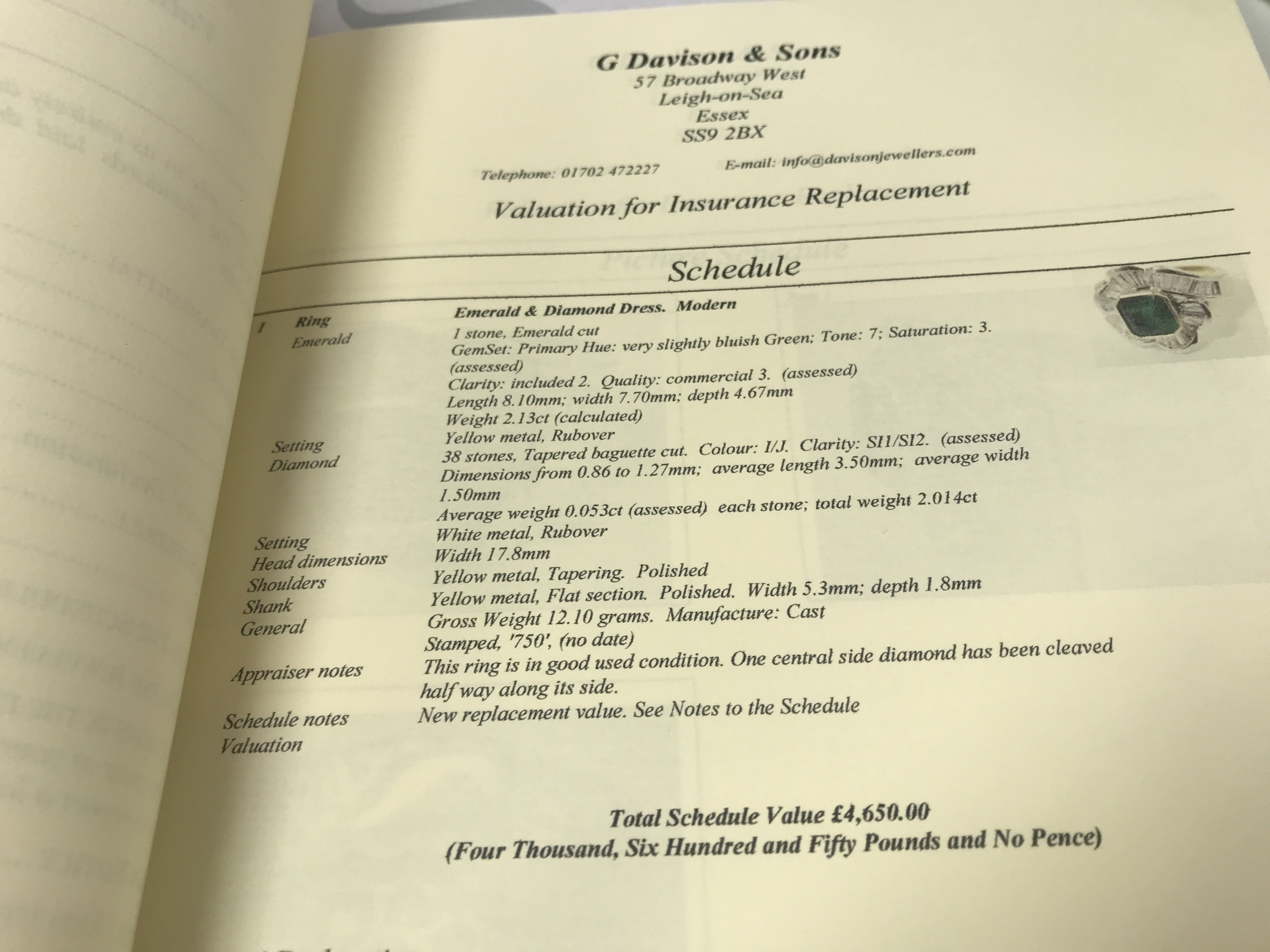An 18ct gold emerald and diamond ring with valuation report. Size S. 12g total weight. postage catA