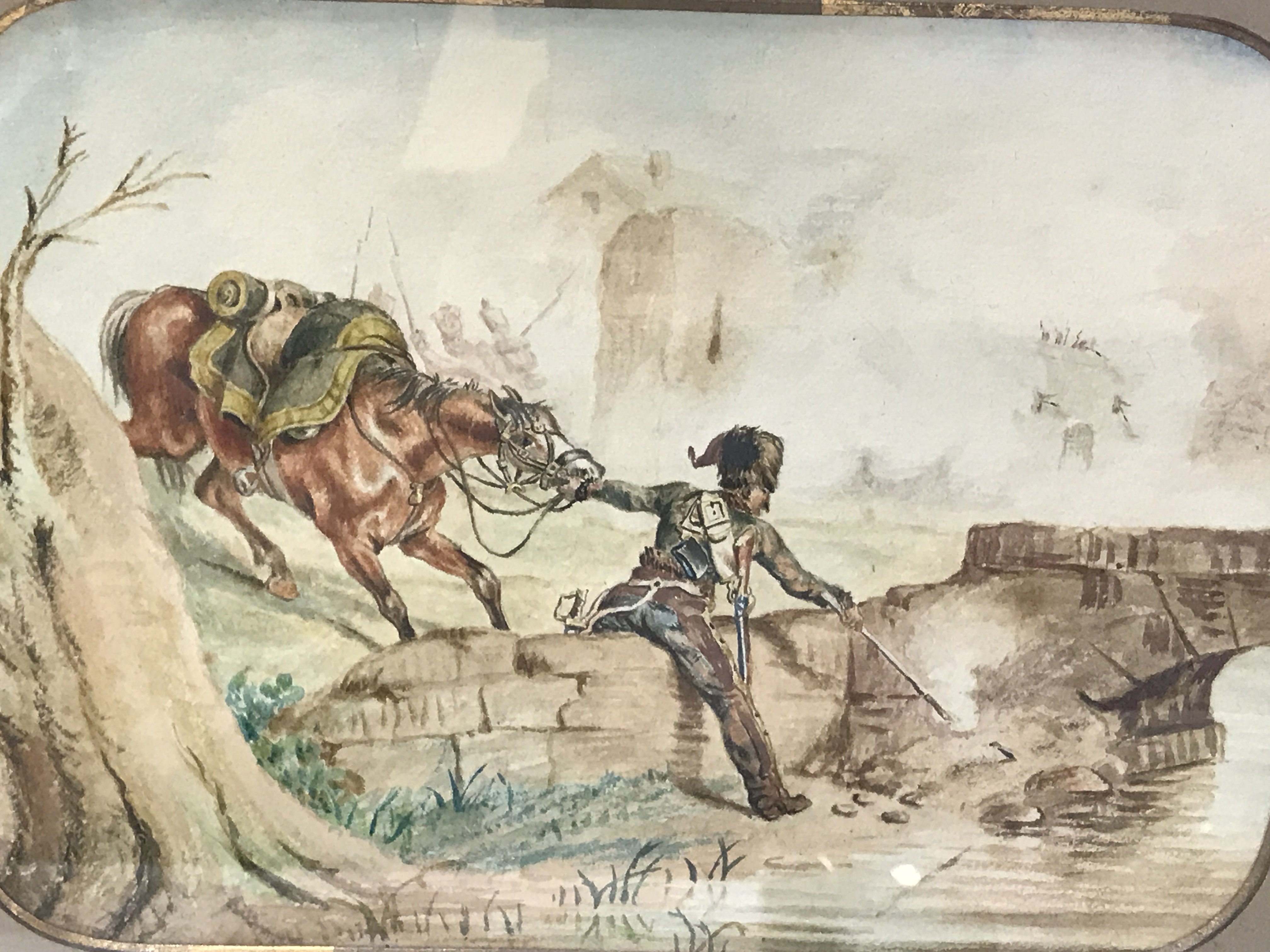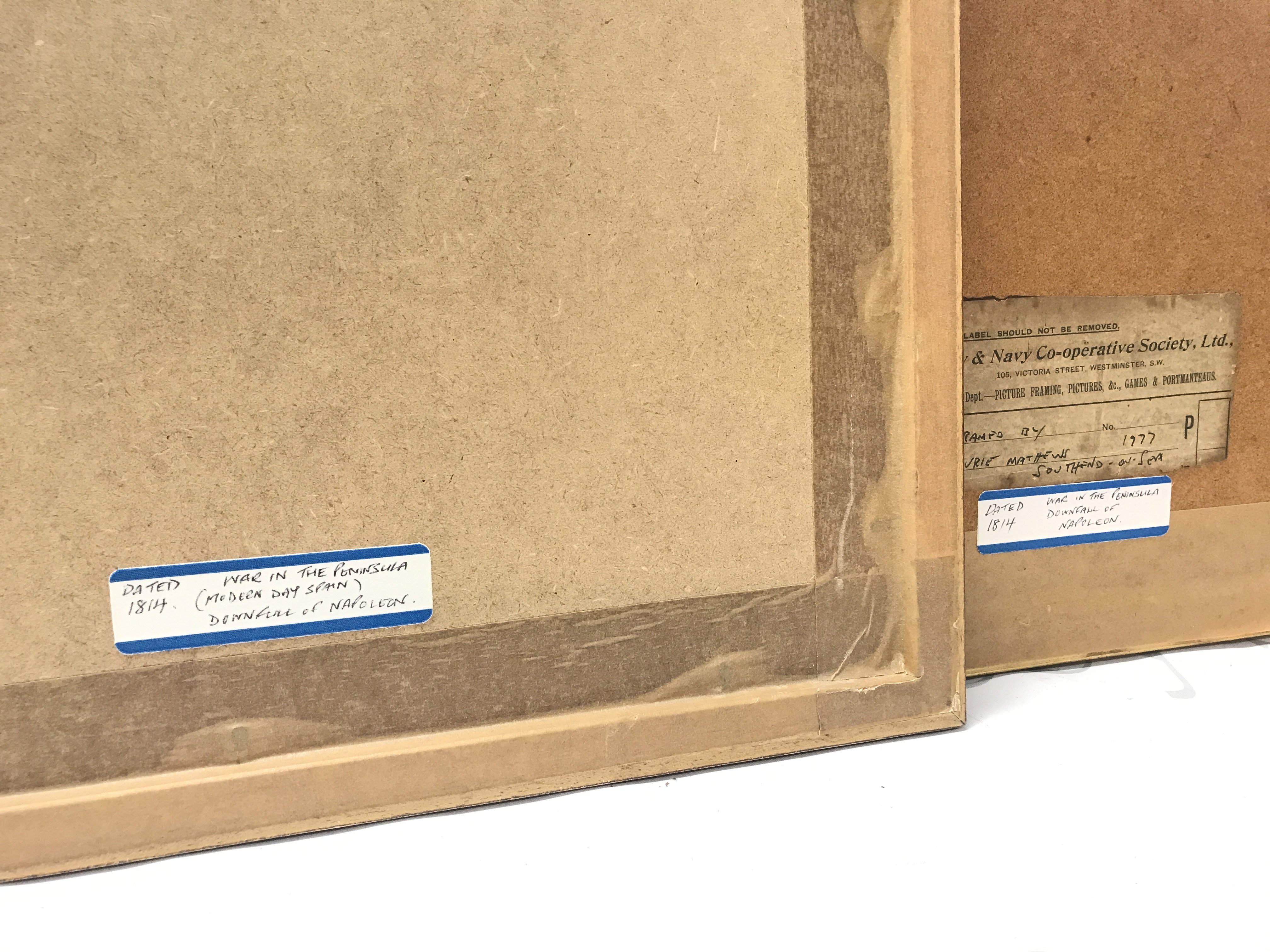 Two 19th century Napoleonic watercolour paintings, War in the Peninsula the downfall of Napoleon. Frame dimensions 41x37cm . This lot cannot be posted