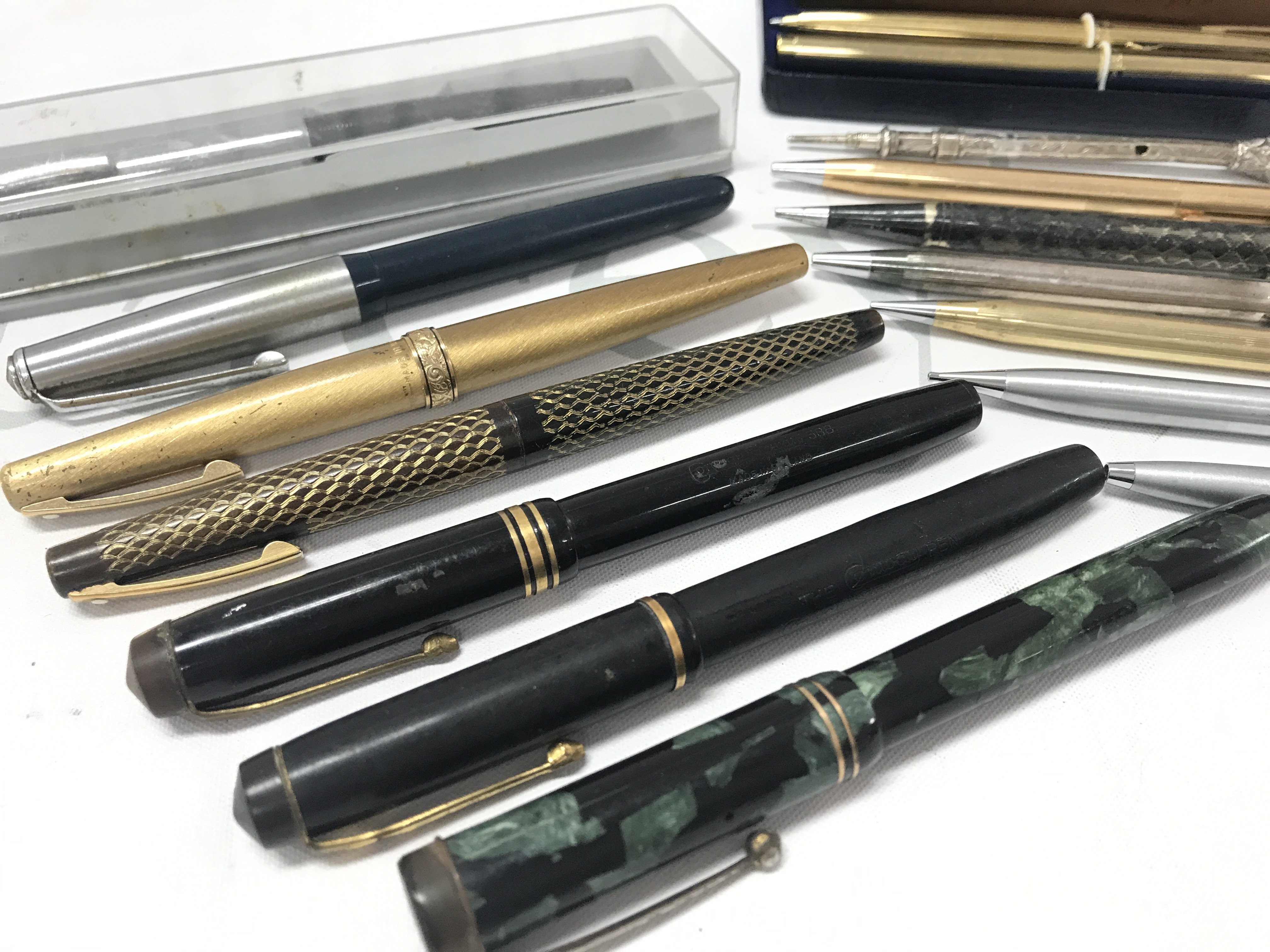 A Collection of fountain pens and pencils including 14ct gold tipped examples. Postage category B