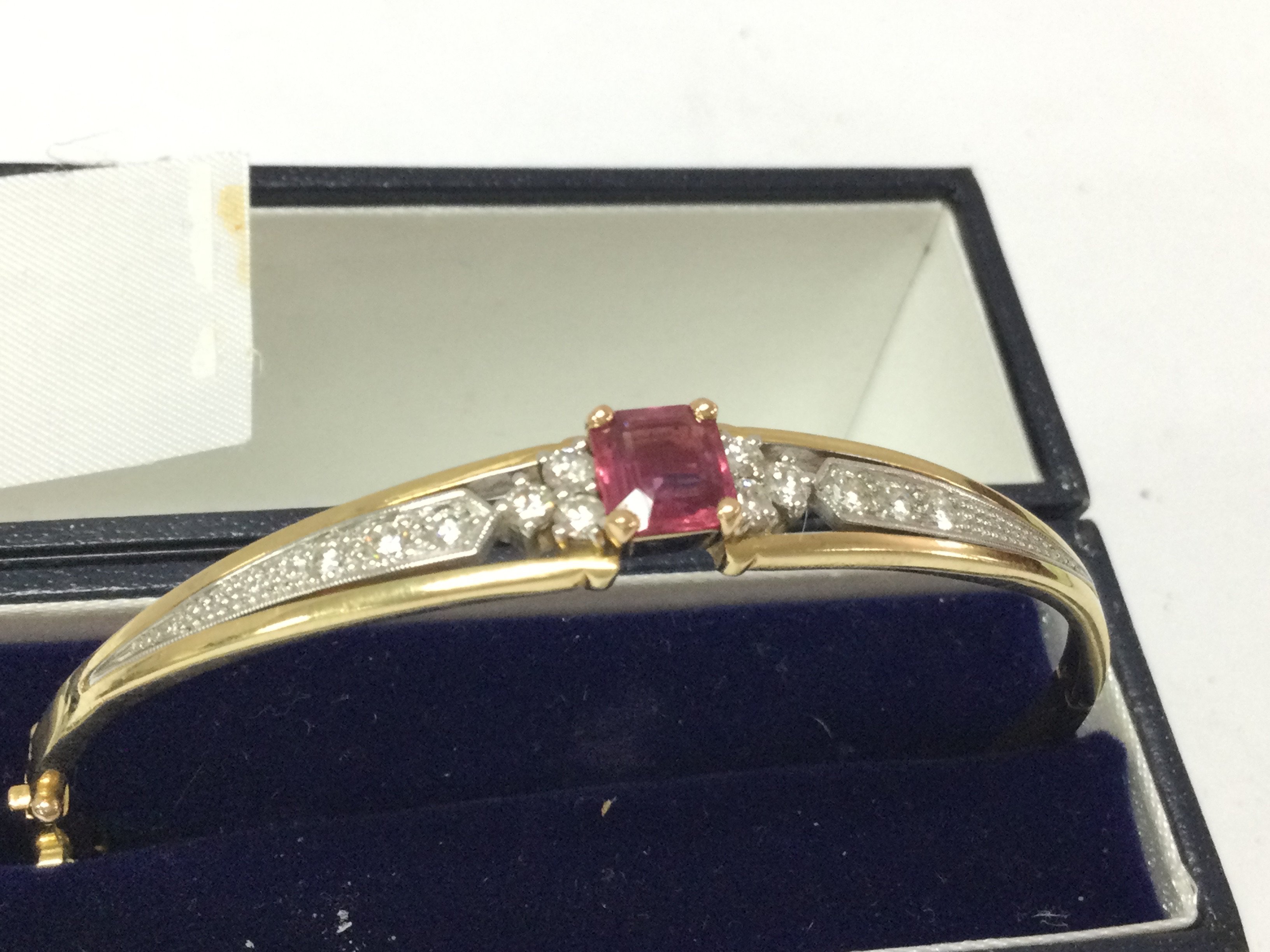 An 18ct gold ruby and diamond bracelet. 19.01g and approximately 6.5cm diameter. Postage B