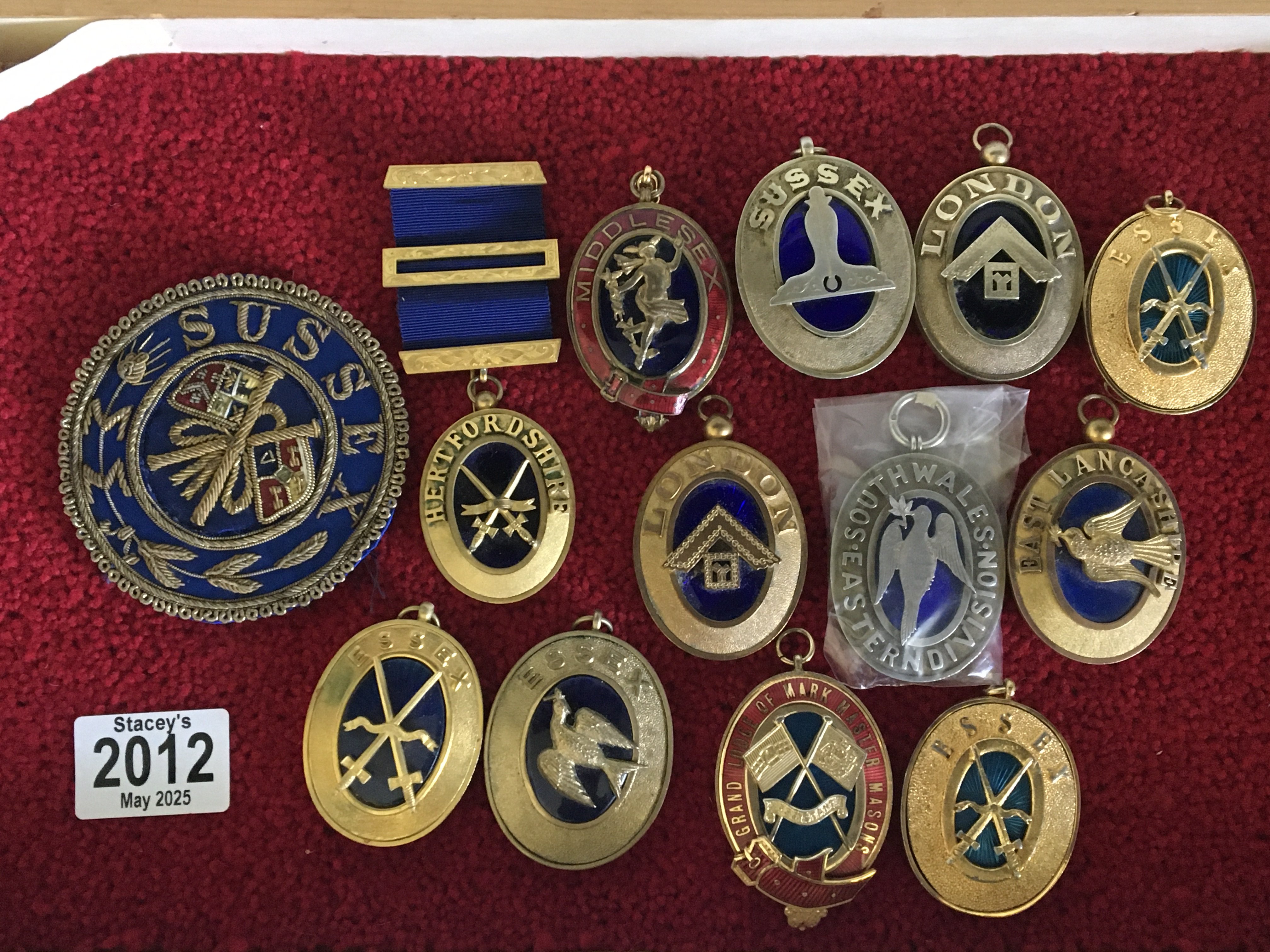 A collection of Masonic Regalia gilt metal Past Masters London and Counties oval collar Jewels and an embroidered Sussex badge- NO RESERVE