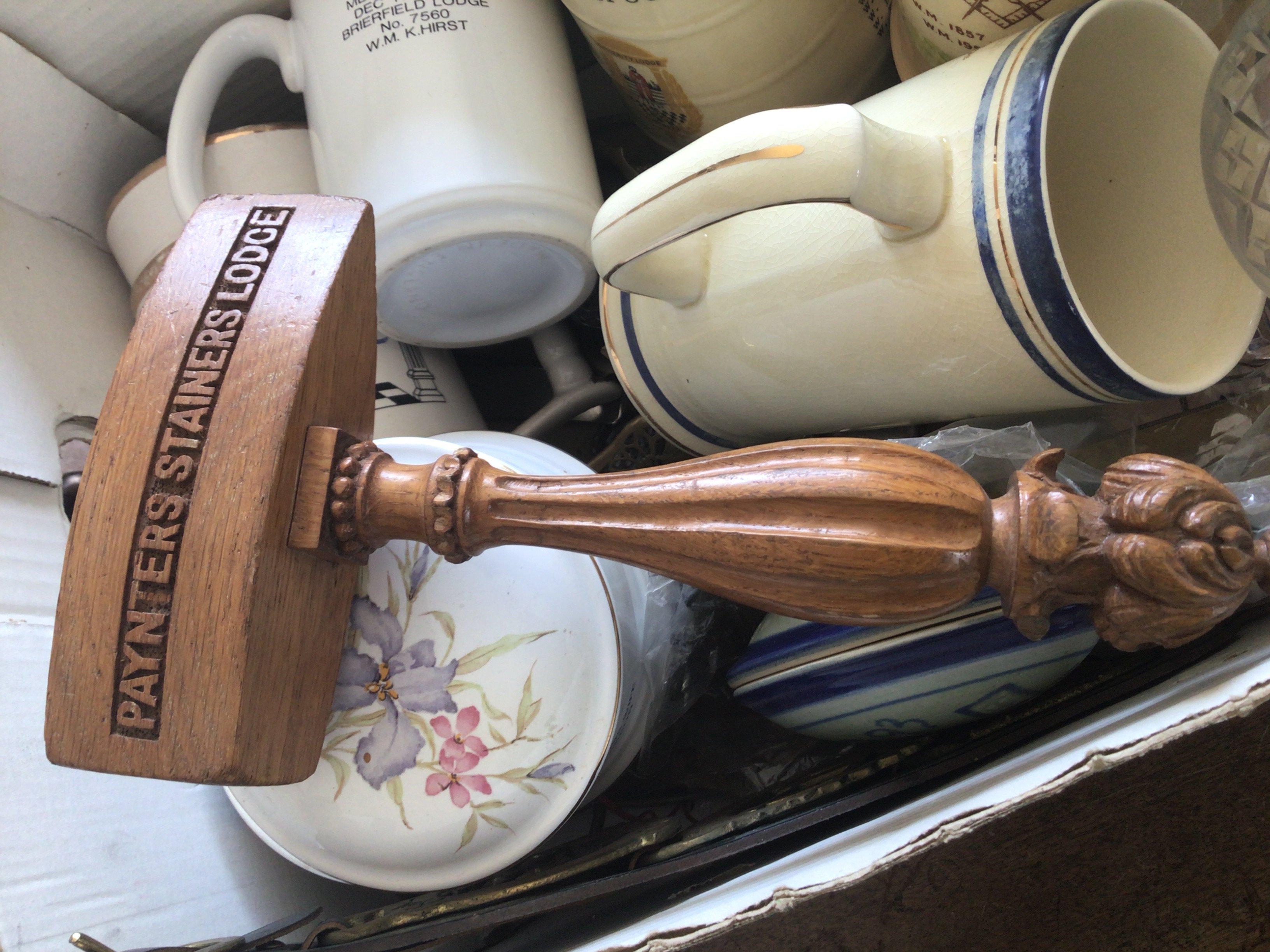 A box containing Masonic mugs and a carved wood gavel Paynters Stainers Lodge- NO RESERVE